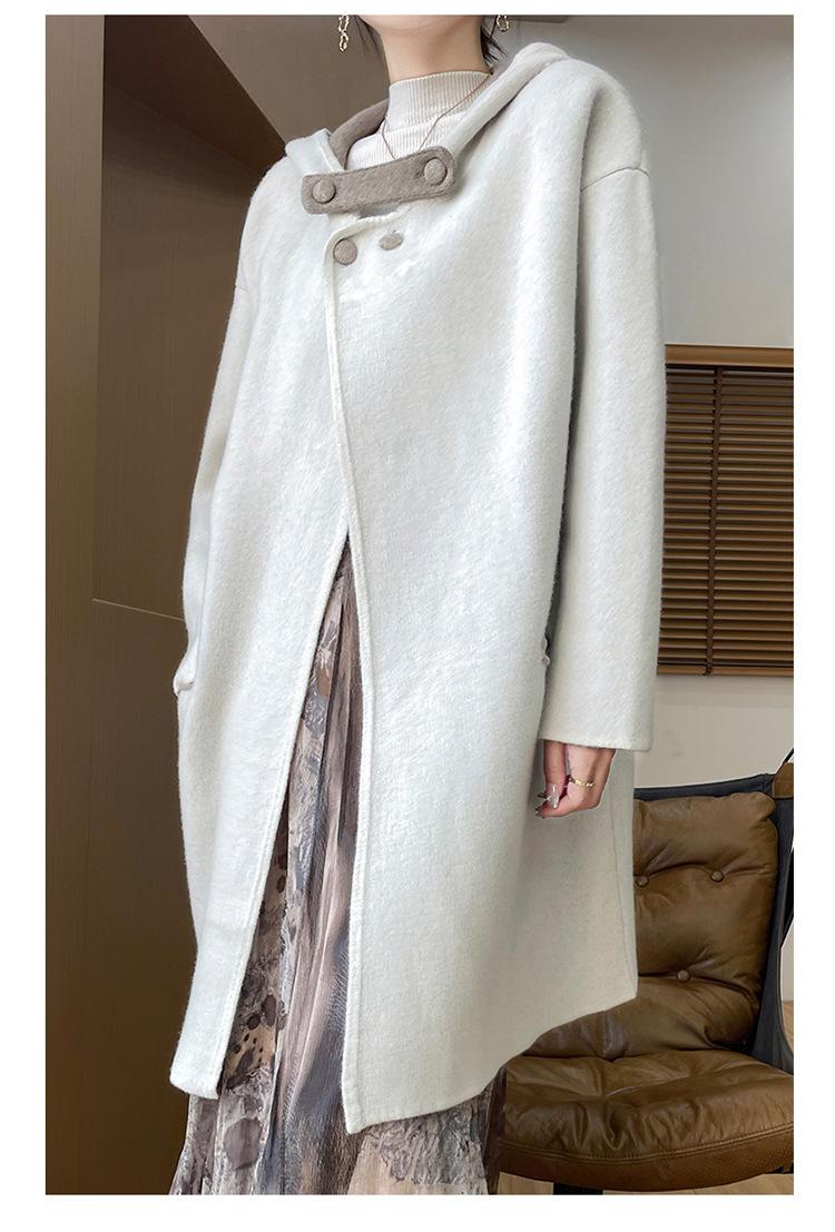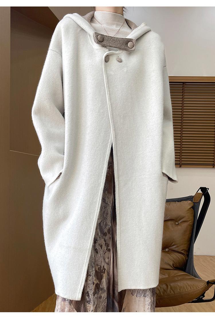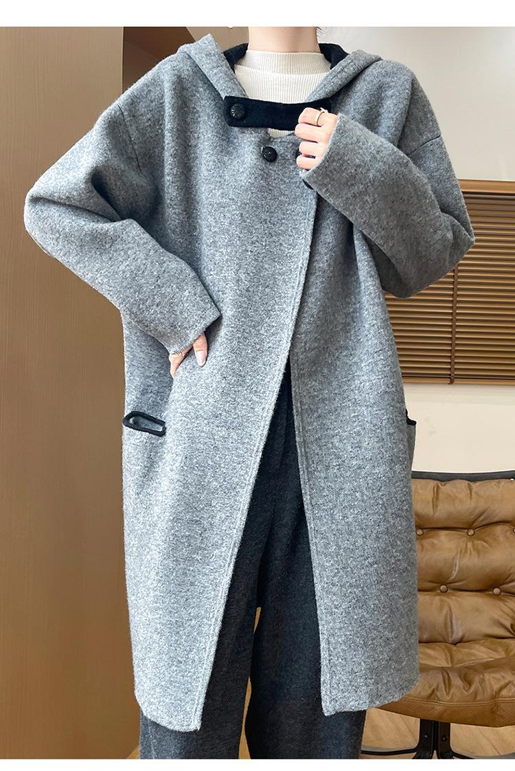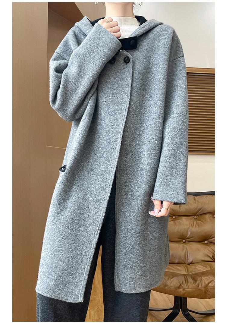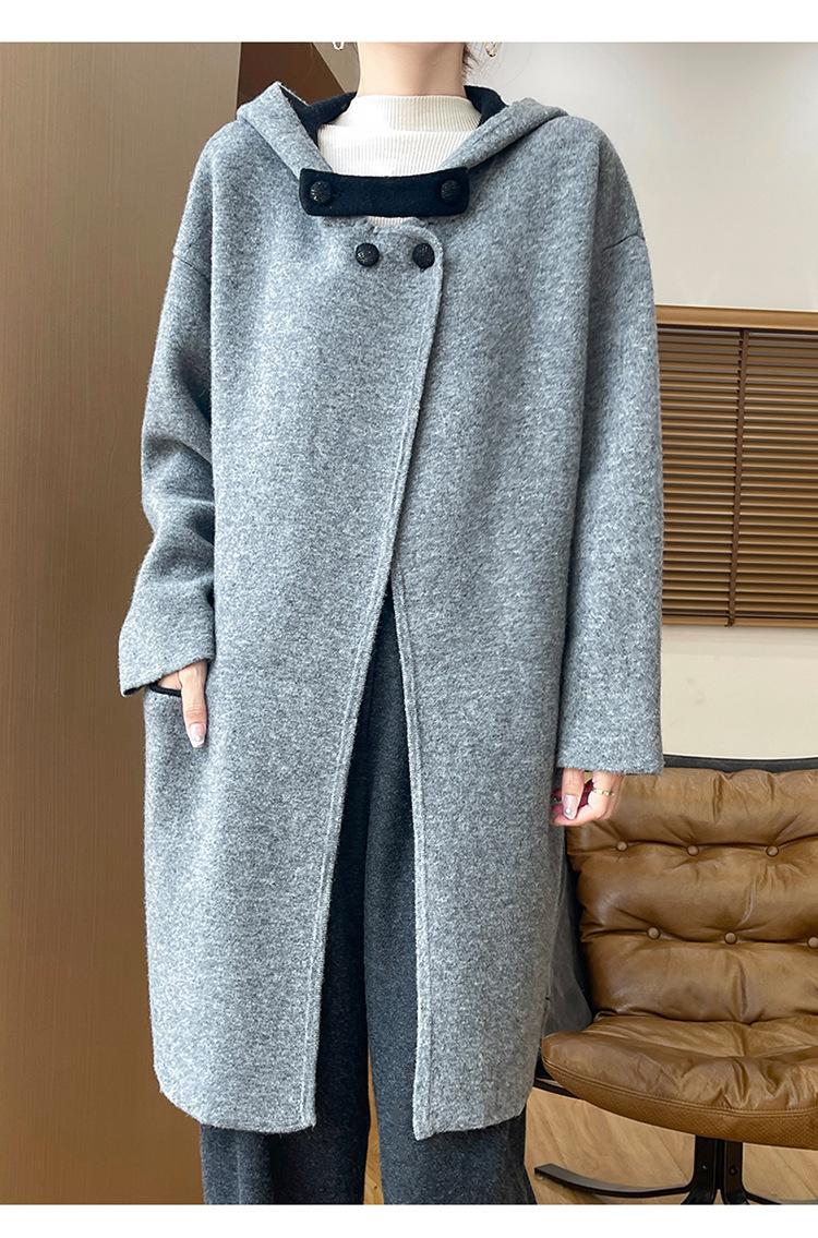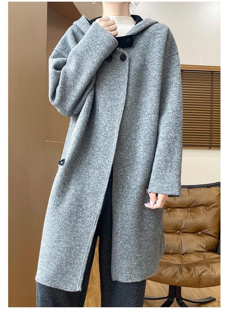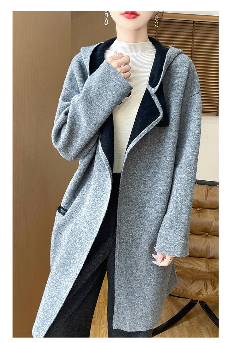 2025 Nuevo Otoño e Invierno Abrigo de Lana de Doble Cara para Mujer de Largo Medio con Capucha Moderno Suelto de Lana