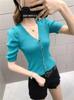 Nuevo cárdigan de punto de seda helada con mangas abullonadas para mujer, top informal de verano 2024, ajustado, de manga corta y cuello en V.