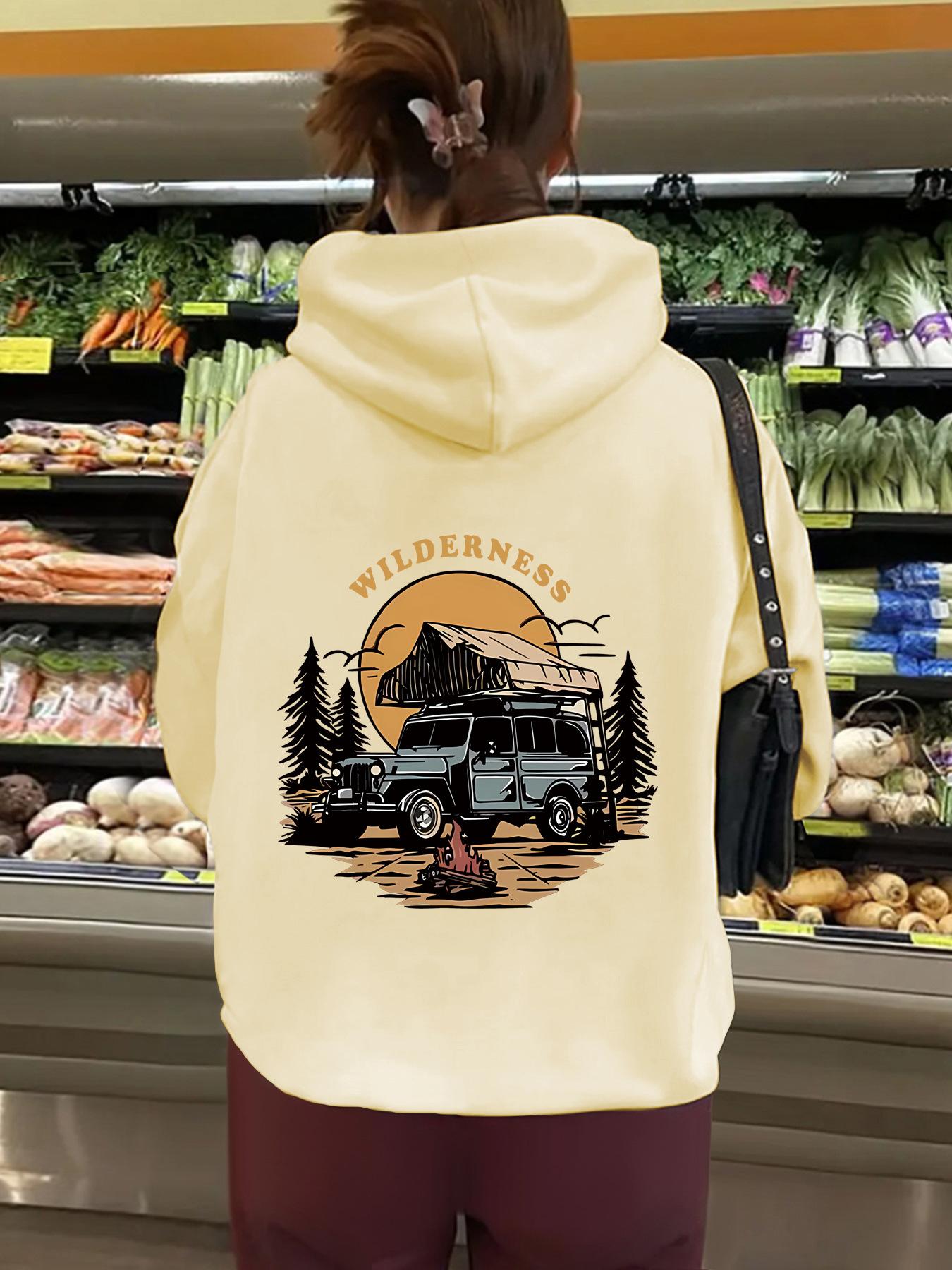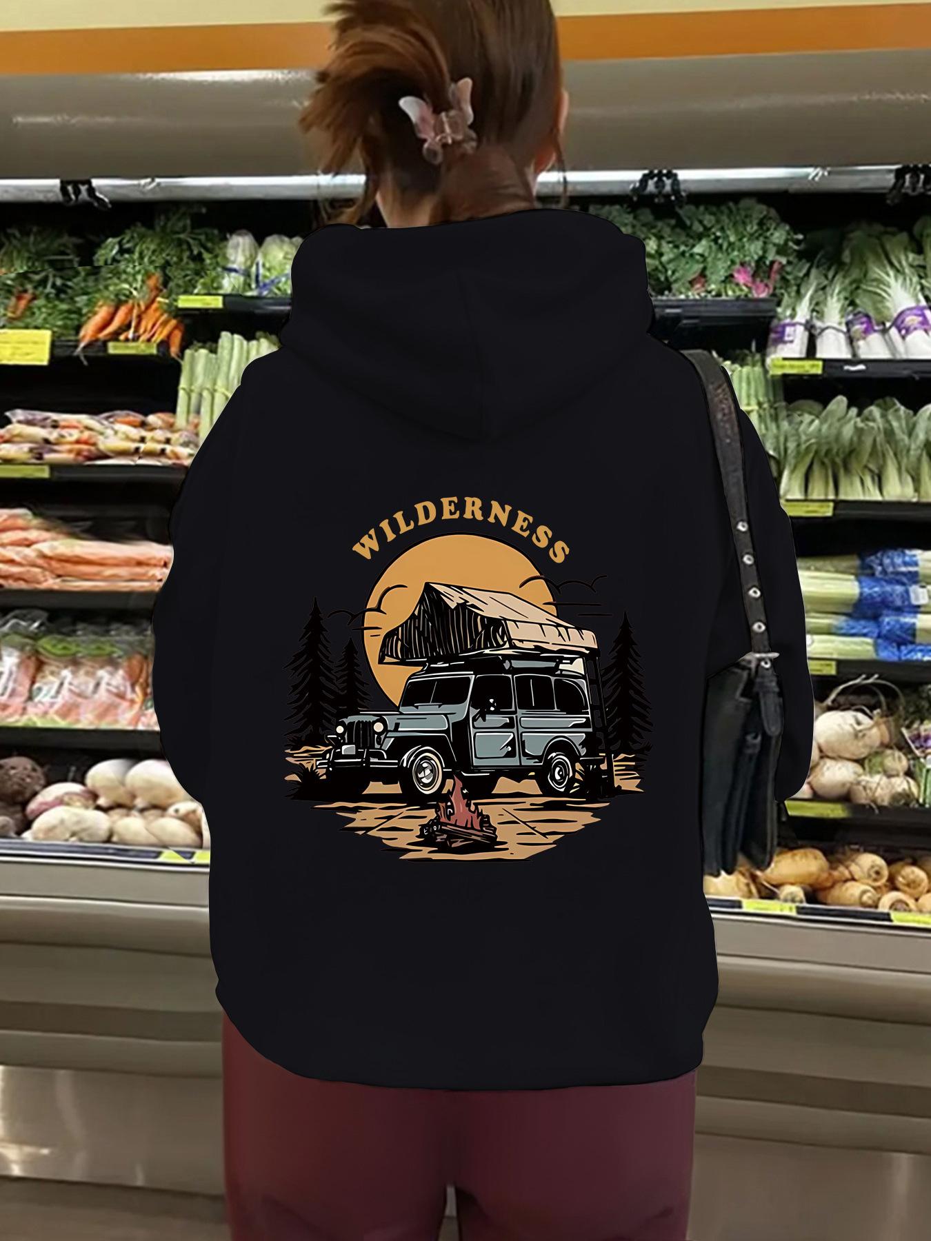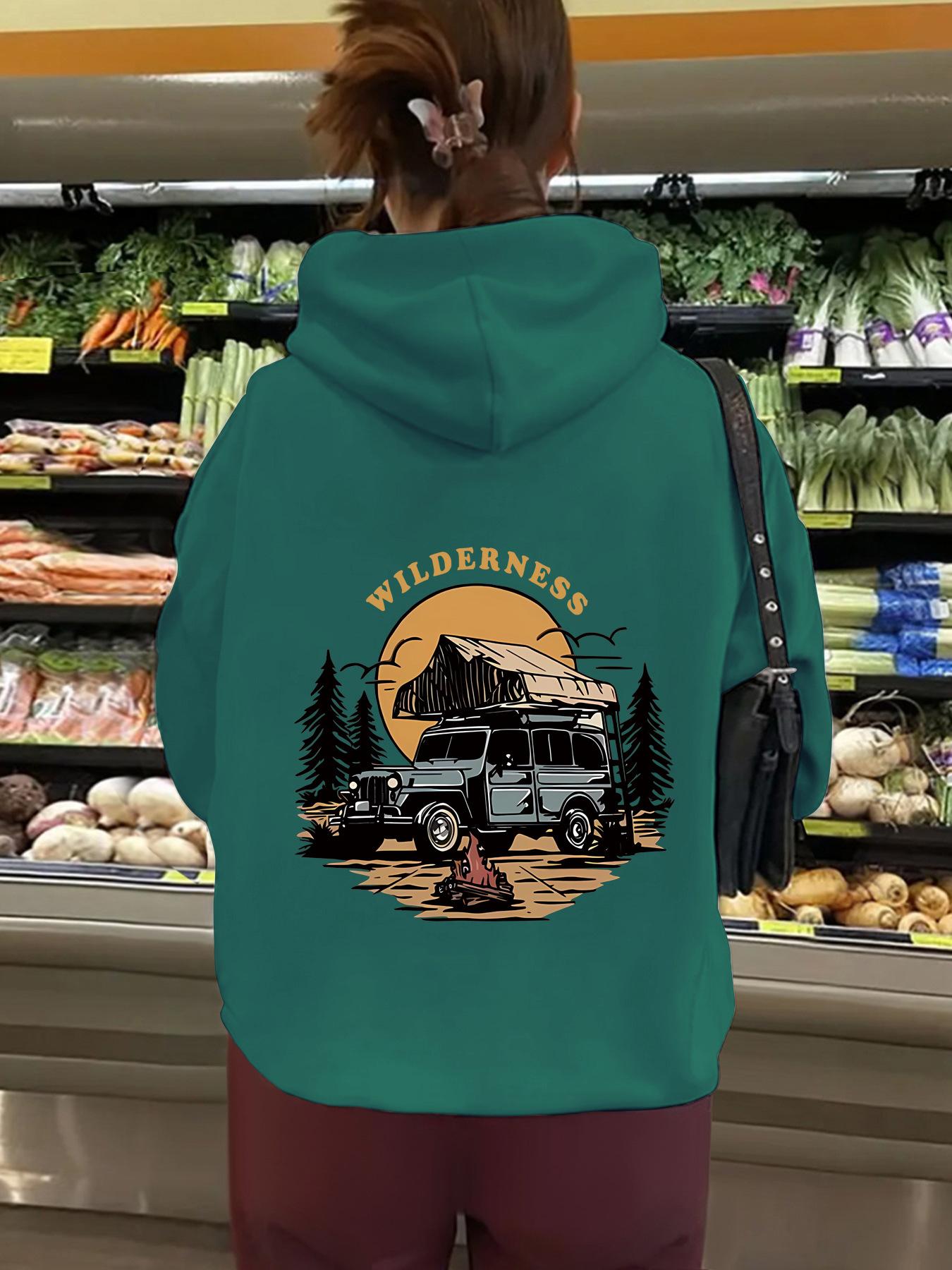 Sudadera con capucha de manga larga con bolsillo tipo canguro y forro polar para mujer, estilo europeo y americano, con estampado WILDERNESS, para otoño e invierno, talla transfronteriza