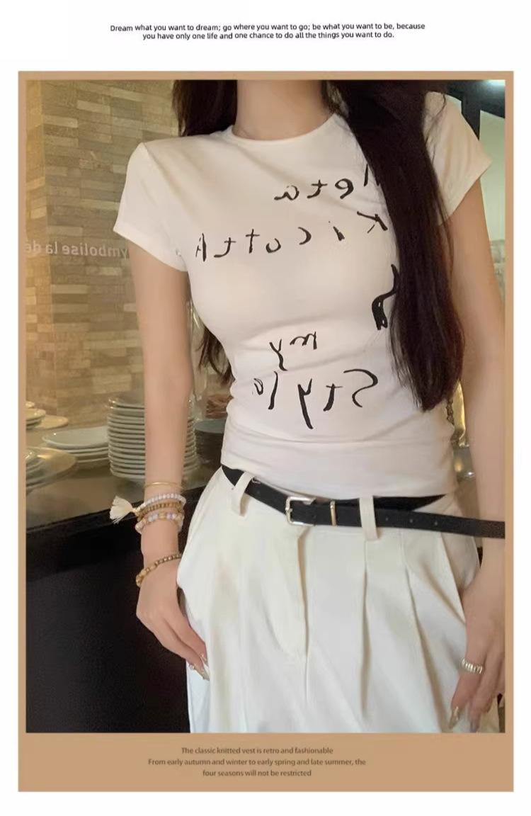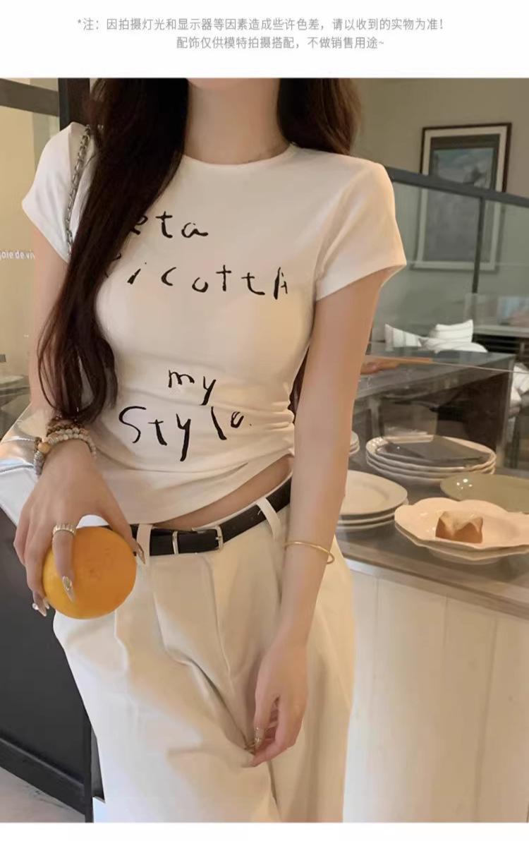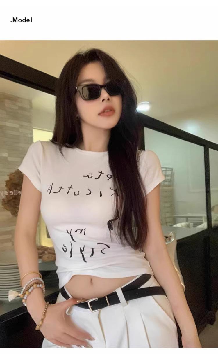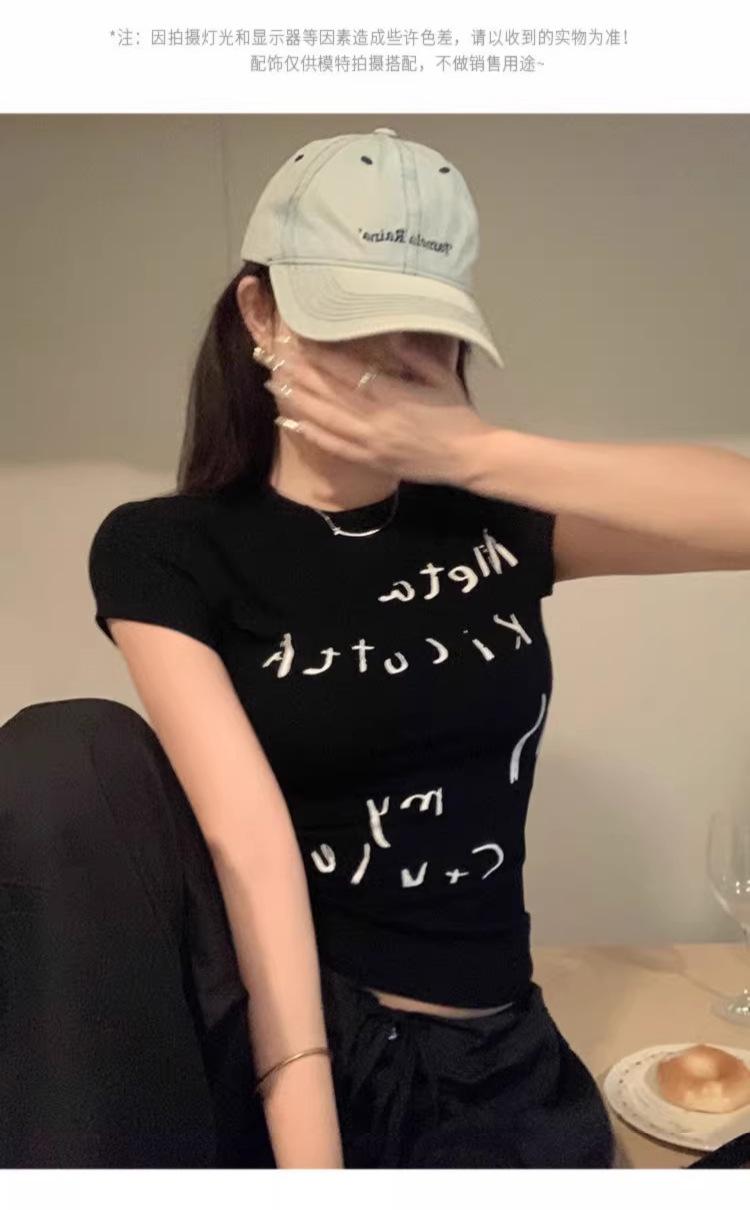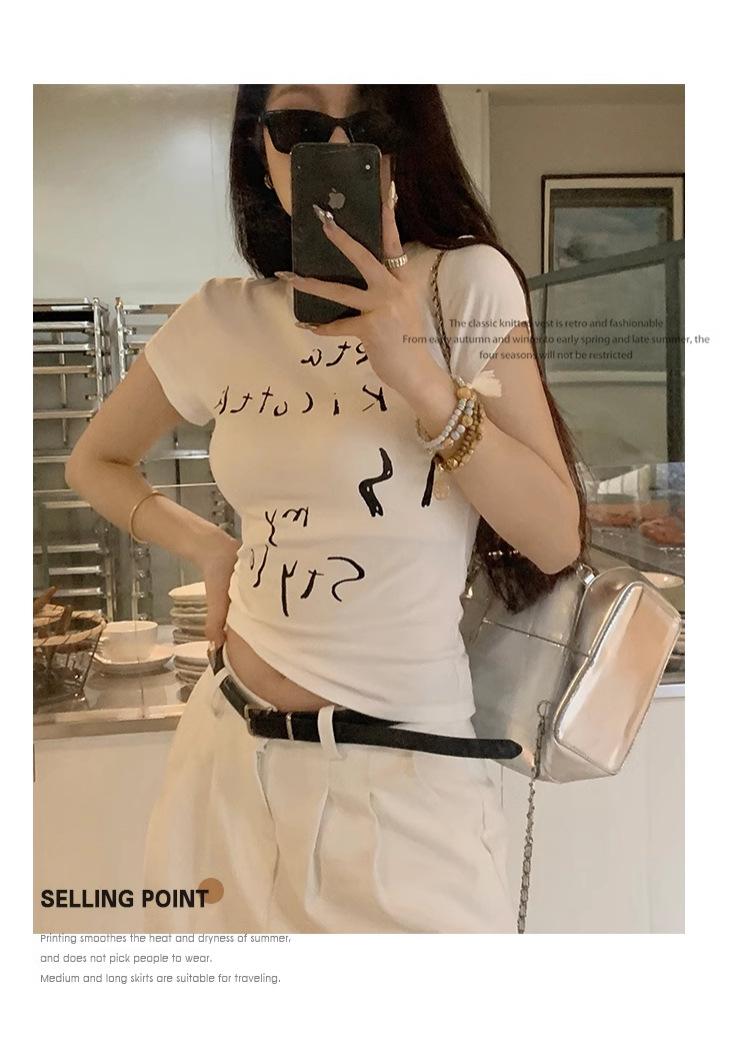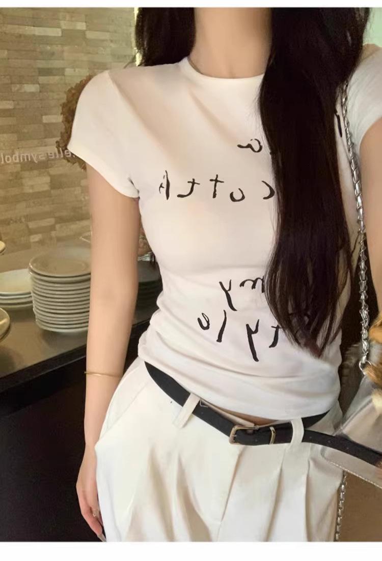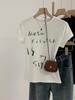Camiseta de manga corta con estampado de letras elegantes de estilo coreano para mujer, cuello redondo de verano, algodón puro, corte entallado, top pequeño