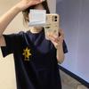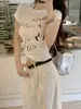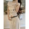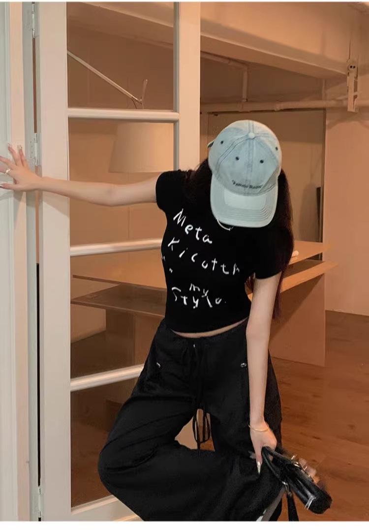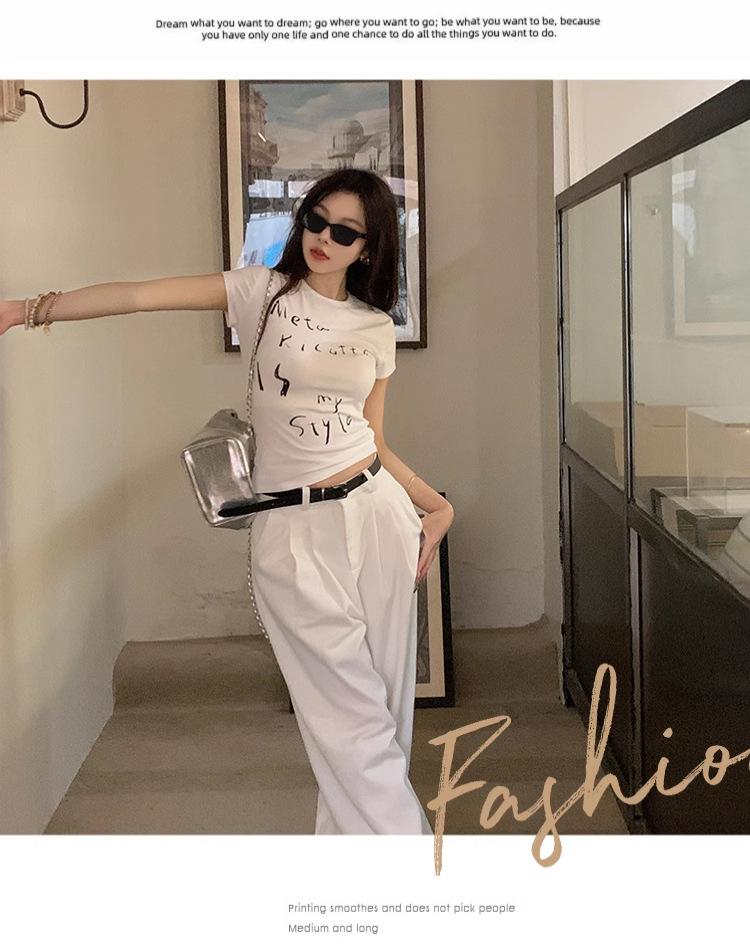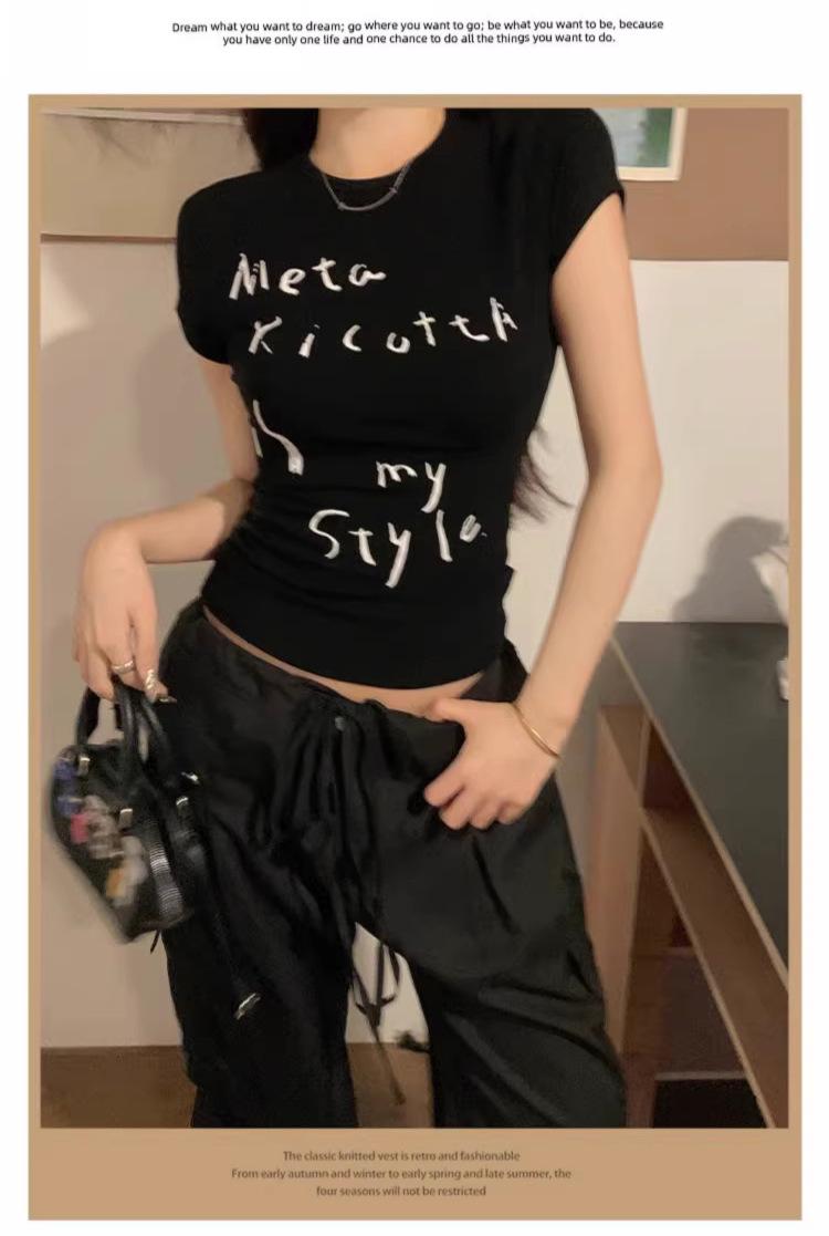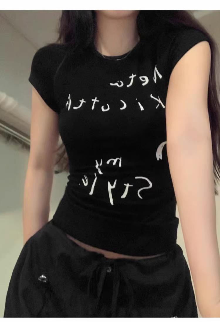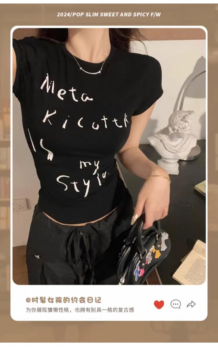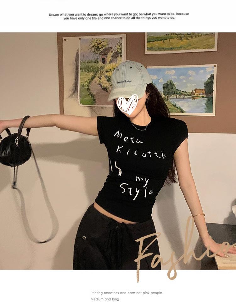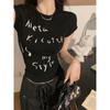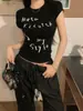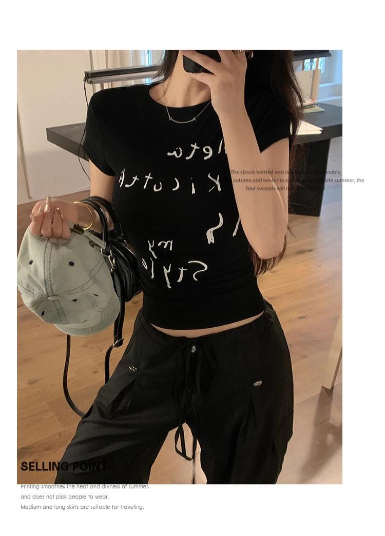 Camiseta de manga corta con estampado de letras elegantes de estilo coreano para mujer, cuello redondo de verano, algodón puro, corte entallado, top pequeño