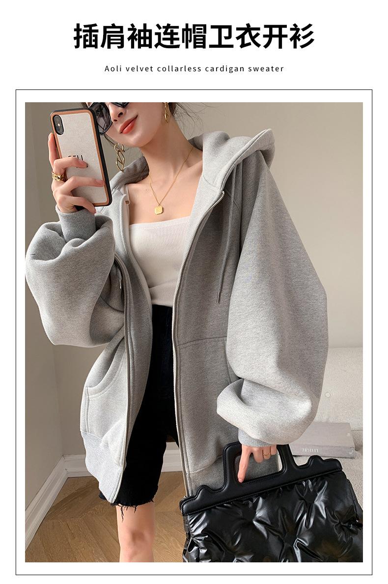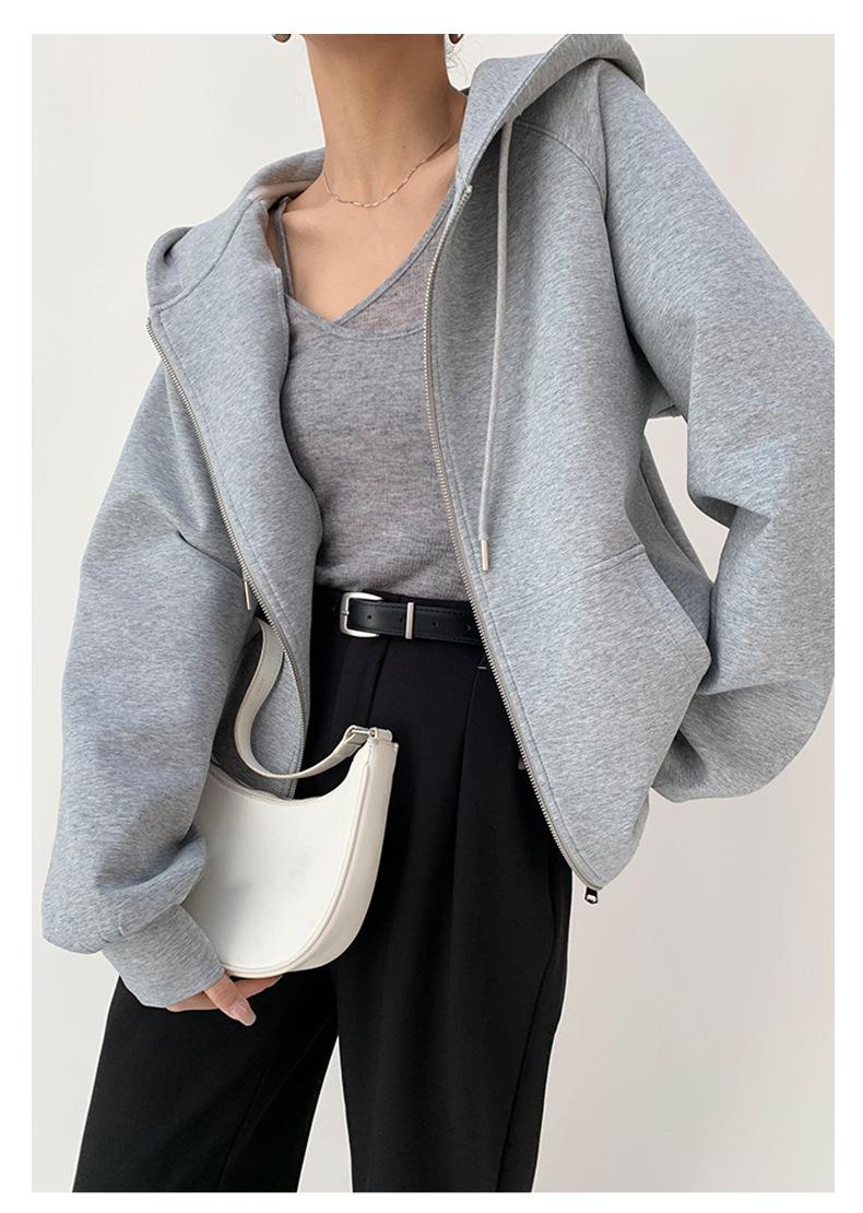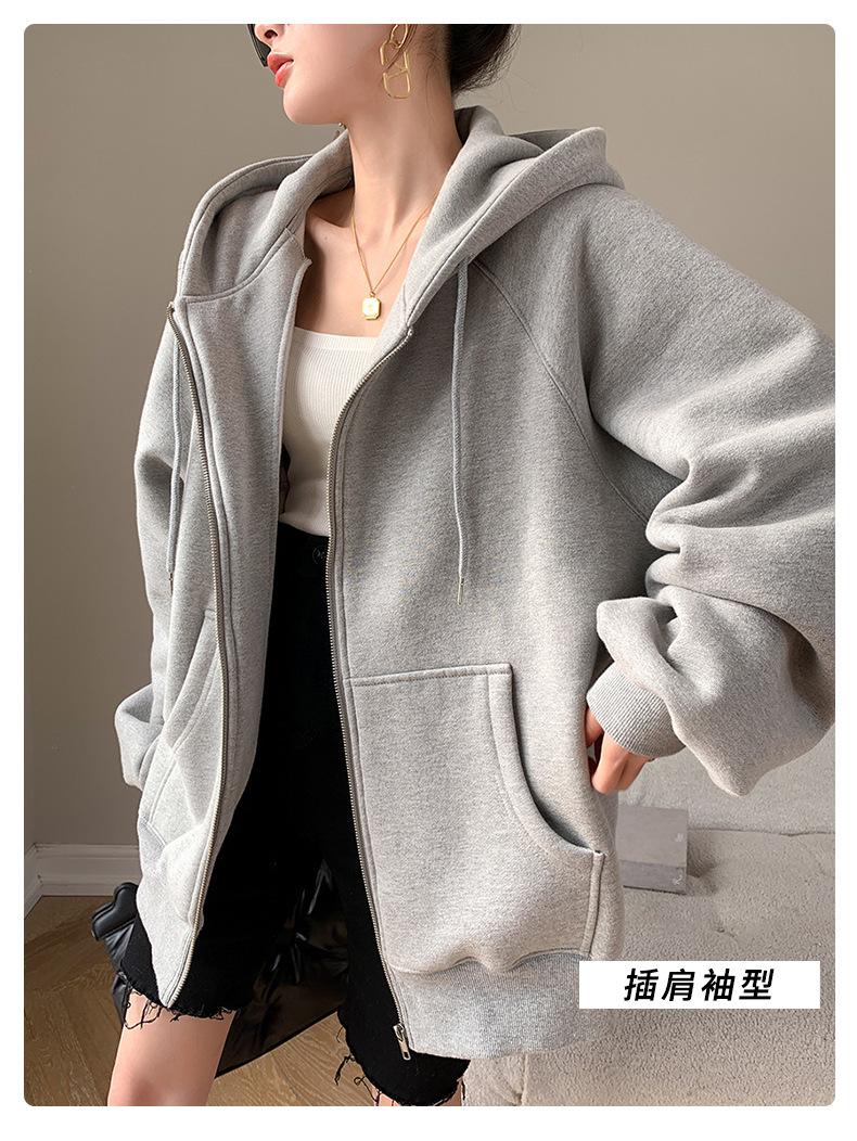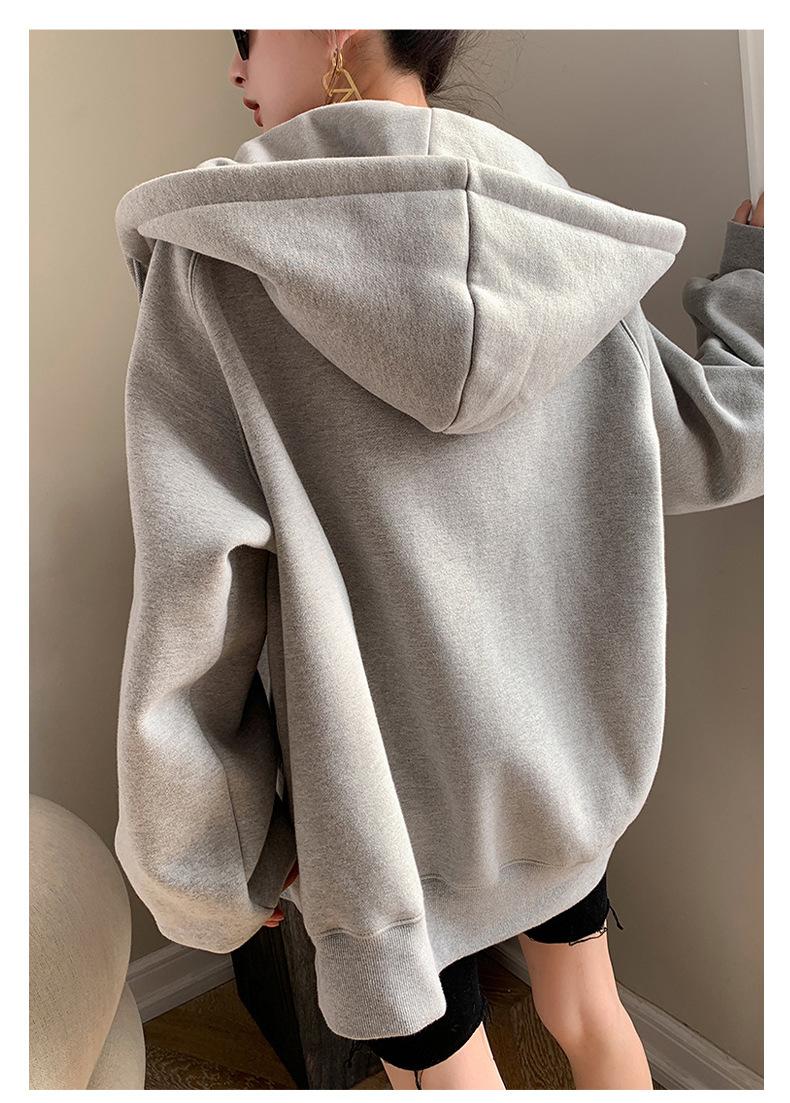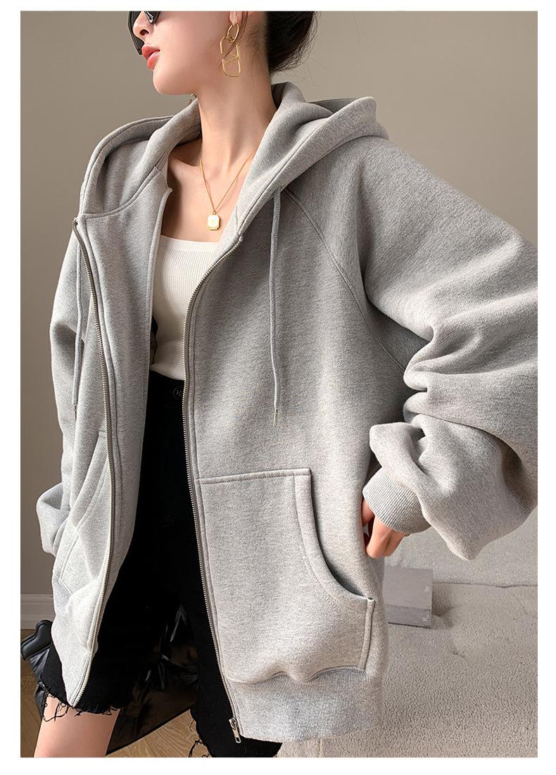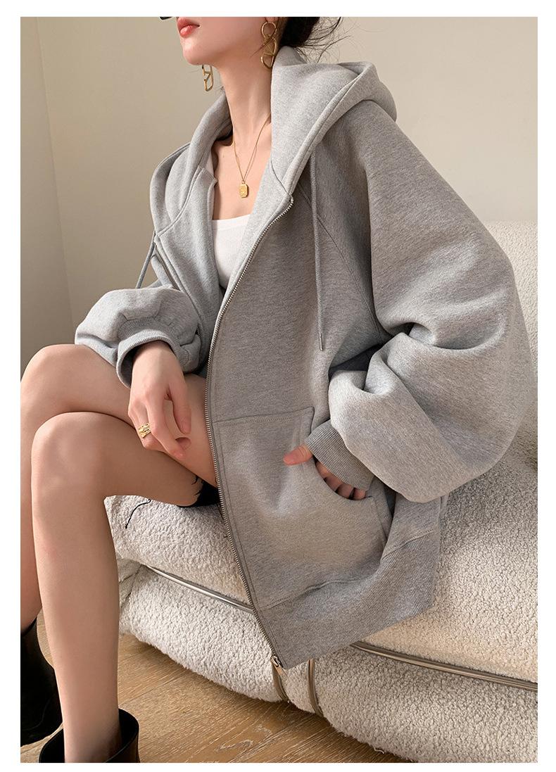 Chamarra Sudadera con Capucha Gris para Mujer 2025 Otoño e Invierno Nuevo Estilo Gruesa con Forro Polar Versátil Suelta Cárdigan con Cierre Top