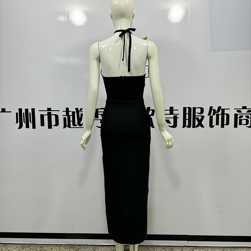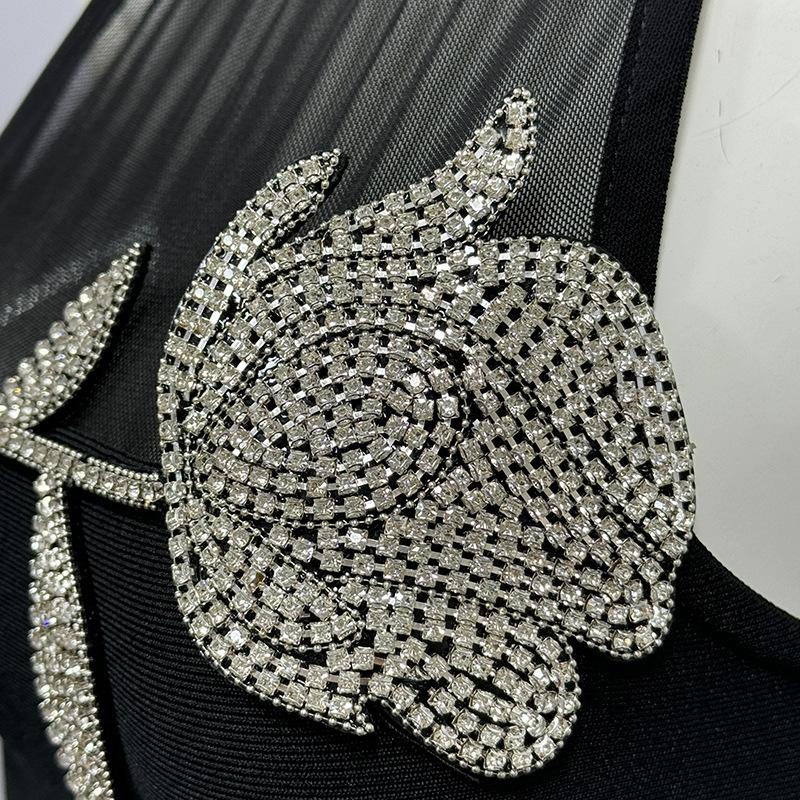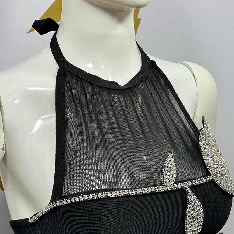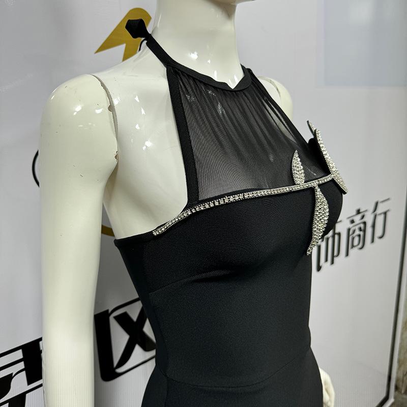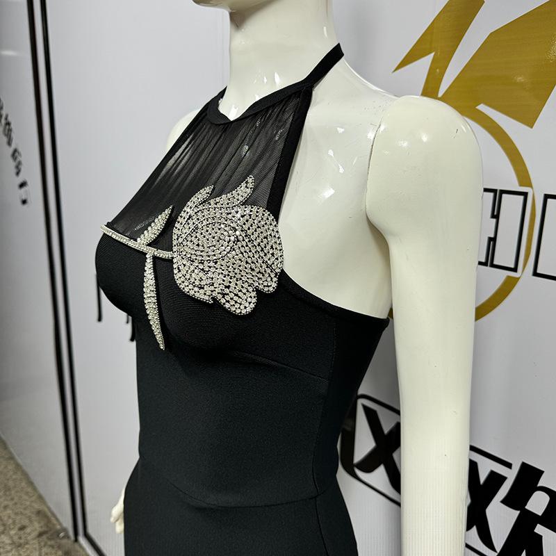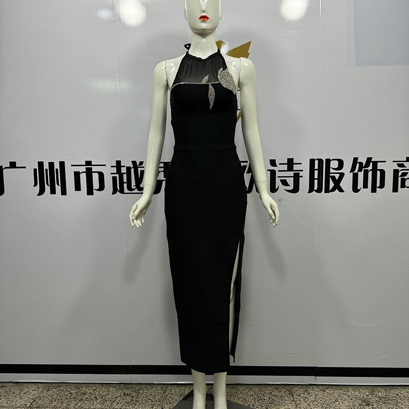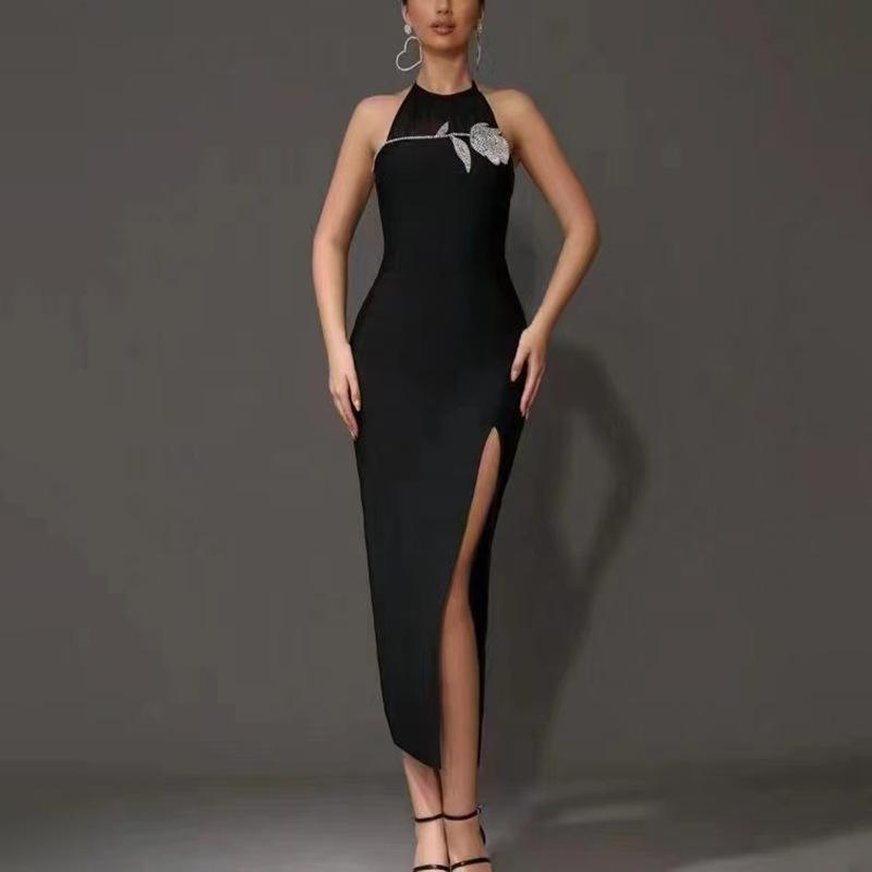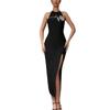 Vestido de noche elegante, ajustado, con abertura y cuello de malla, ligero, de lujo, sin mangas, con diamantes, estilo transfronterizo europeo y americano