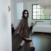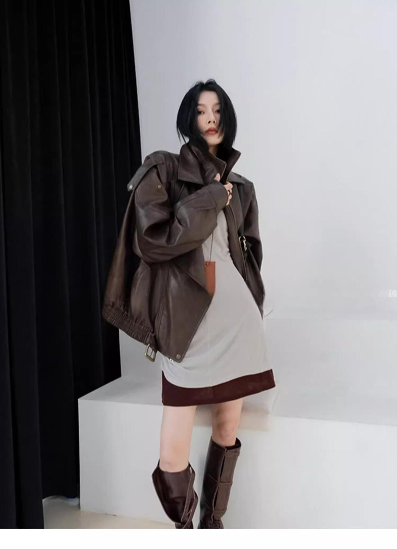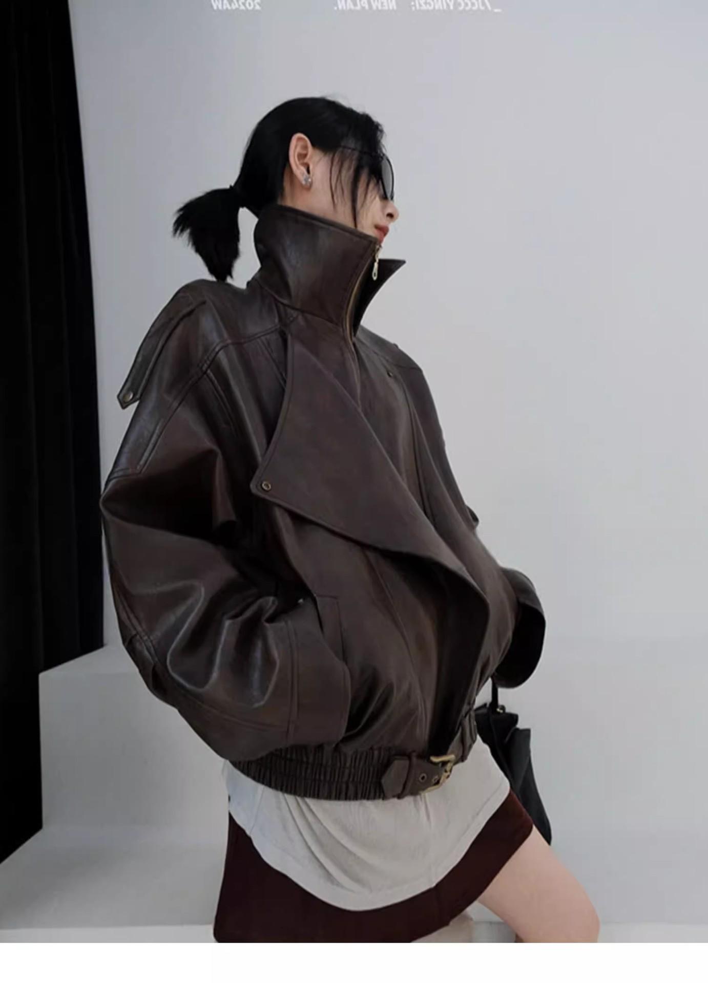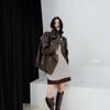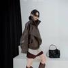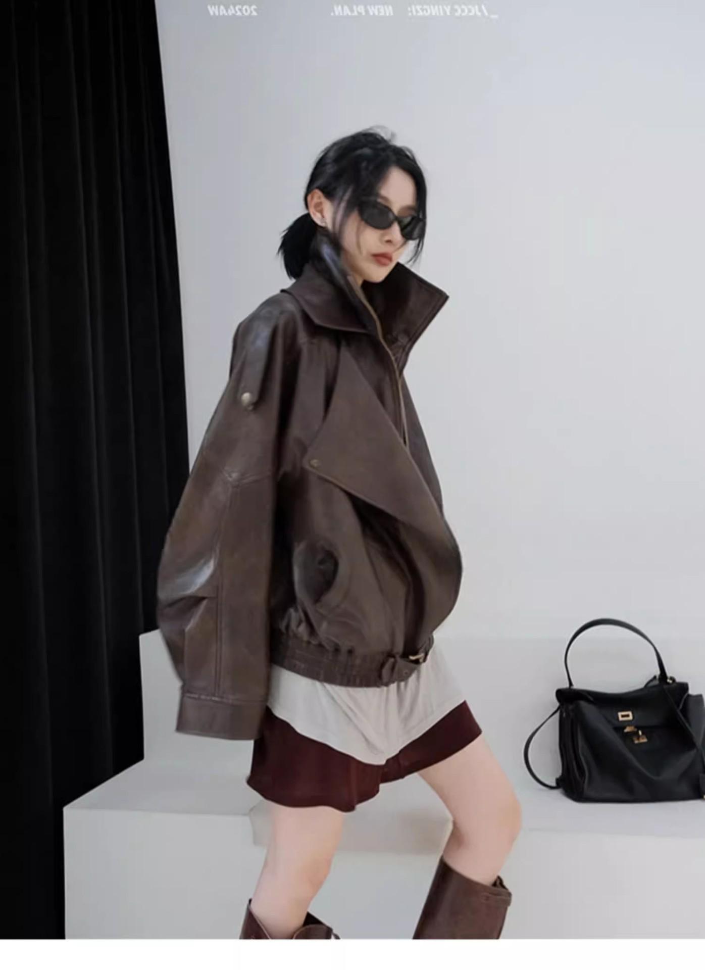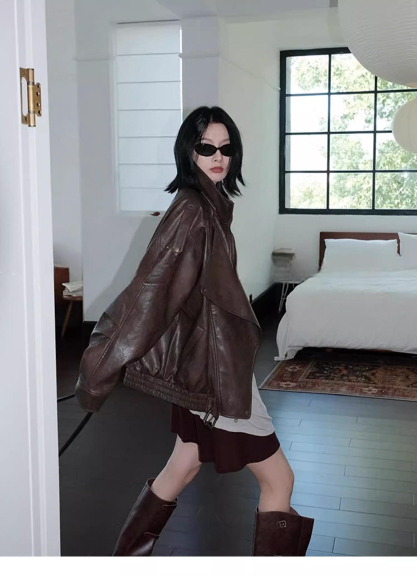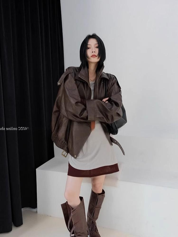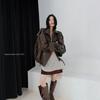 Chaqueta de cuero marrón retro americana para mujer, otoño 2024, nuevo traje de alta gama para viajeros.