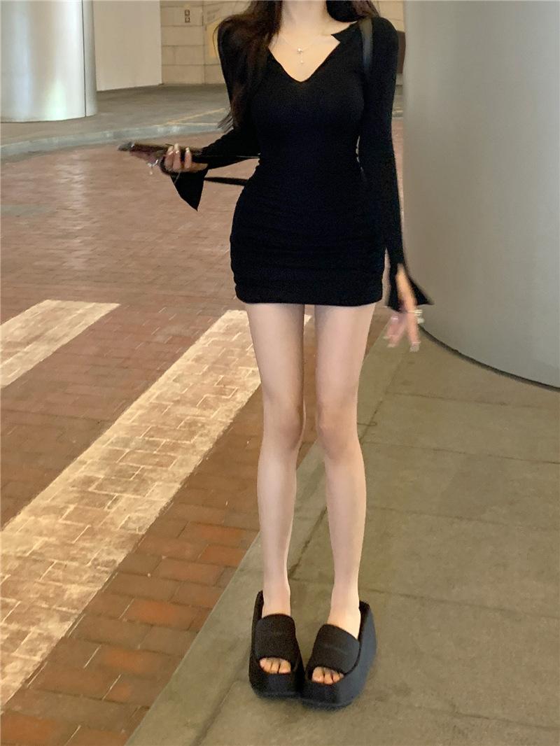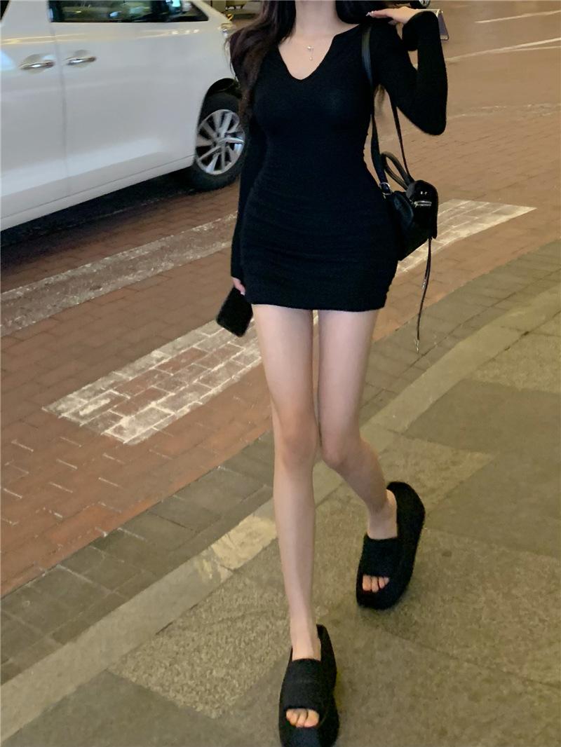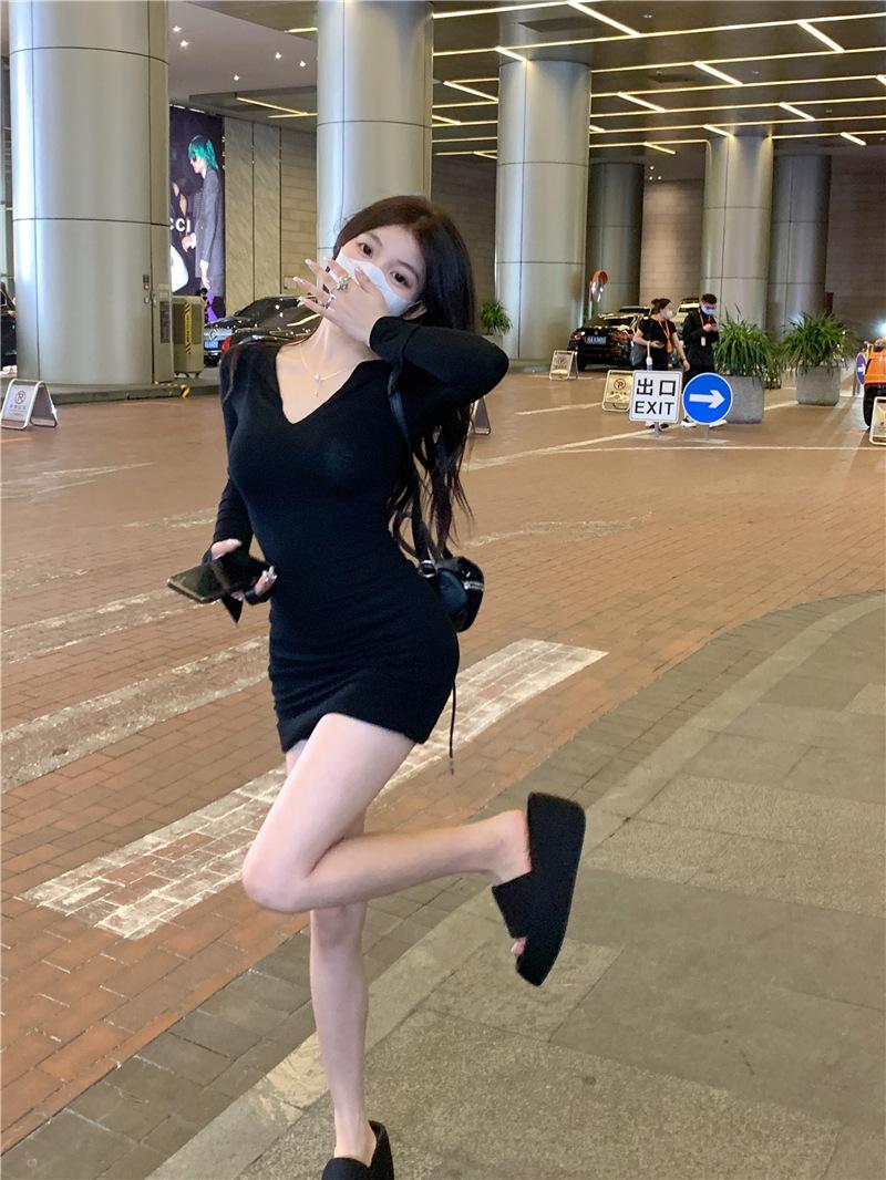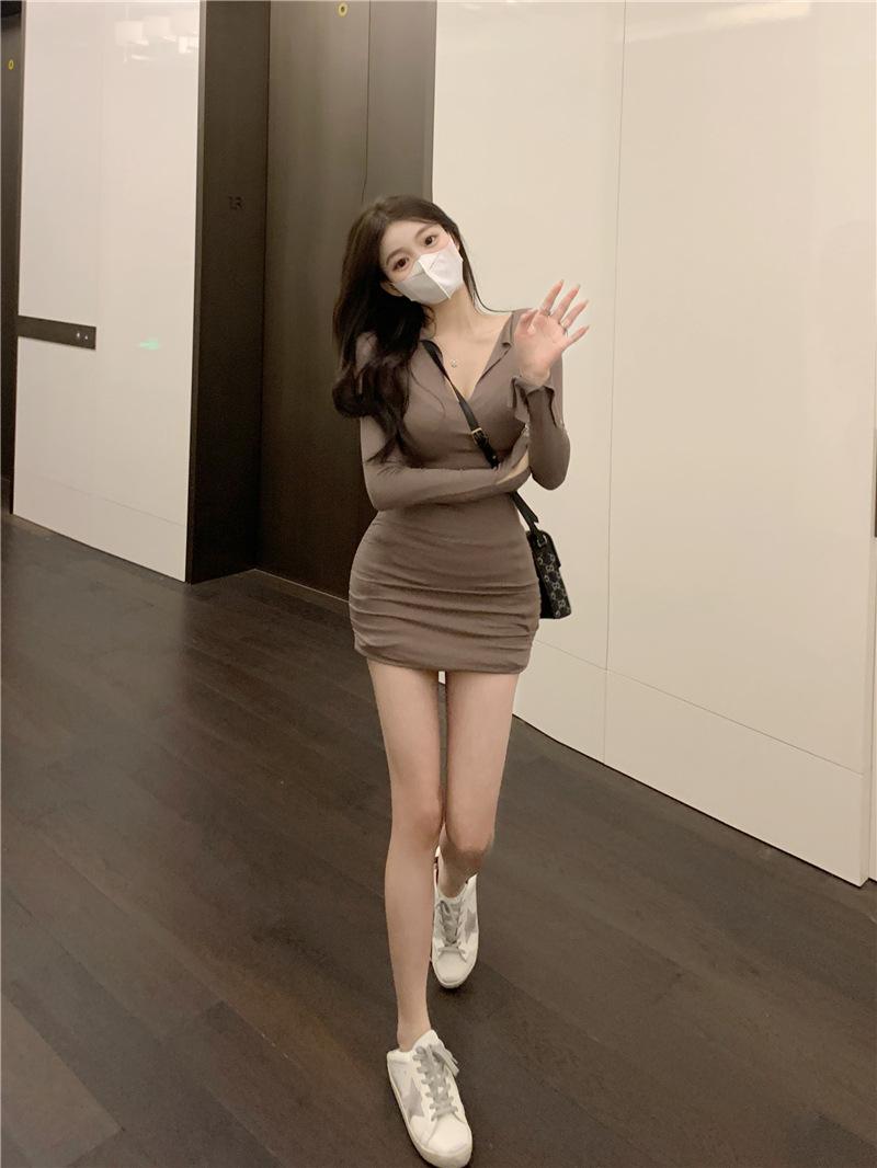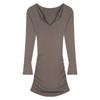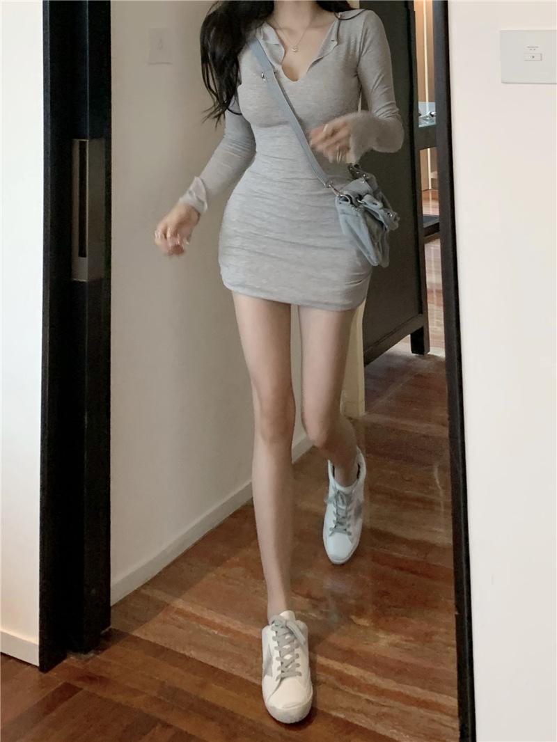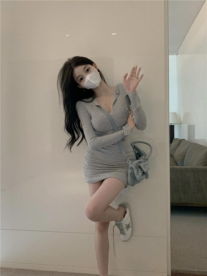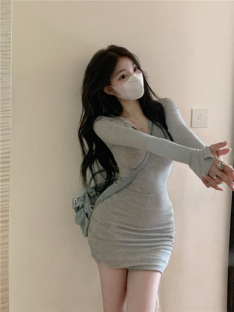 3895# Vestido de manga larga con cuello en V para chica sexy femenino otoño 2024 nuevo gris cintura bajo falda corta ceñida falda de cadera