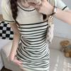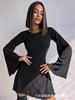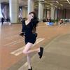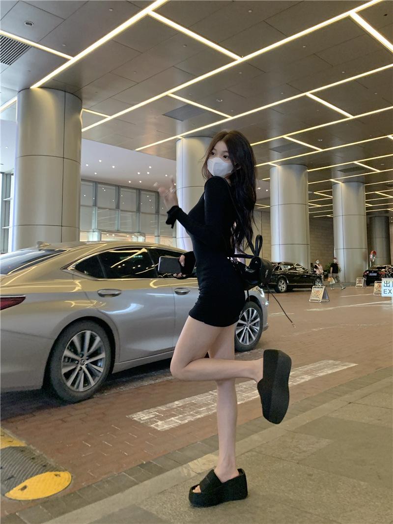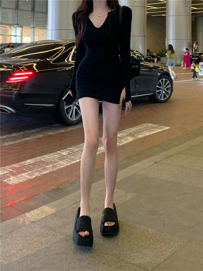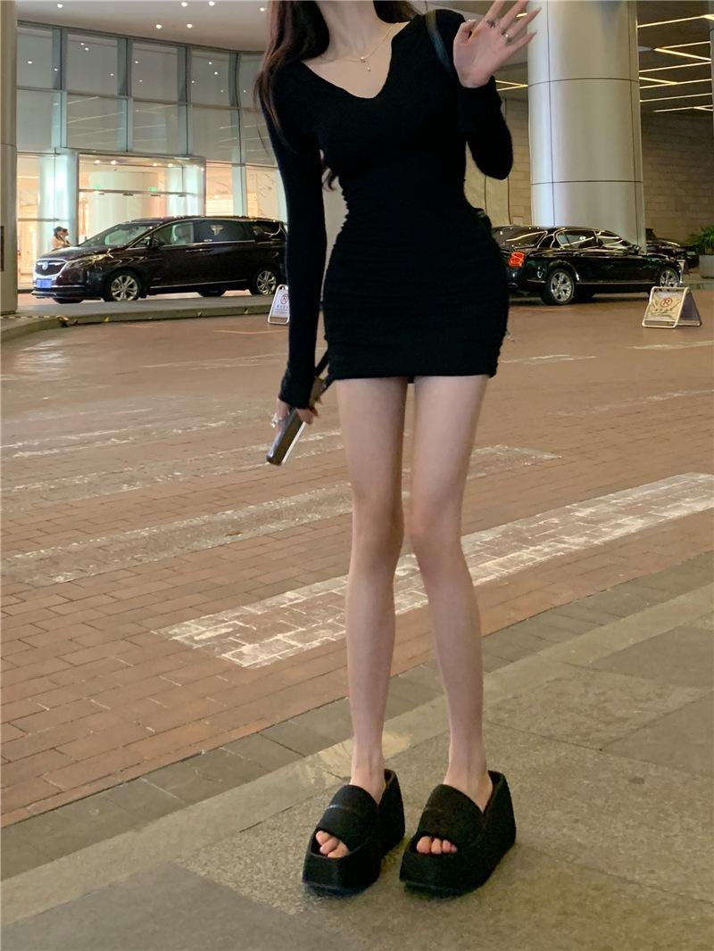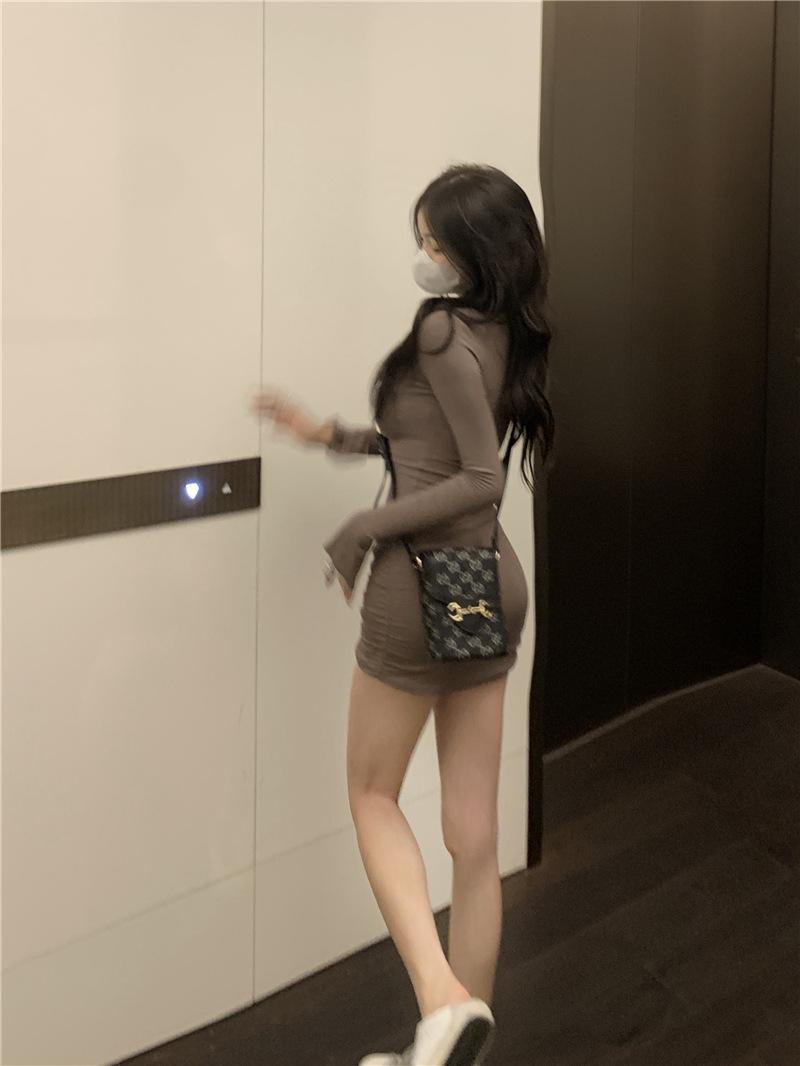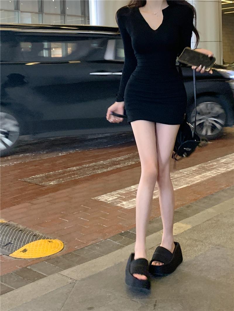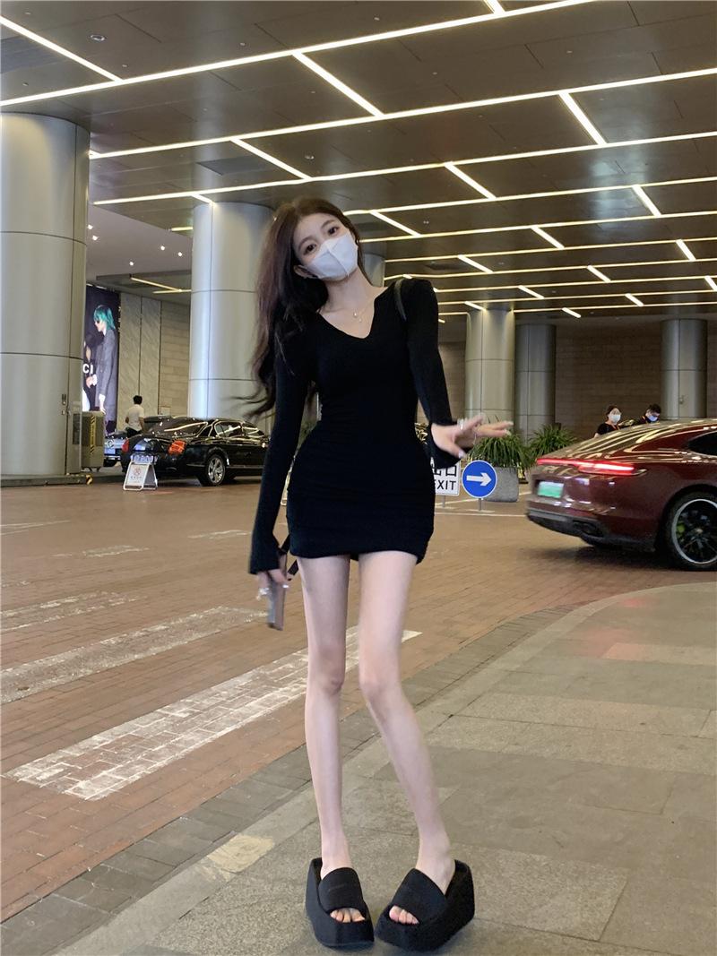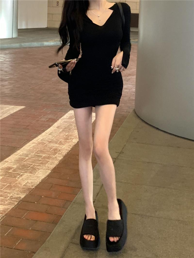 3895# Vestido de manga larga con cuello en V para chica sexy femenino otoño 2024 nuevo gris cintura bajo falda corta ceñida falda de cadera