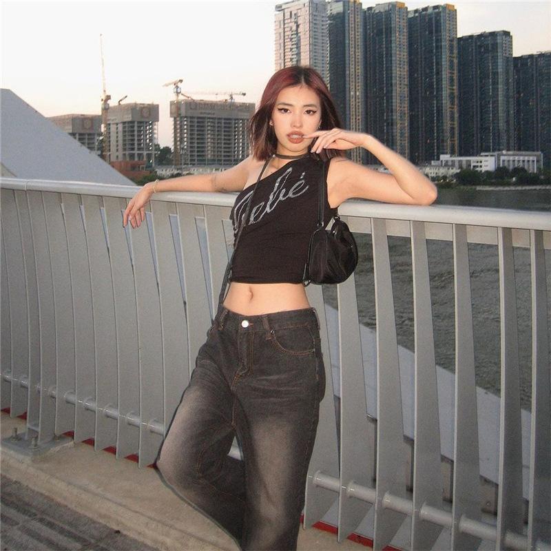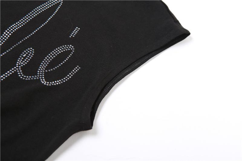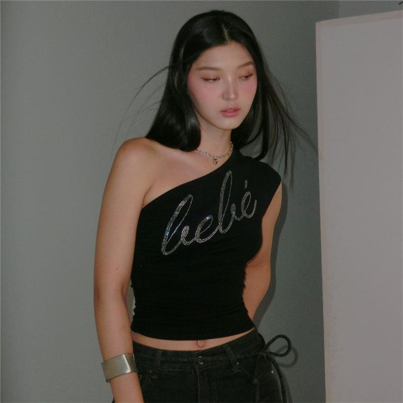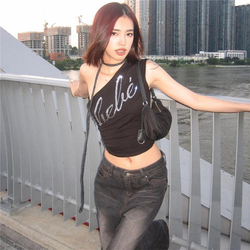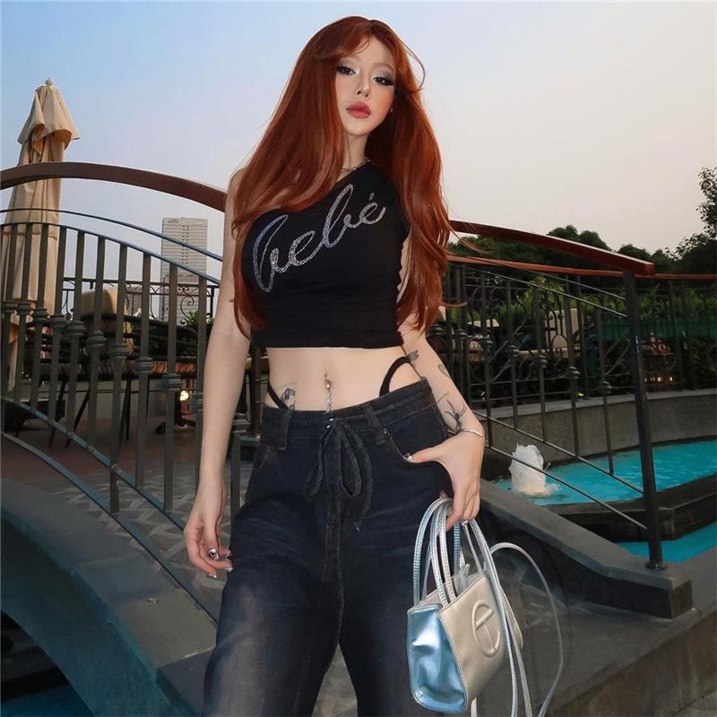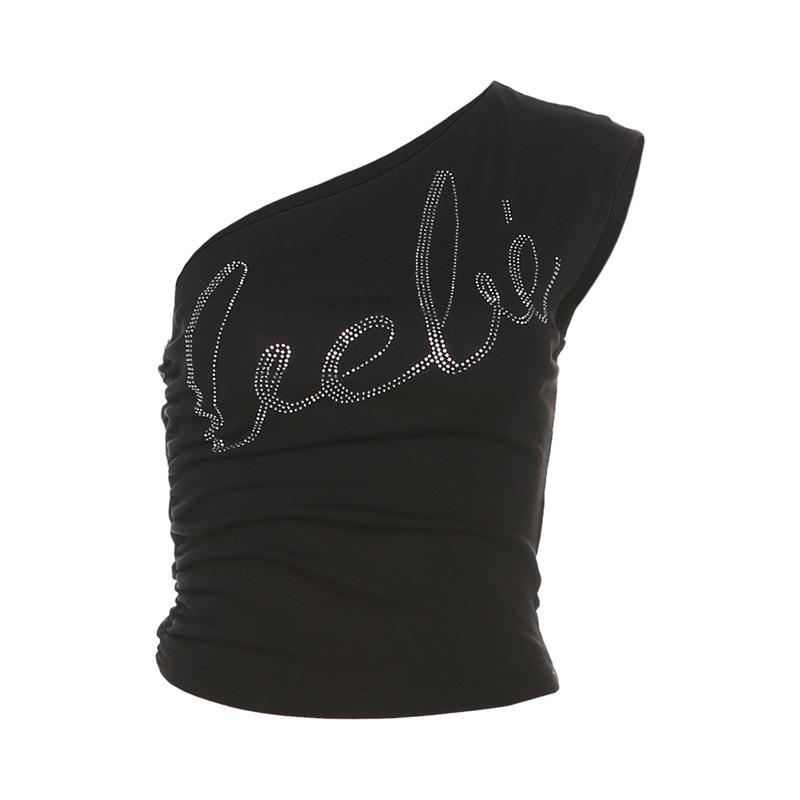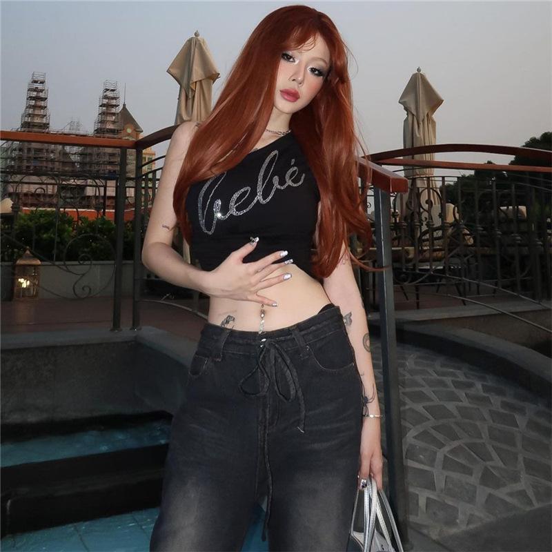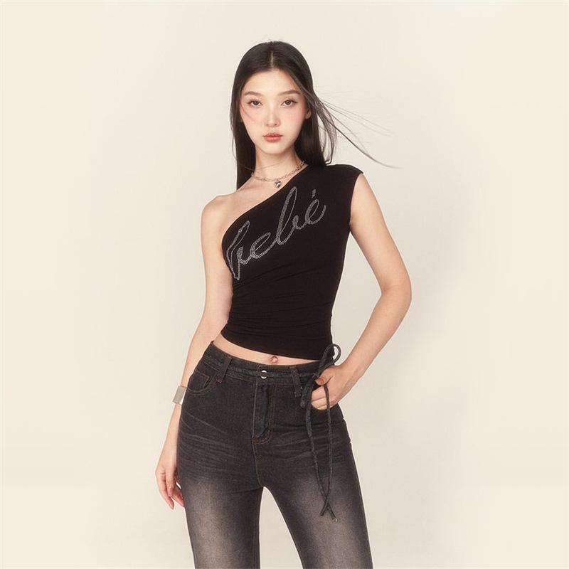 Europeo y Americano Transfronterizo 2023 Verano Moda Trendy para Mujer Nuevo Hombro Inclinado Ajustado Letra Diamante Caliente Ombligo Expuesto Chaleco Versátil