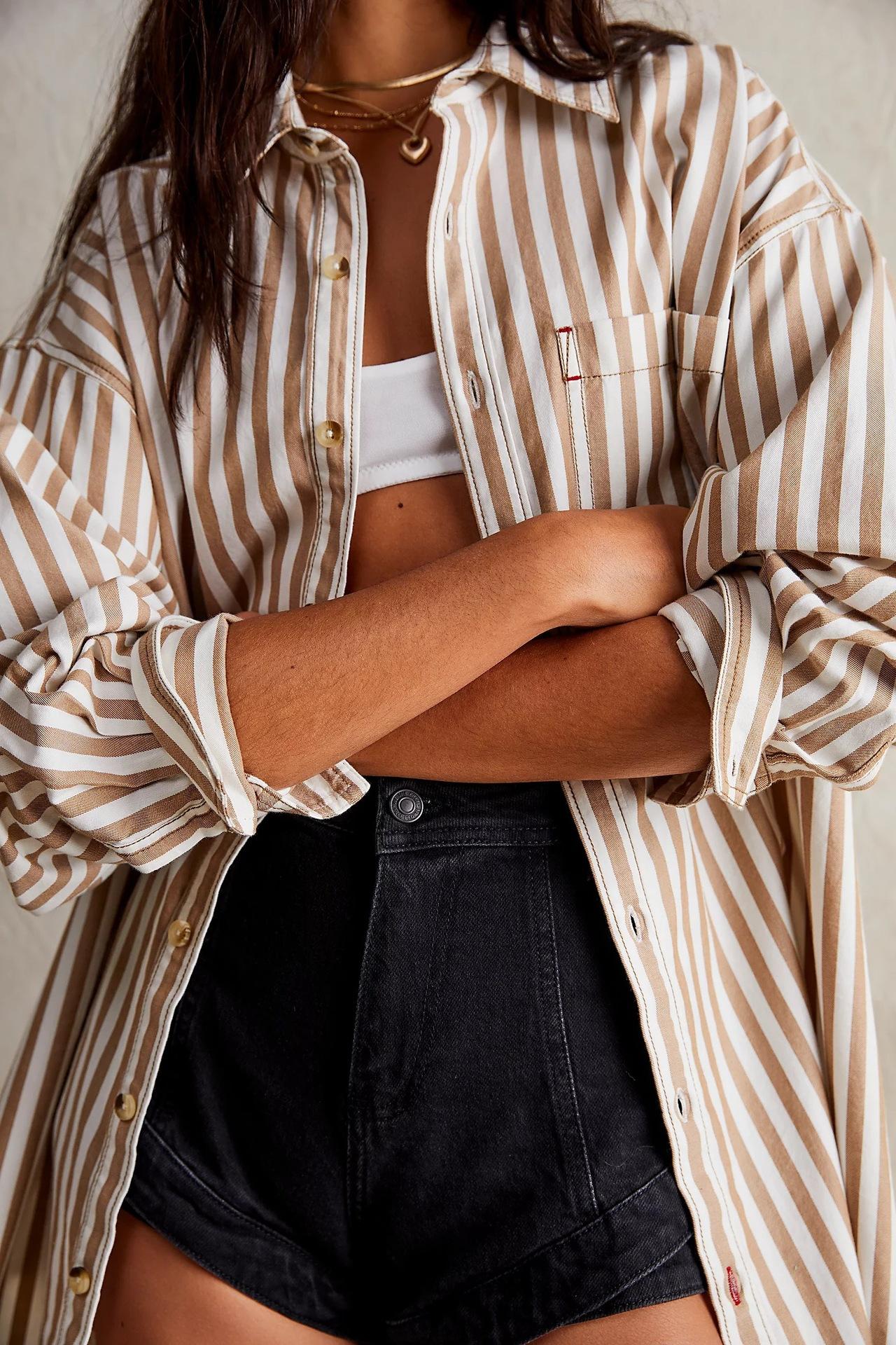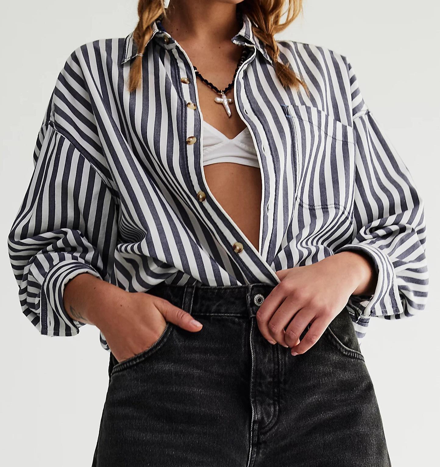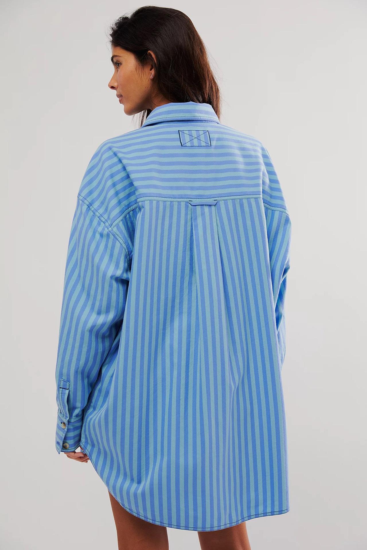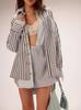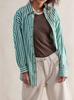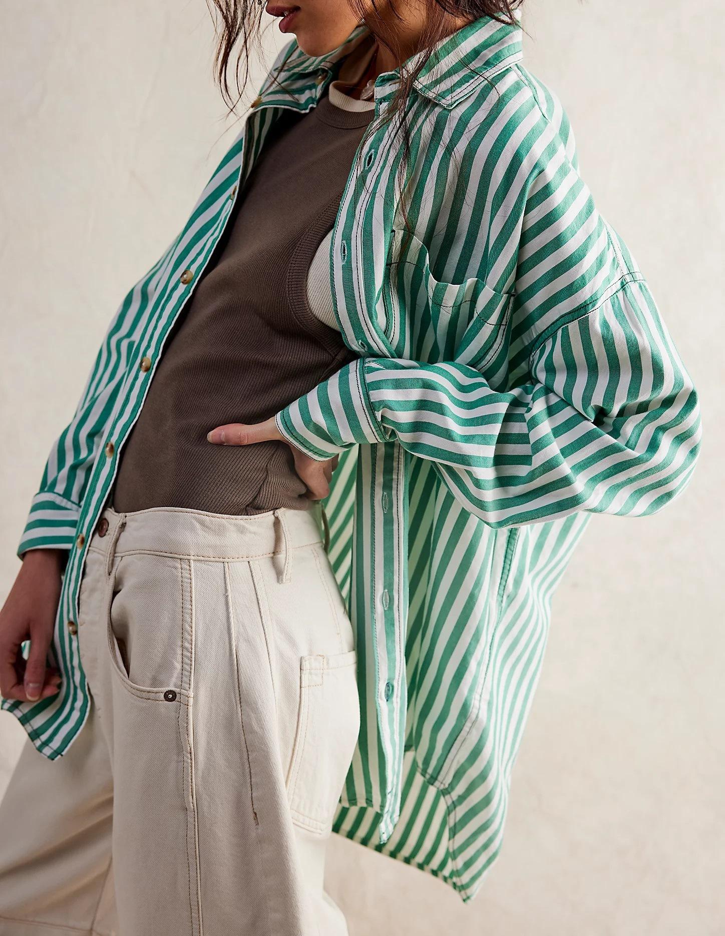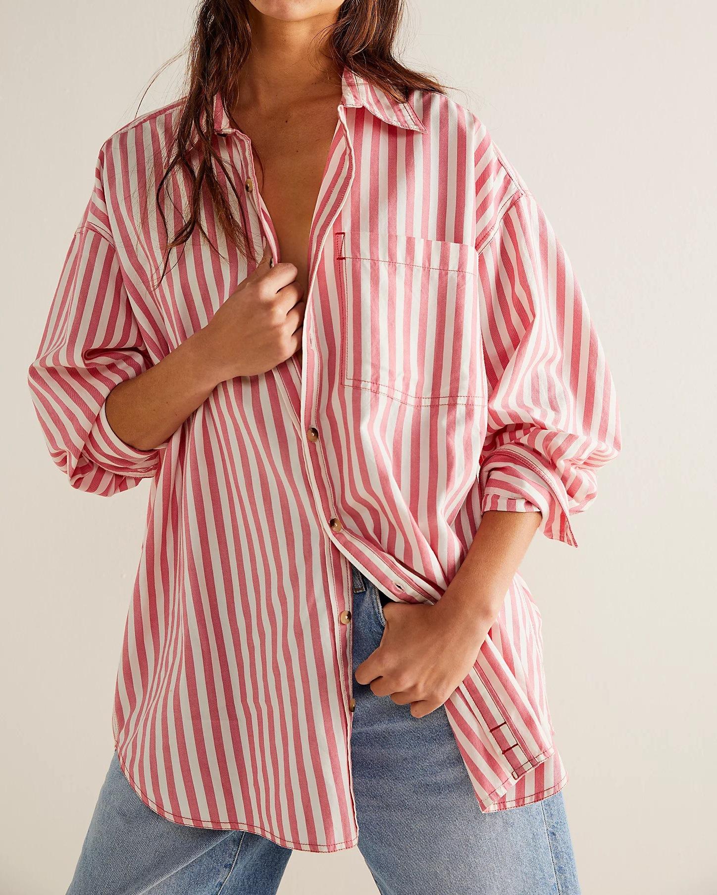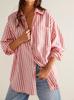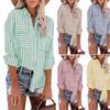 Europeo y Americano Transfronterizo 2024 Nuevo Amazon Estilo Occidental Combinable Holgado Casual Rayado Largo Medio Manga Larga Camisa Abotonada