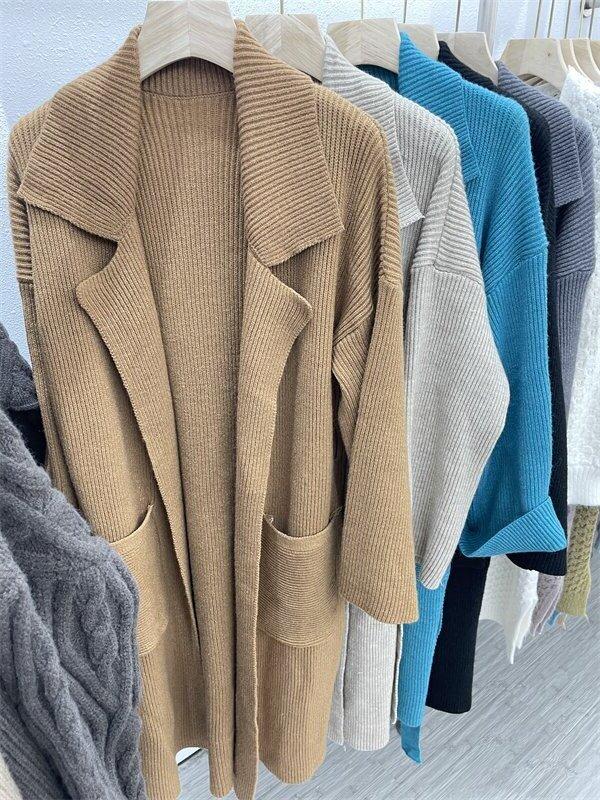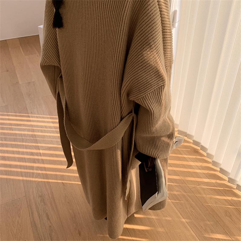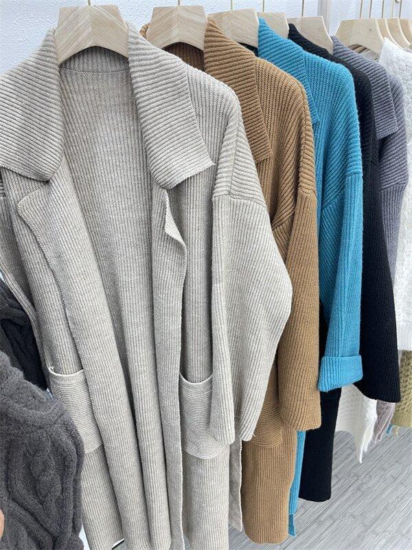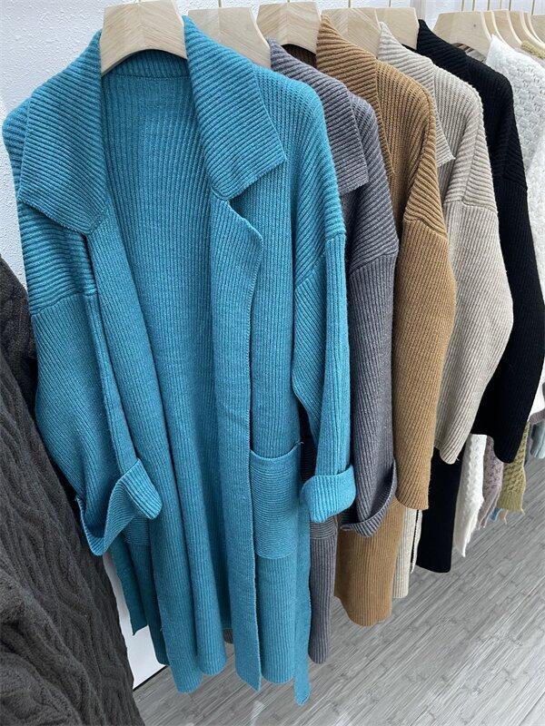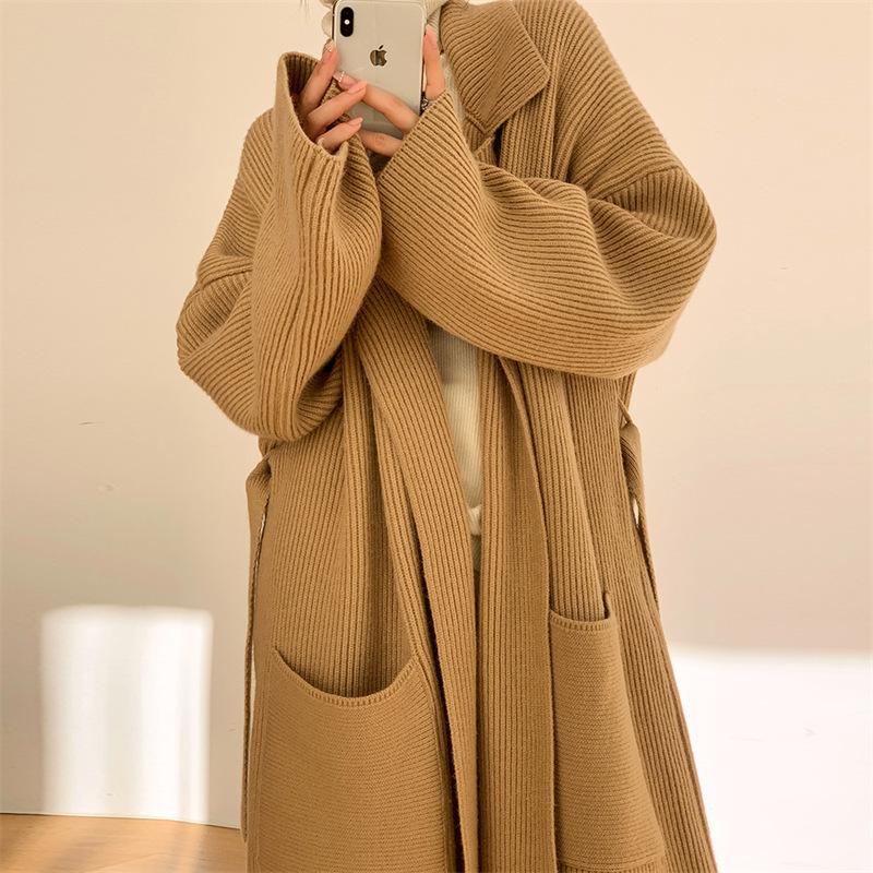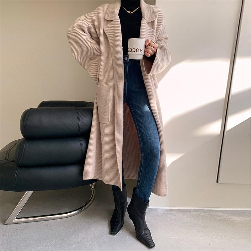 Otoño e Invierno Estilo Coreano Suelto Estilo Perezoso Cárdigan Suéter Largo para Mujer Diseño Adelgazante de Cintura Tejido de Manga Larga Abrigo Largo