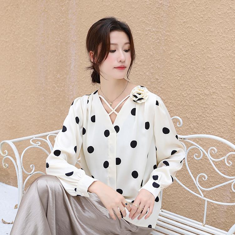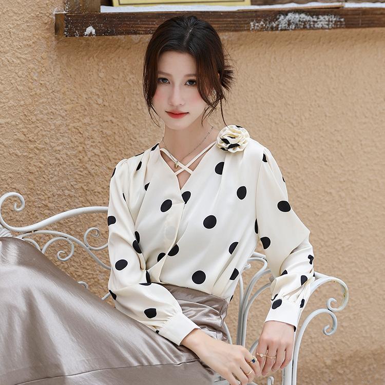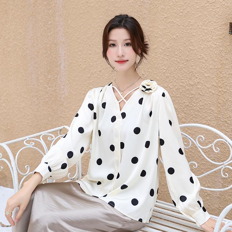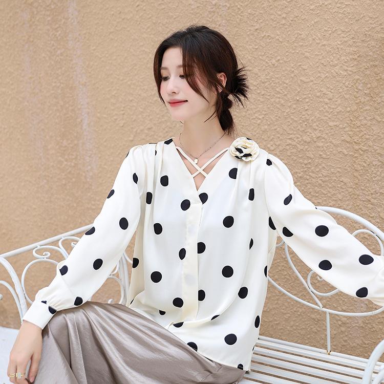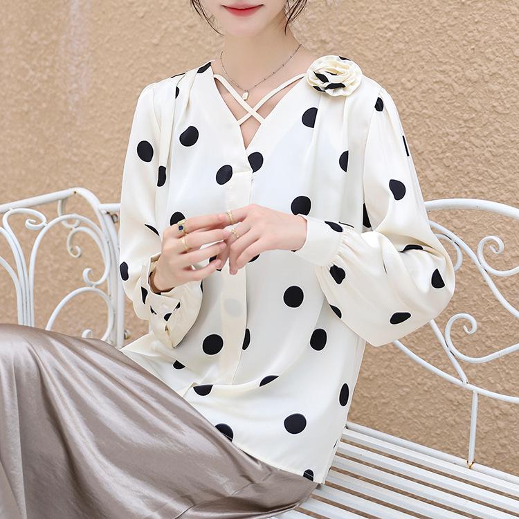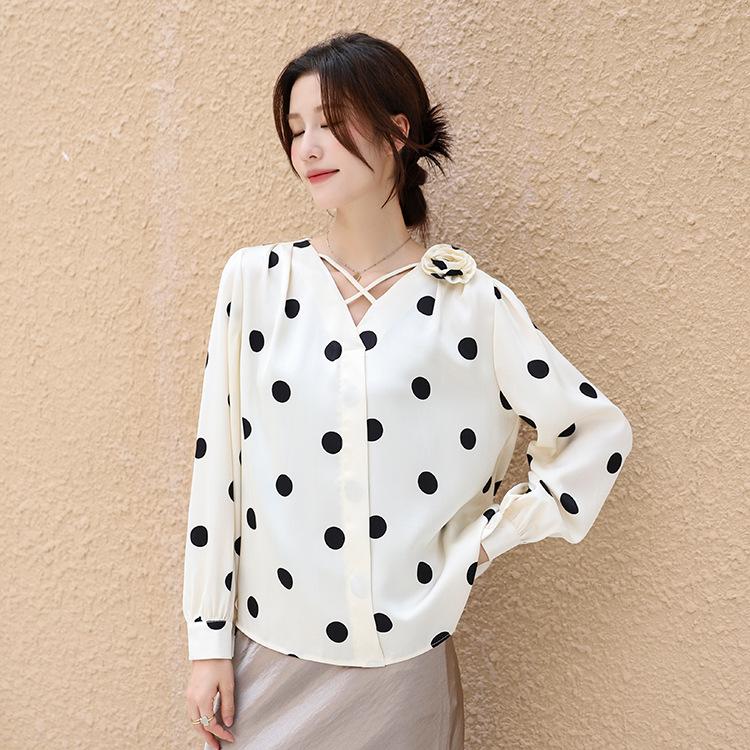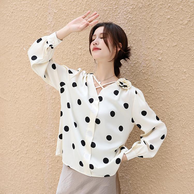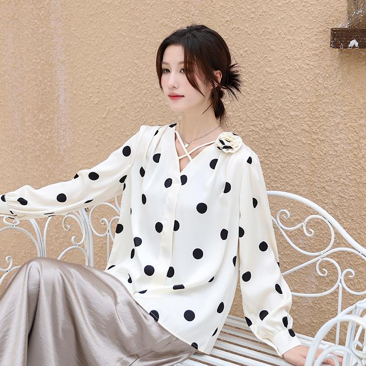 Ropa de Trabajo Ligera de Estilo Profesional Corte en V con Abertura Top de Lunares para Mujer Primavera y Verano 2025 Camisa Elegante de Satén de Acetato de Imitación