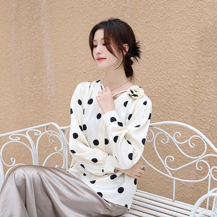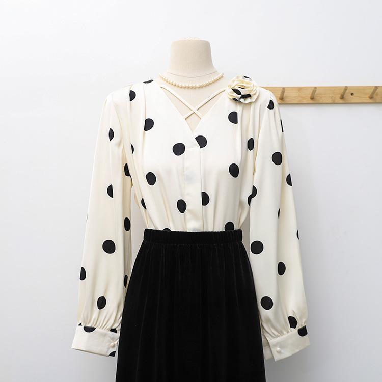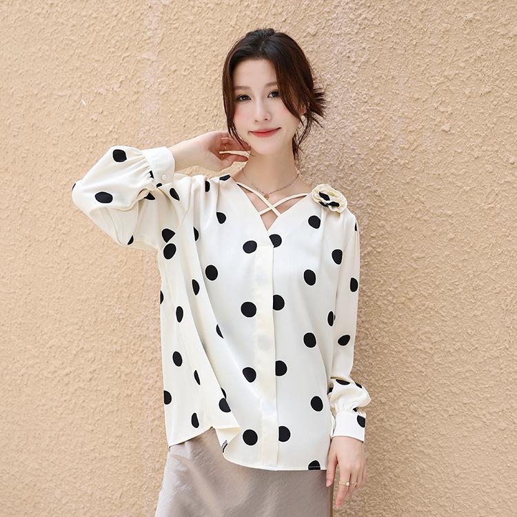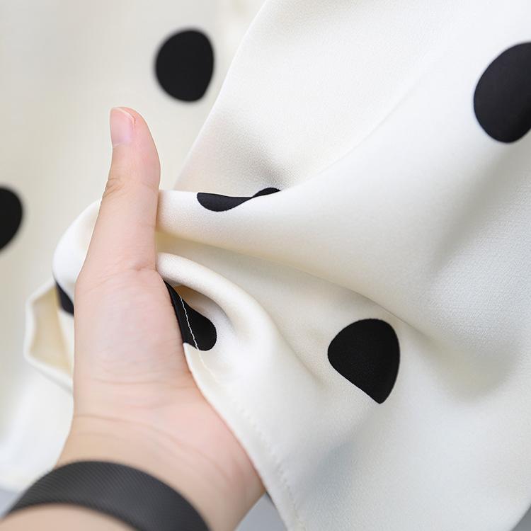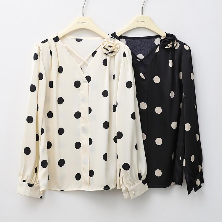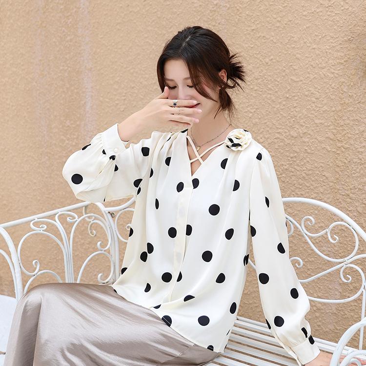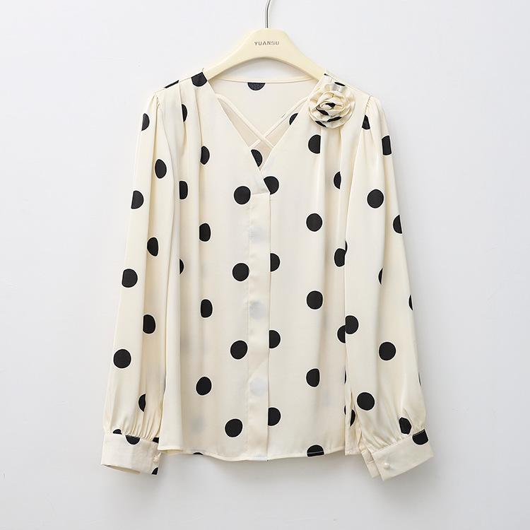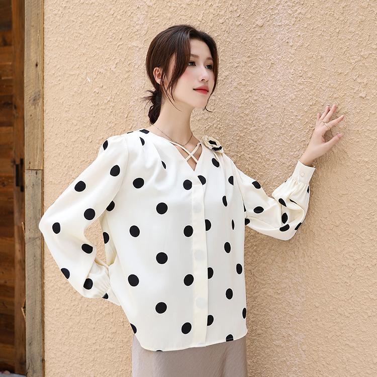 Ropa de Trabajo Ligera de Estilo Profesional Corte en V con Abertura Top de Lunares para Mujer Primavera y Verano 2025 Camisa Elegante de Satén de Acetato de Imitación