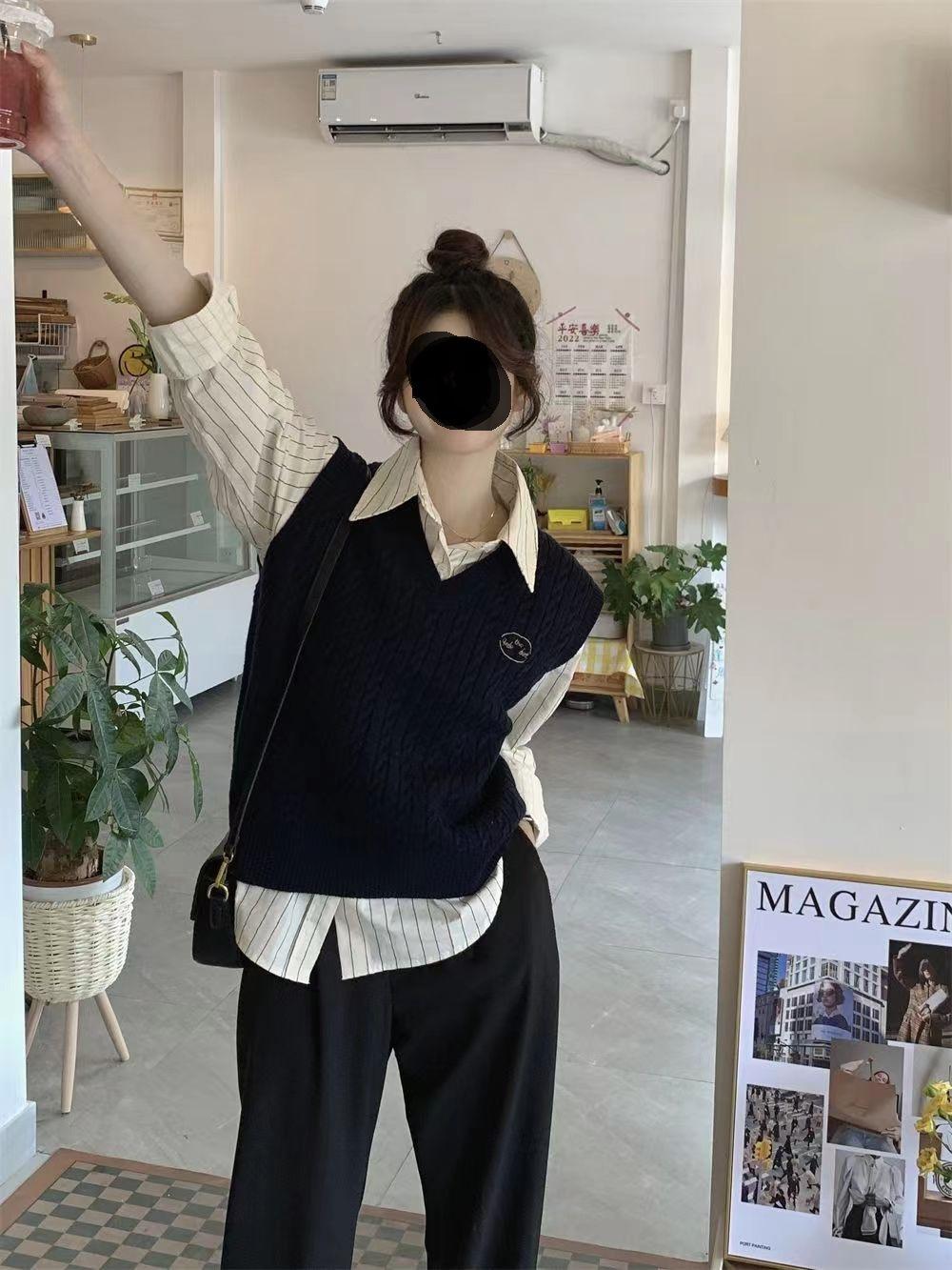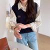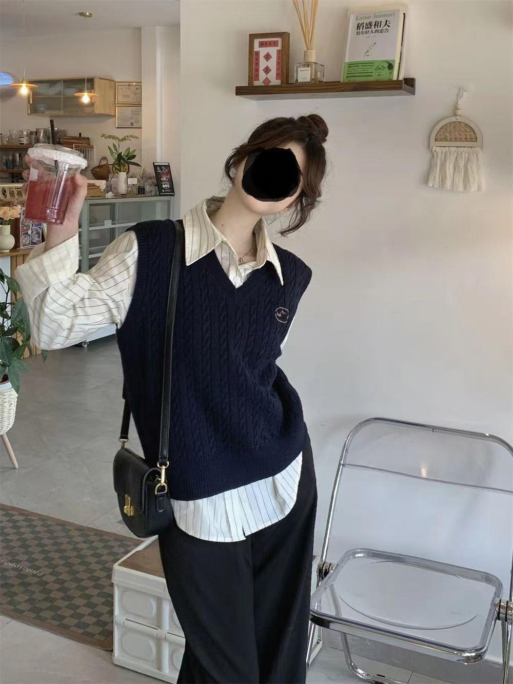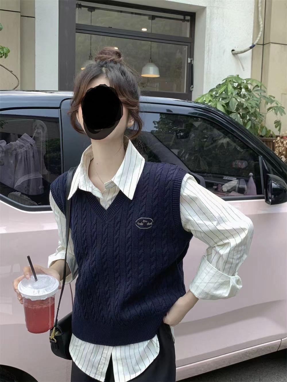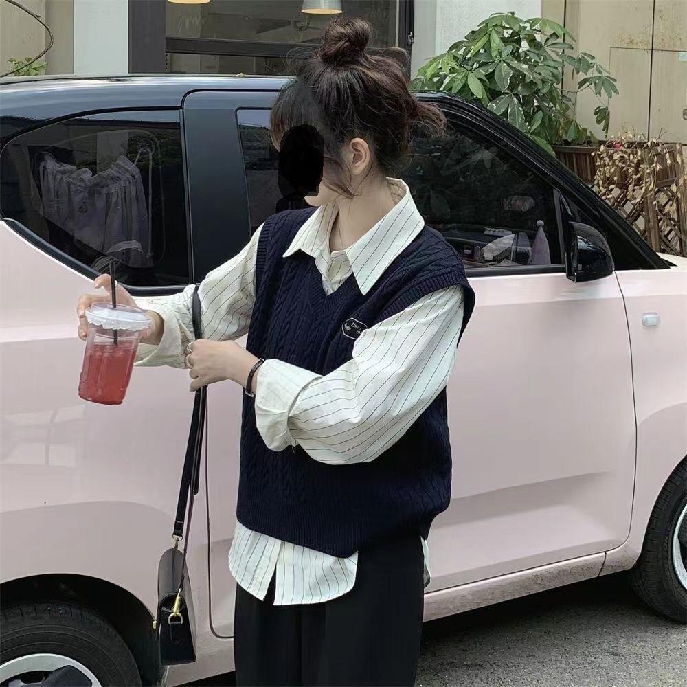Chaleco de punto con cuello en V estilo universitario para mujer, suéter retro sin mangas apilado de principios de otoño de 2024, top exterior