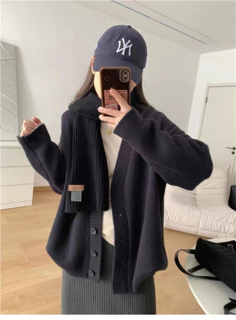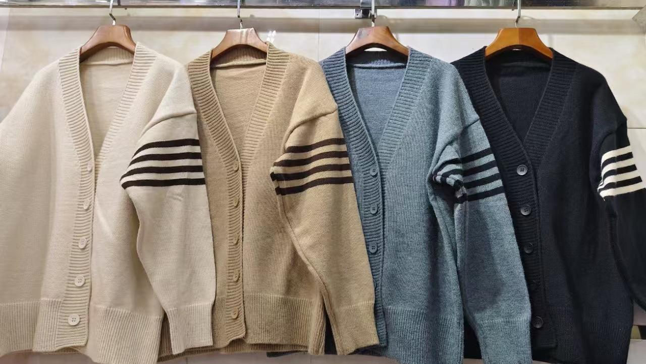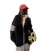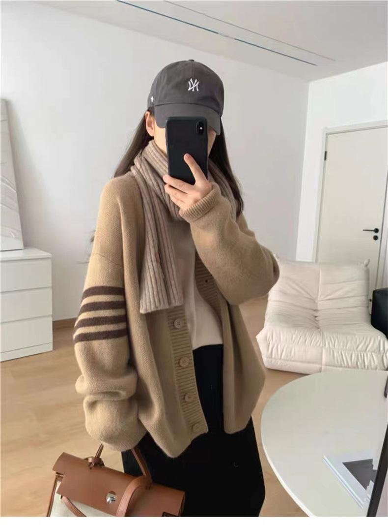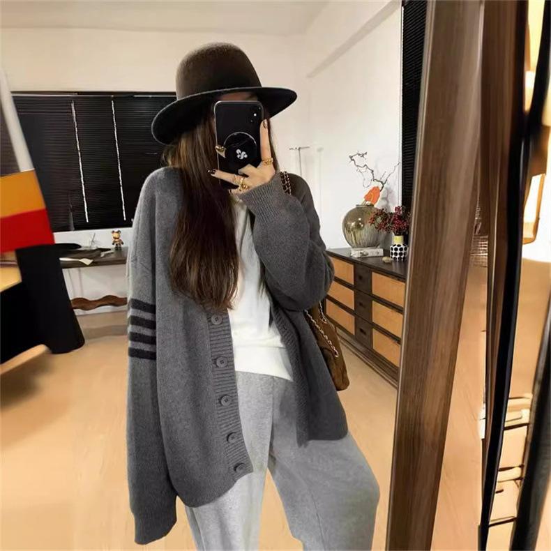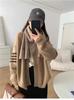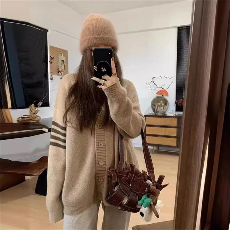2025 Nuevo Otoño e Invierno Cuello en V Cárdigan Tejido con Rayas de Contraste Chaqueta Moda Femenina Casual Versátil Suéter Suelto Trendy