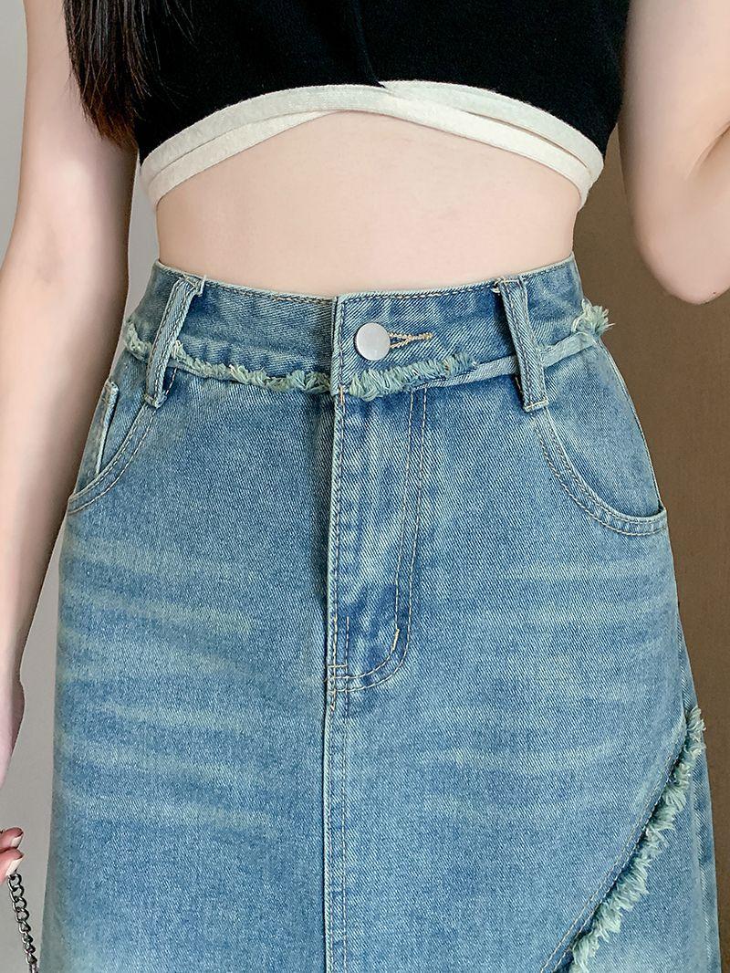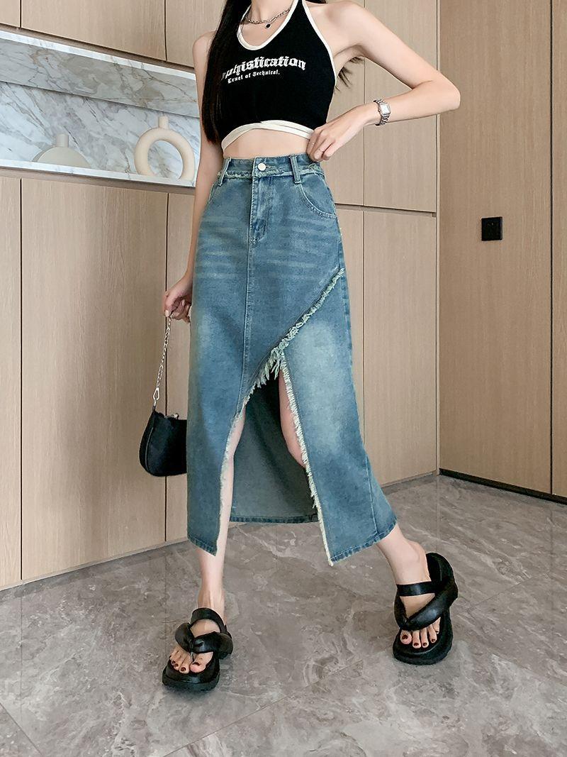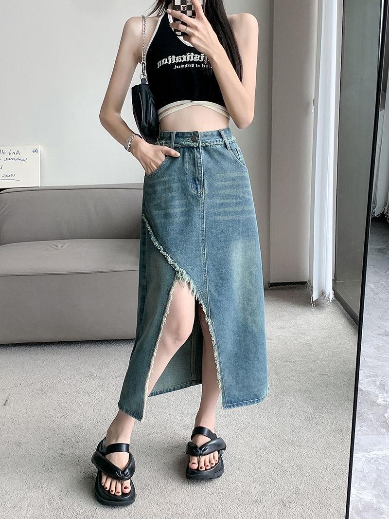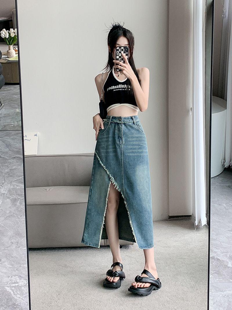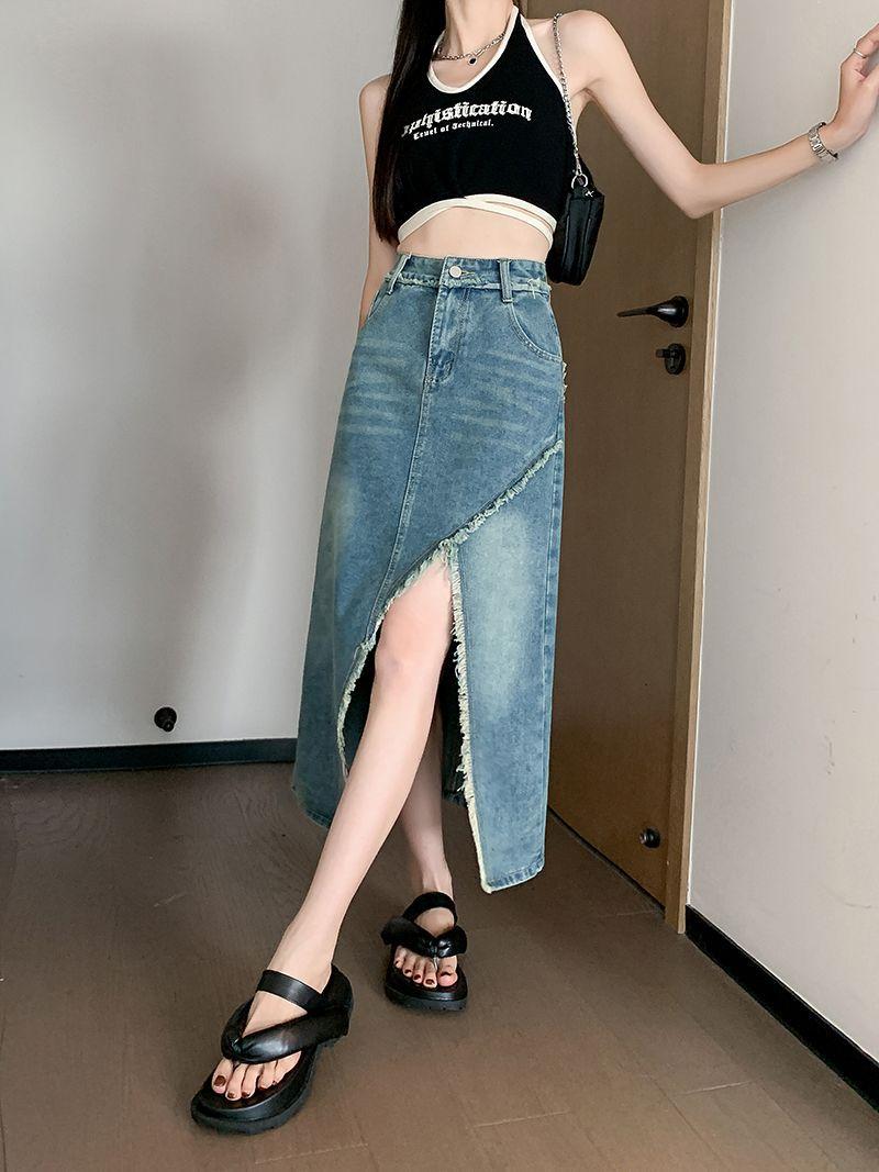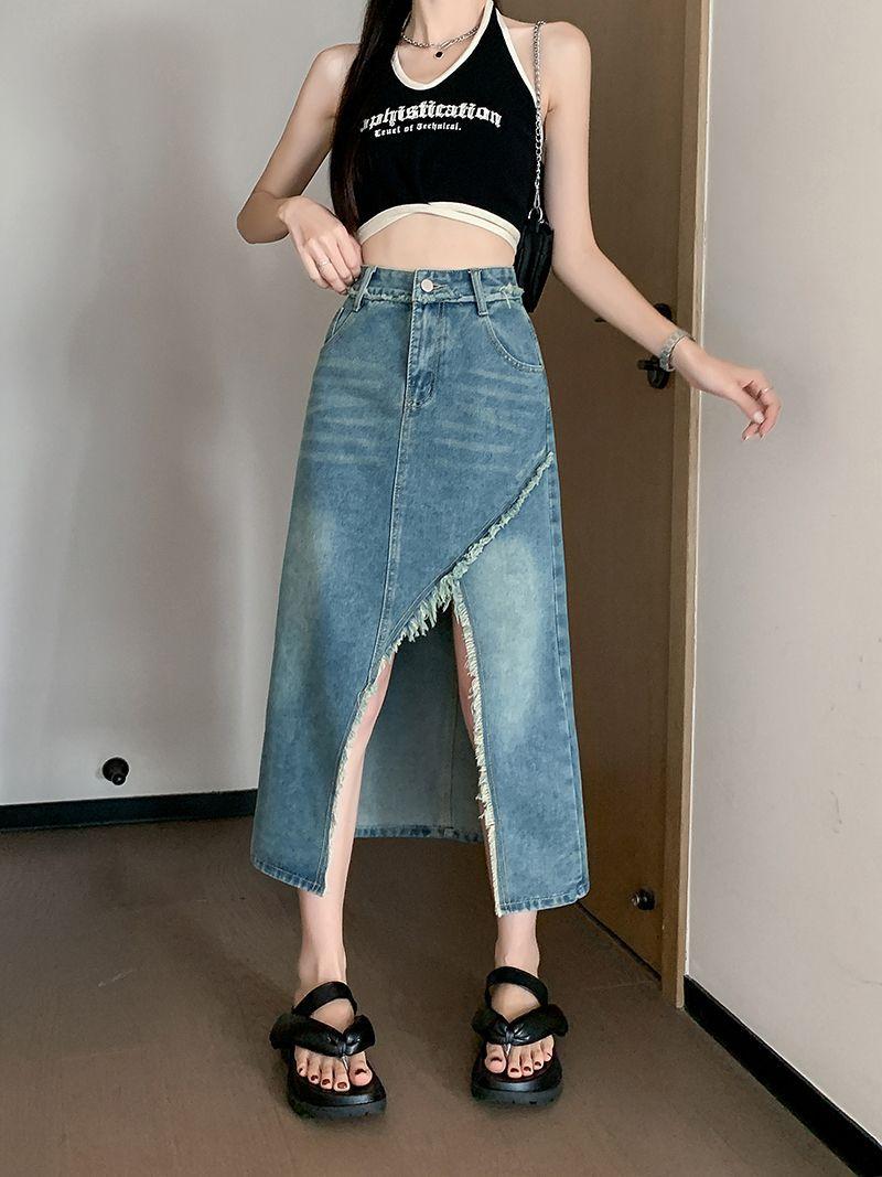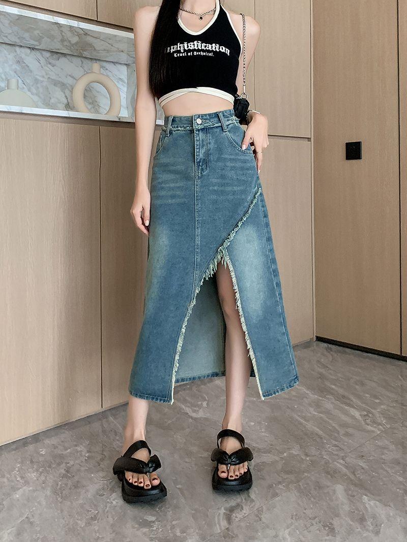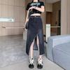 Falda vaquera de cintura alta con abertura para mujer, verano 2024, nueva, de longitud media, con corte en A y caderas cortas.