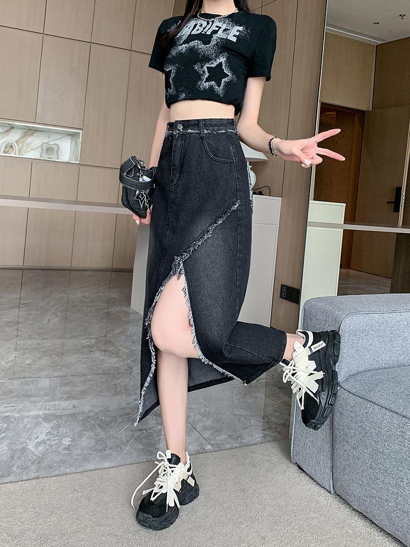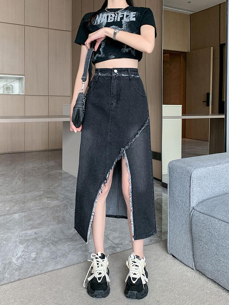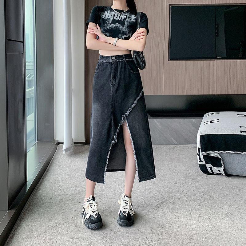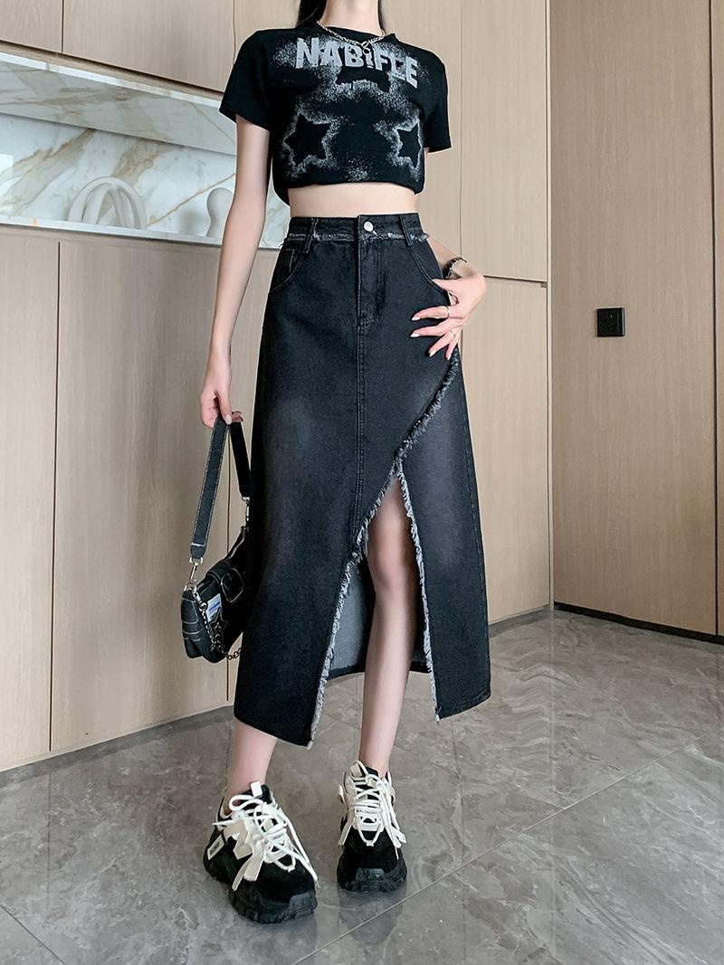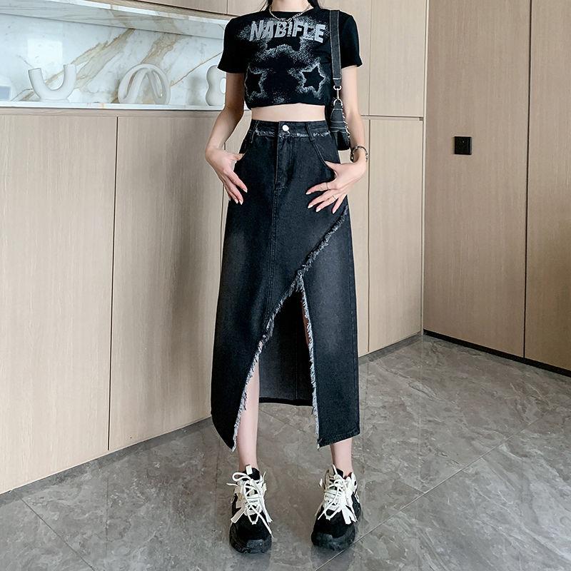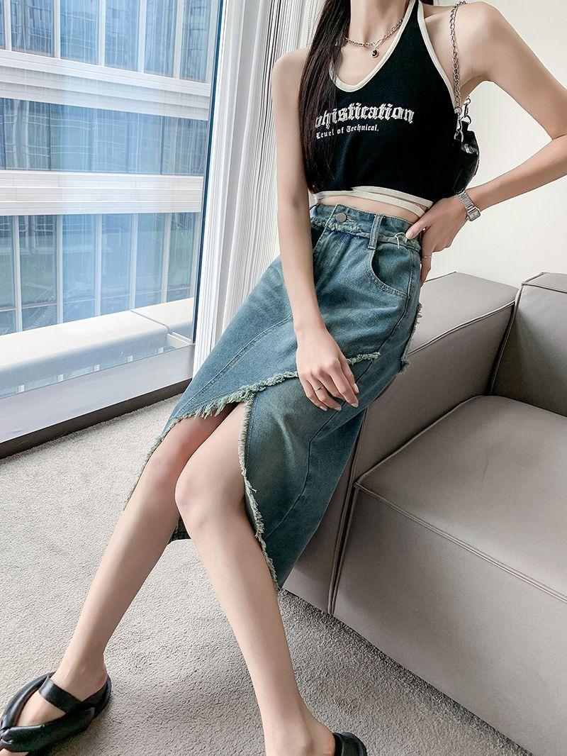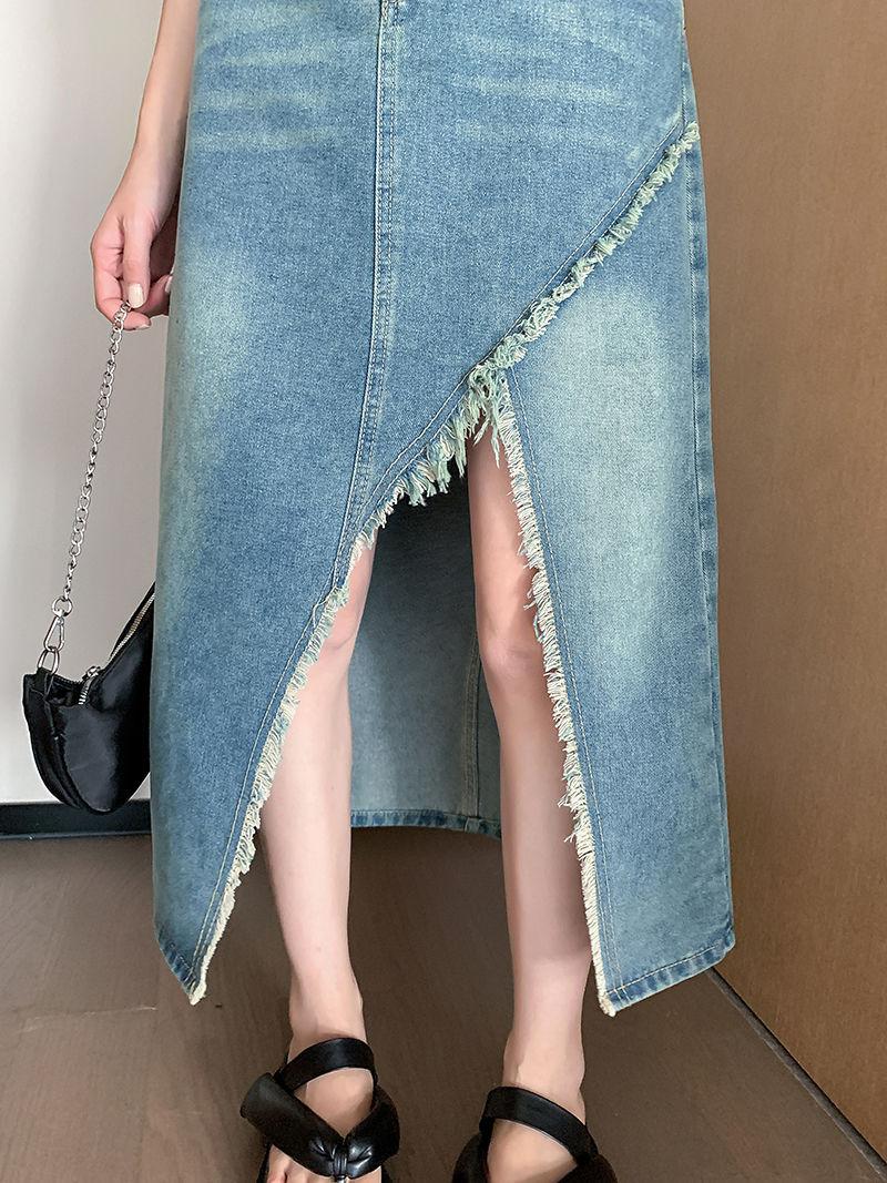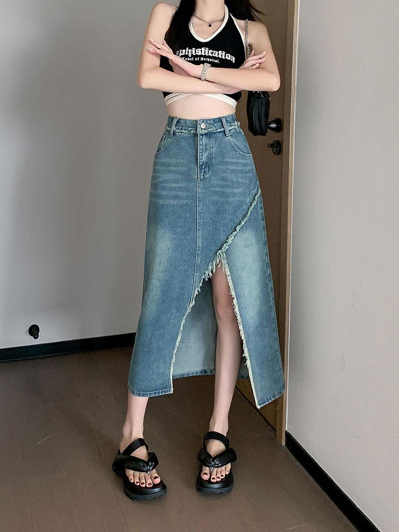 Falda vaquera de cintura alta con abertura para mujer, verano 2024, nueva, de longitud media, con corte en A y caderas cortas.