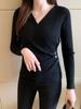 Suéter de punto, camisa base, nuevo estilo, camisa base, cuello en V, clavícula, suéter de manga larga, ajustado, interior corto, hombrera.