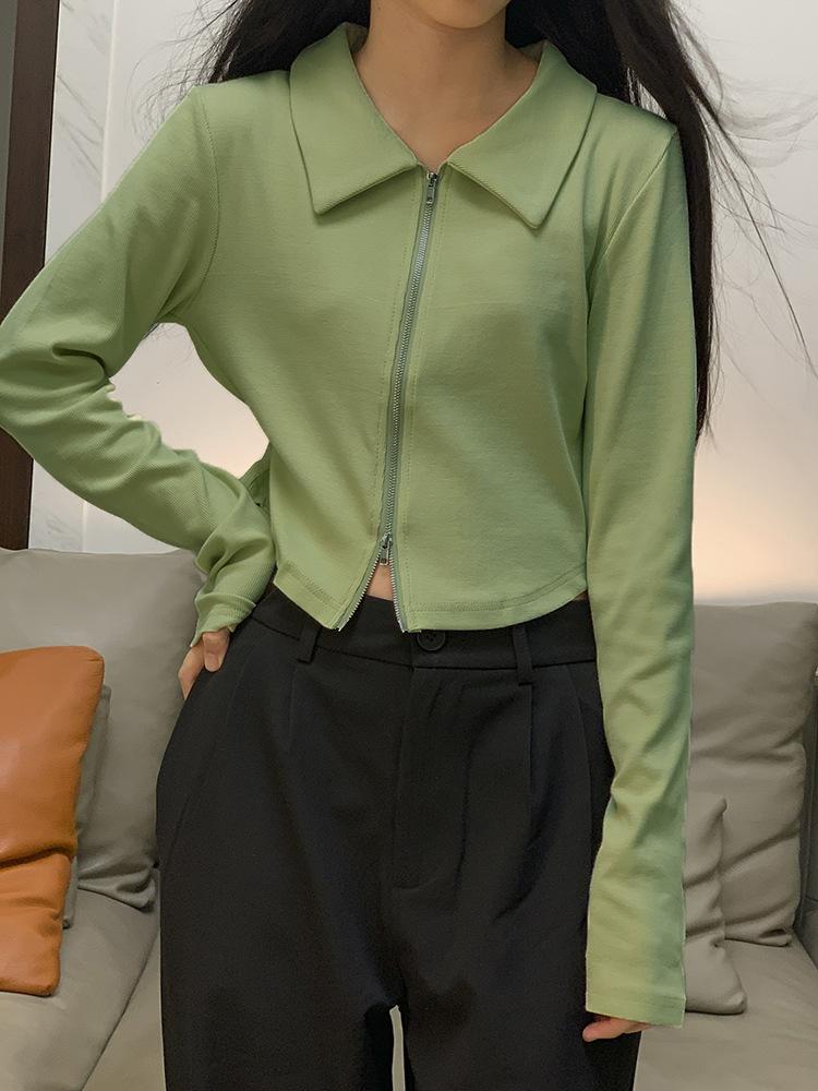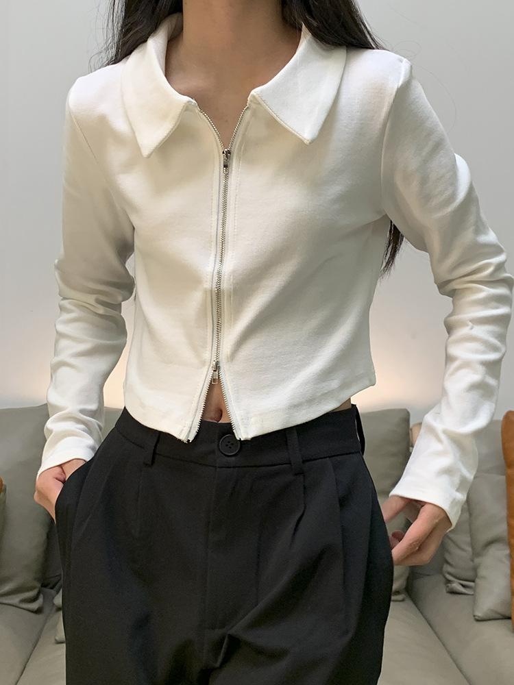 Camiseta Corta de Algodón Puro Estilo Coreano con Solapa, Manga Larga y Hombro Regular para Mujer, Diseño de Color Sólido con Cremallera de Doble Extremo, Top Único y Chic