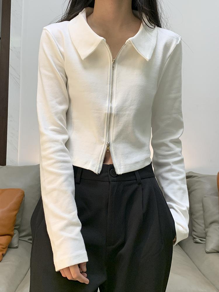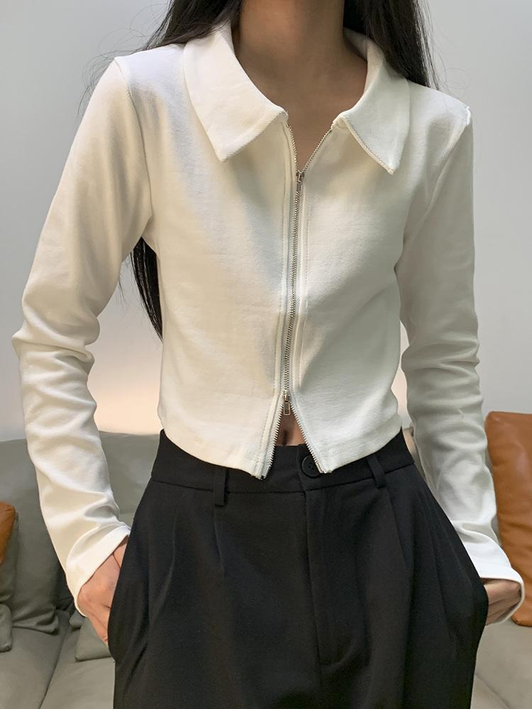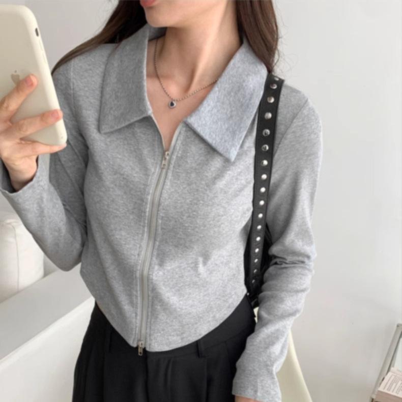 Camiseta de manga larga con solapa de algodón puro versión coreana transfronteriza para mujer, diseño de color sólido, cremallera de doble cabeza, top chic de nicho