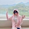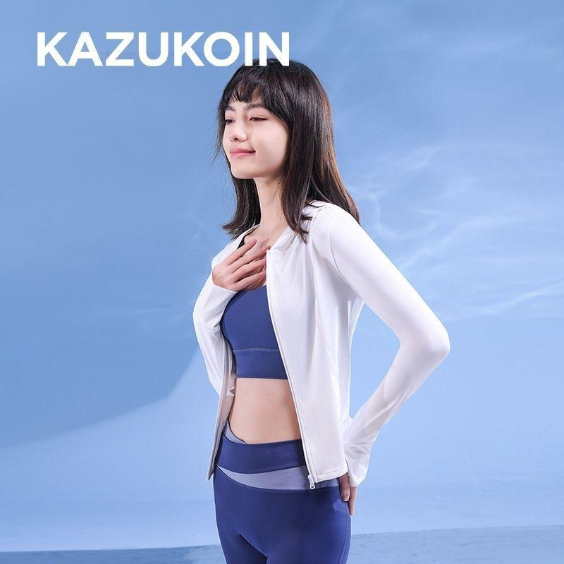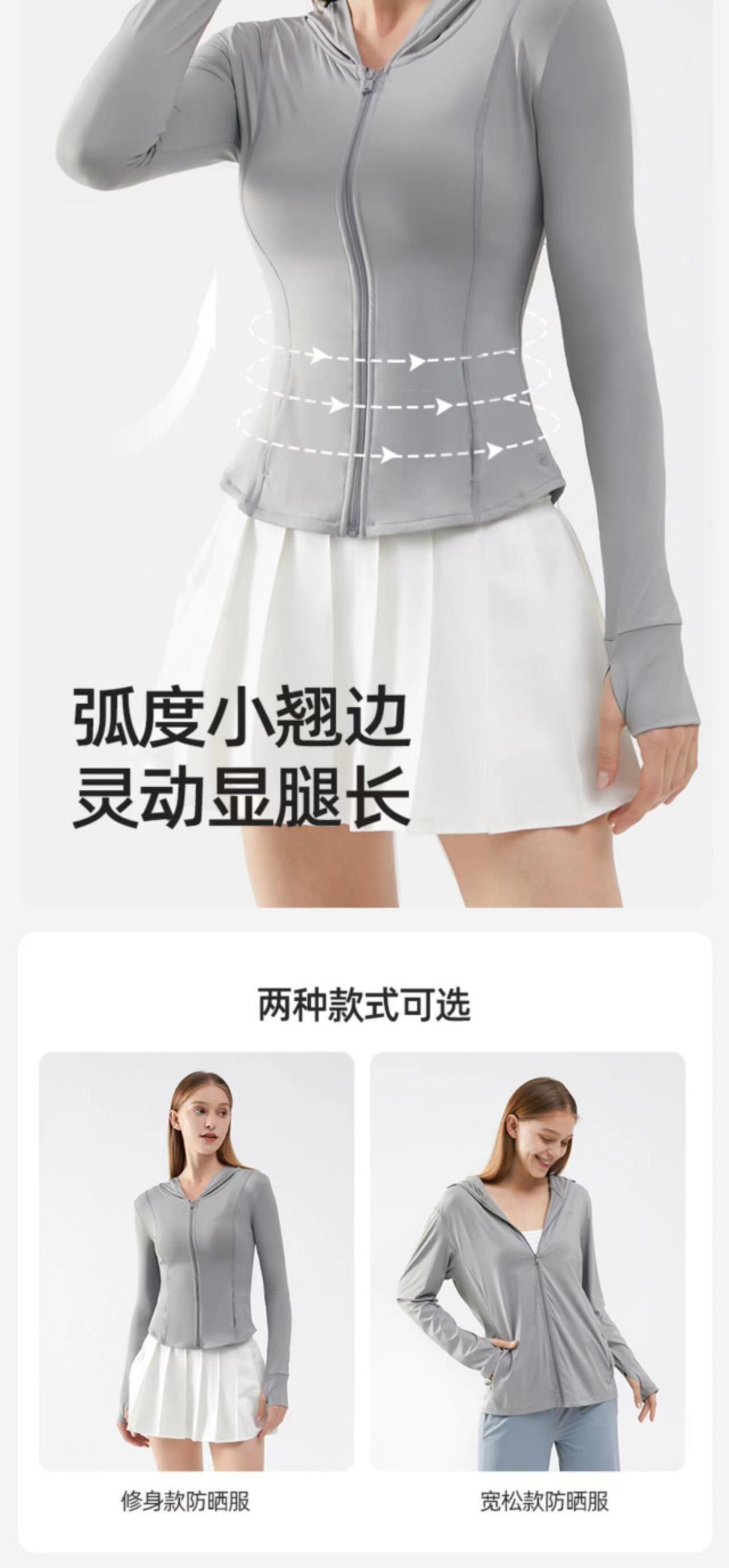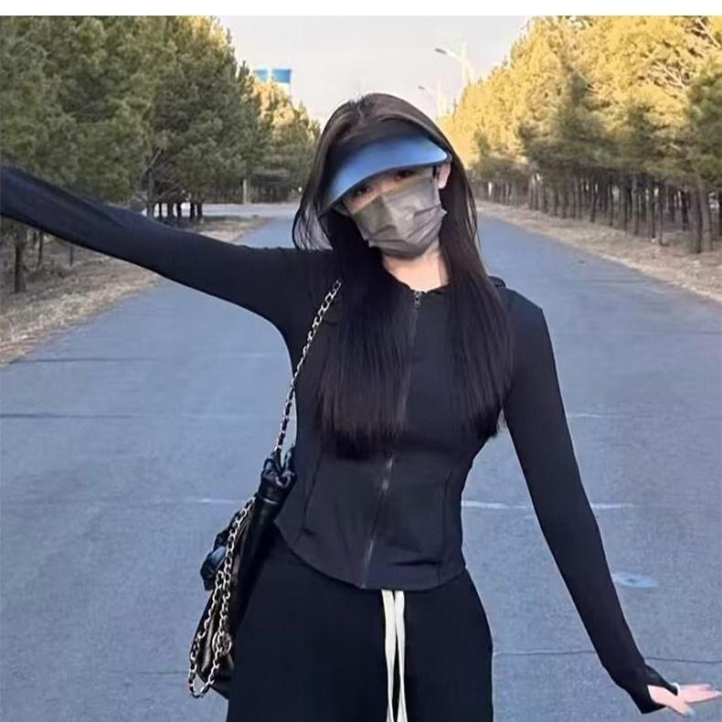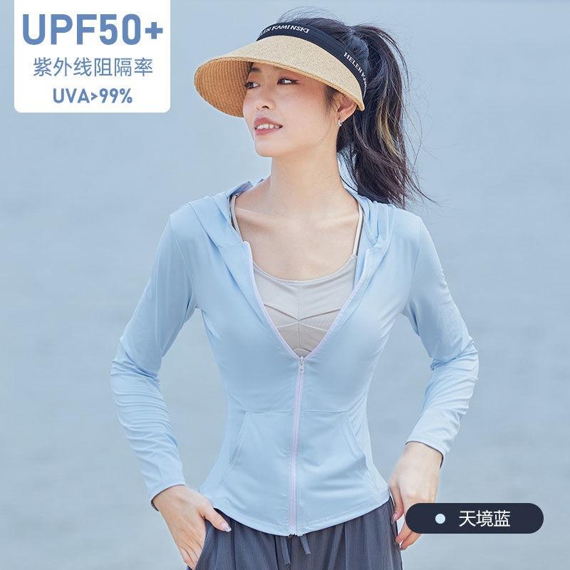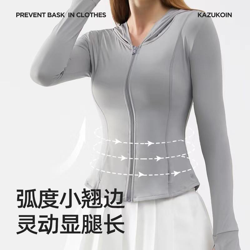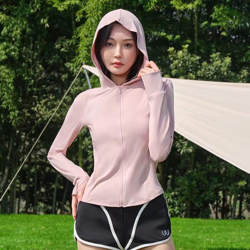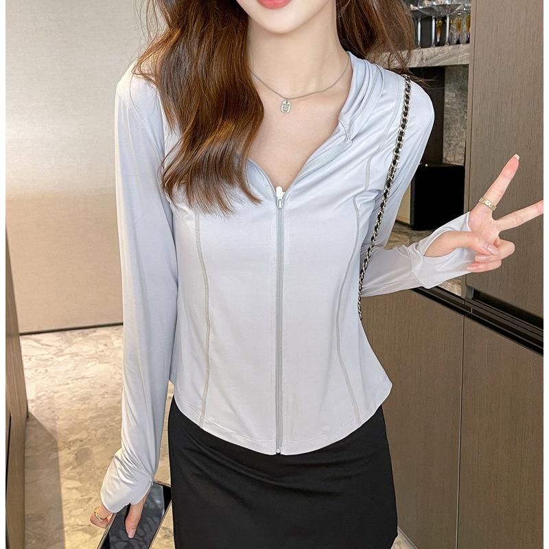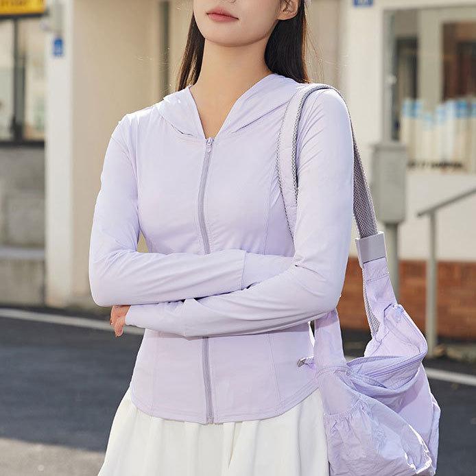 Ropa de protección solar UPF50 para mujer, de verano, con capucha fina de seda helada, ropa de protección solar, corte entallado, para yoga, con sensación de hielo, camisa de protección solar, abrigo, top