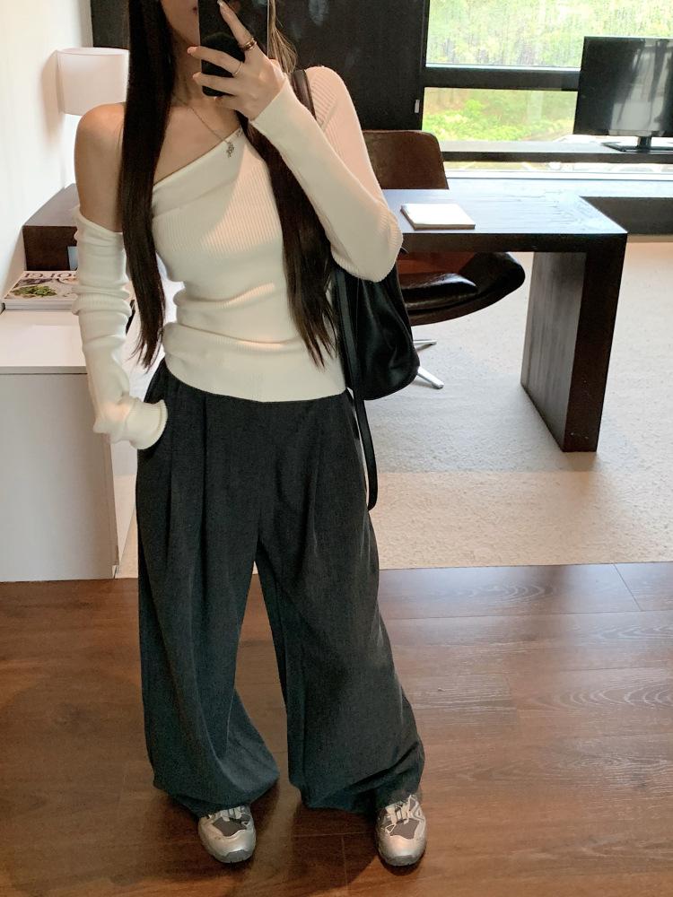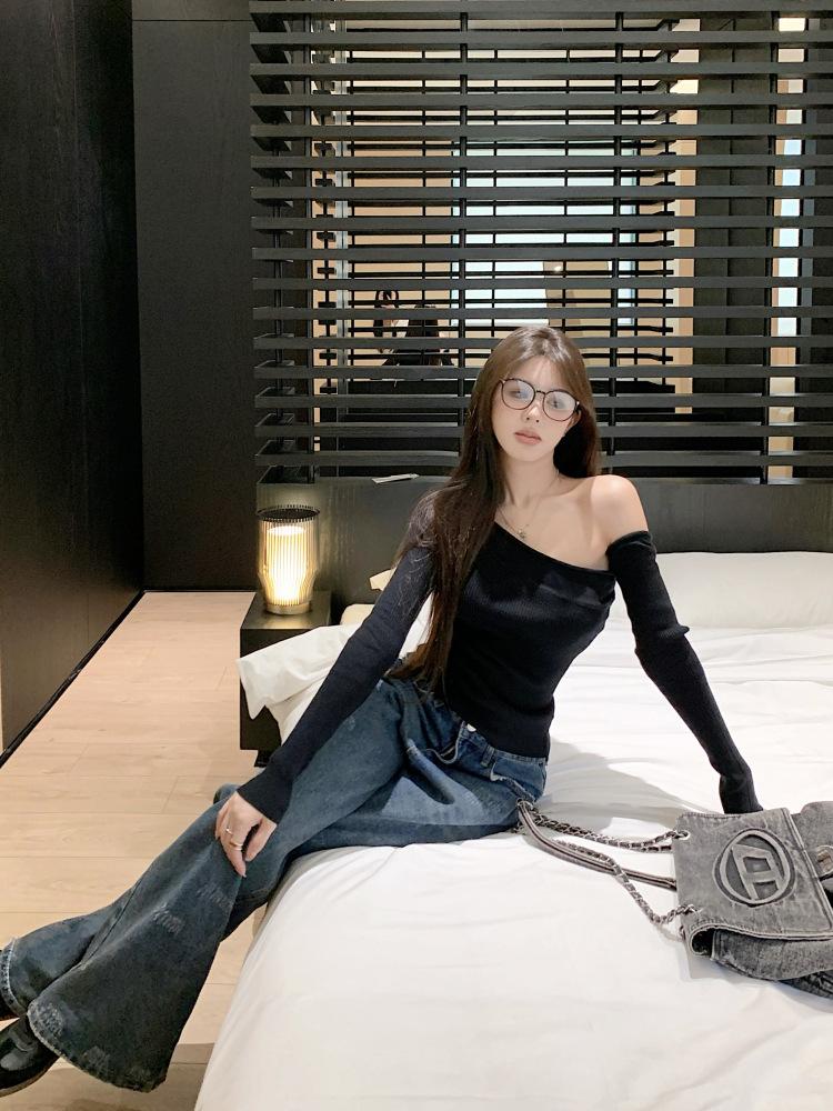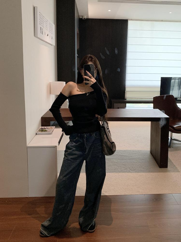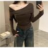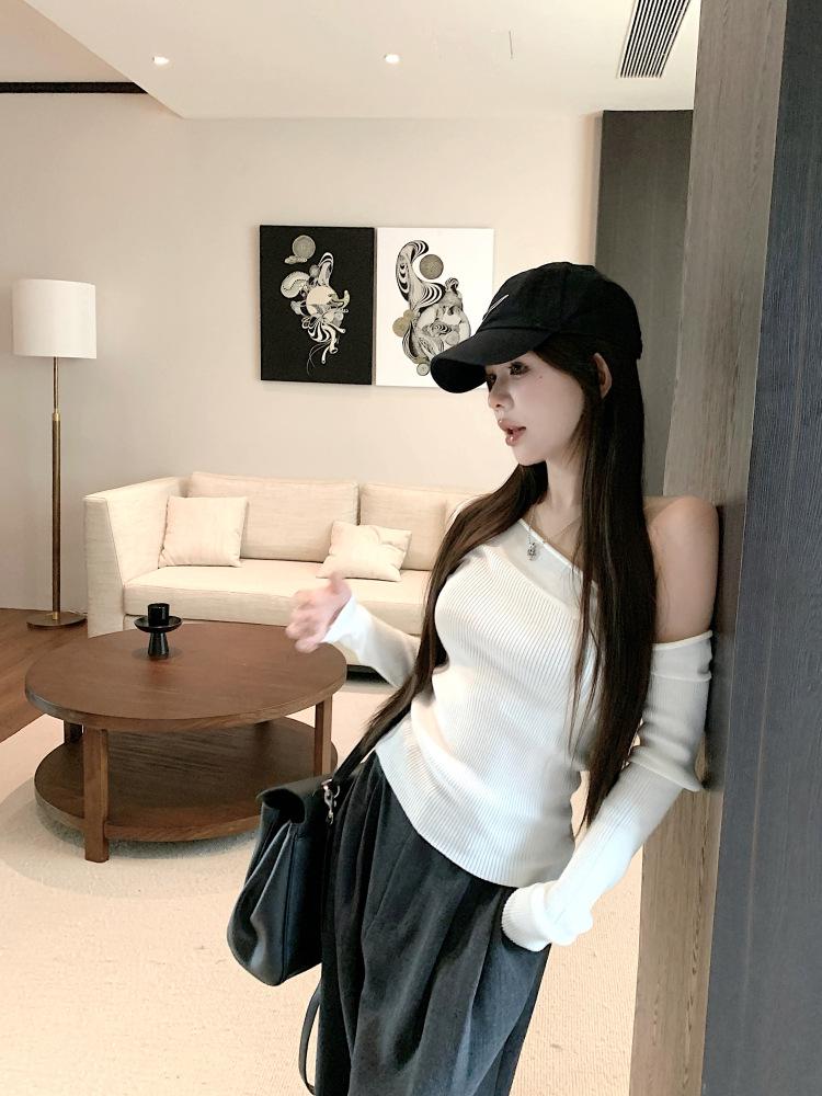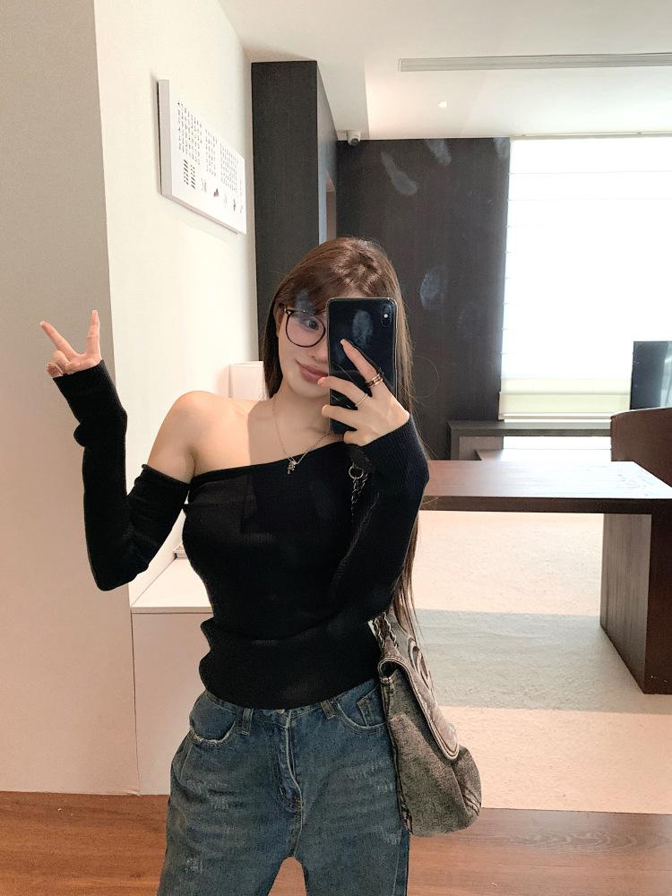 5997# Suéter de punto de hombros descubiertos con cuello oblicuo estilo deseo puro para mujer otoño nuevo diseño ajuste ceñido top corto de chica hot