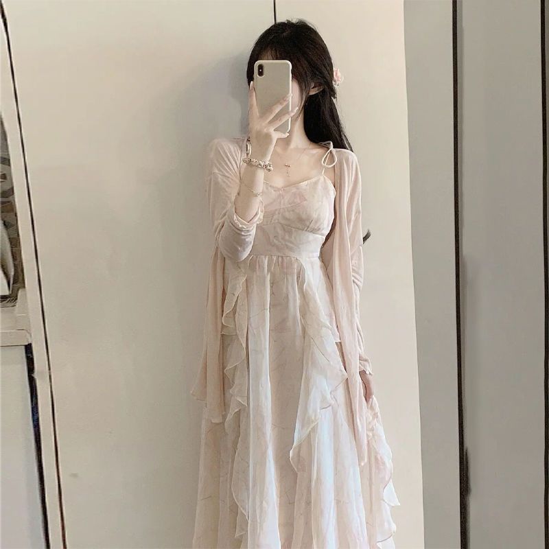 Conjunto de dos piezas para mujer, estilo francés sexy, cárdigan ajustado y vestido con tirantes, verano 2023