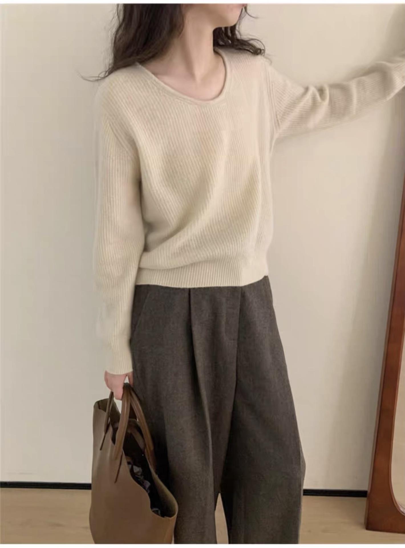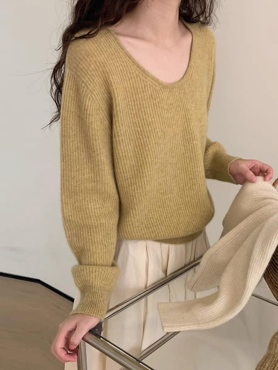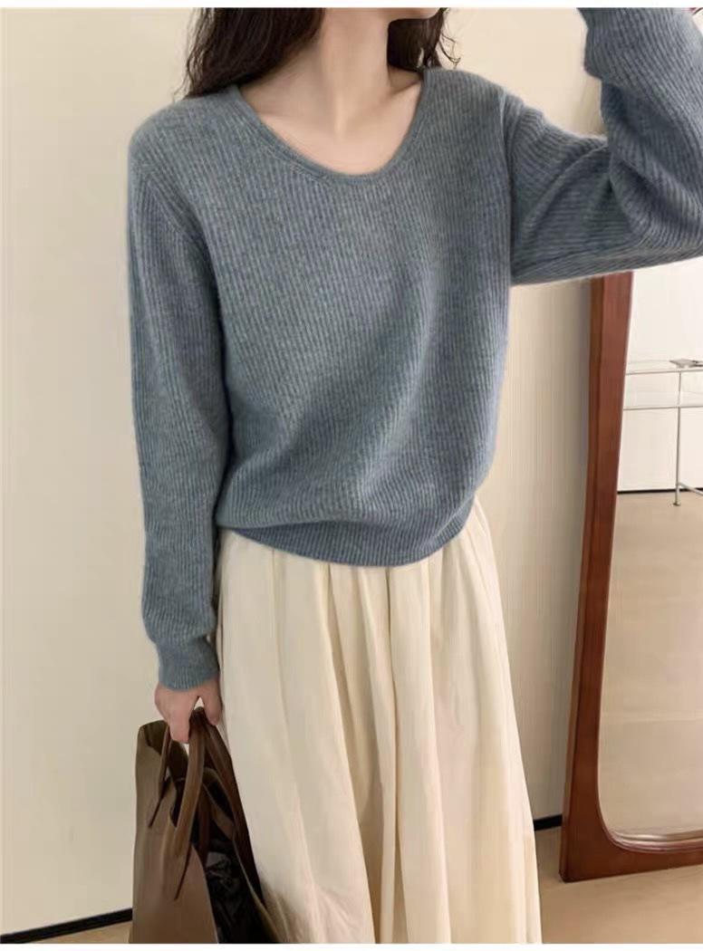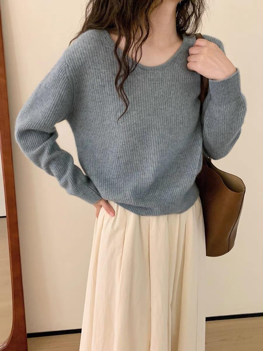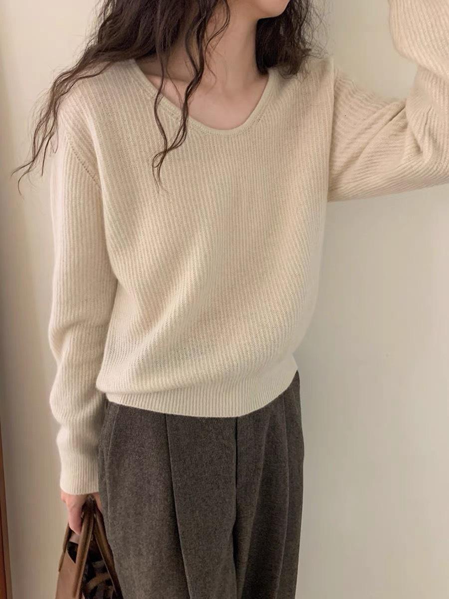 Suéter elegante de lana pura con cuello en U para otoño e invierno, suéter holgado de moda de color sólido, suéter de nicho, camisa interior de punto con base elegante