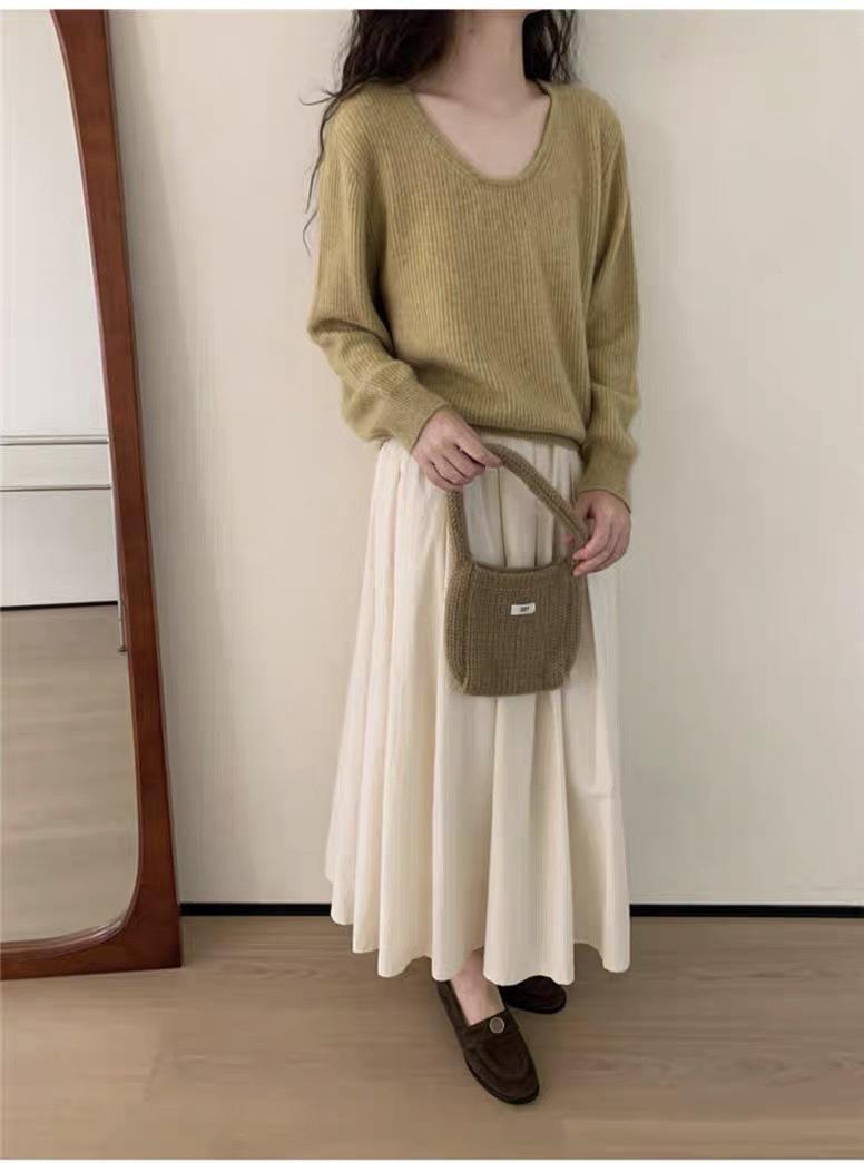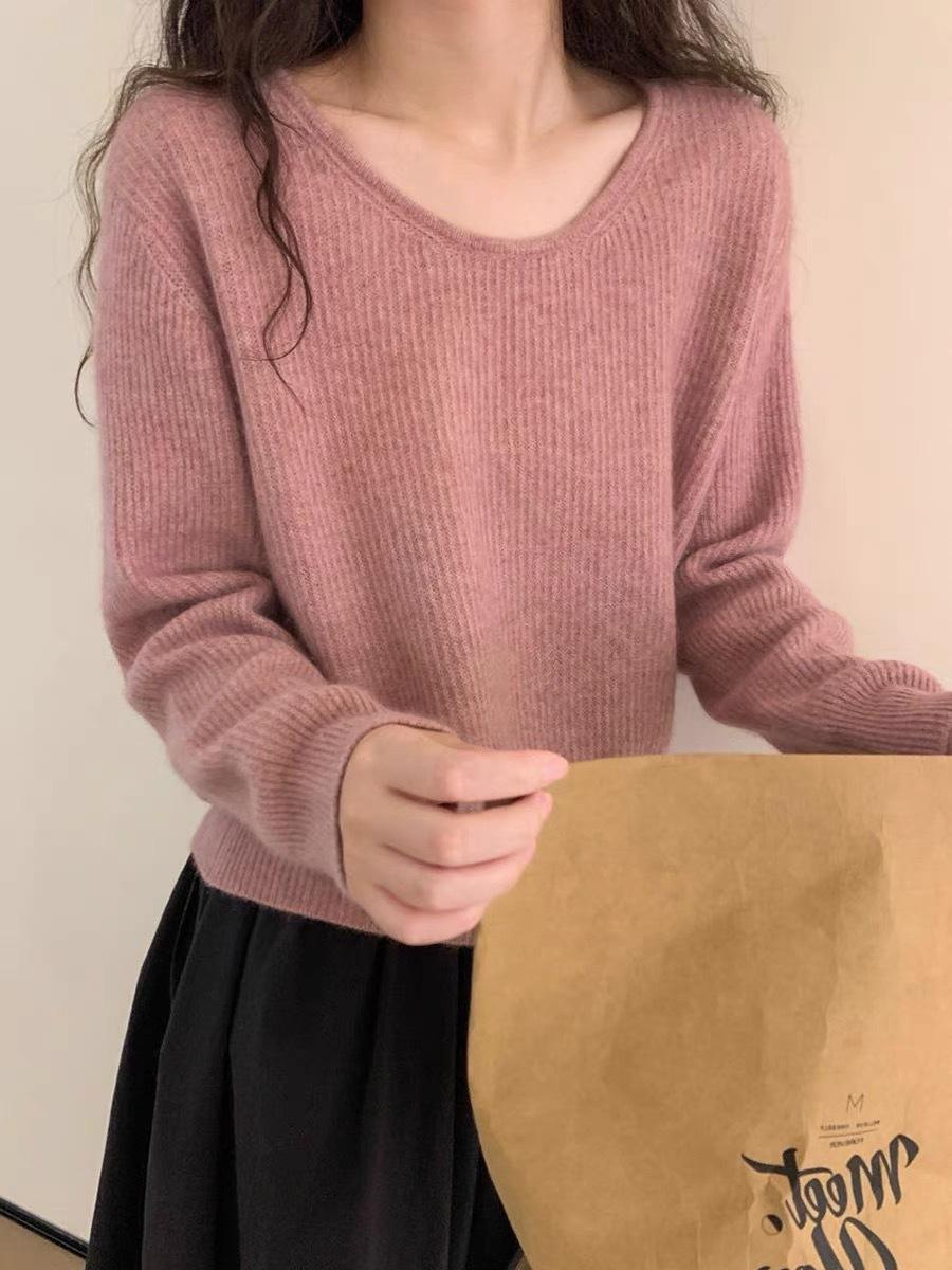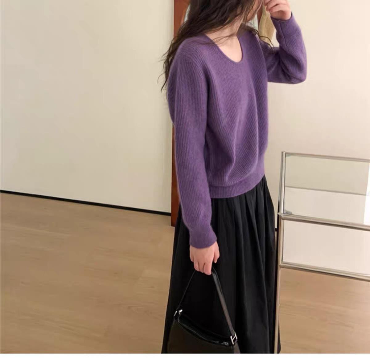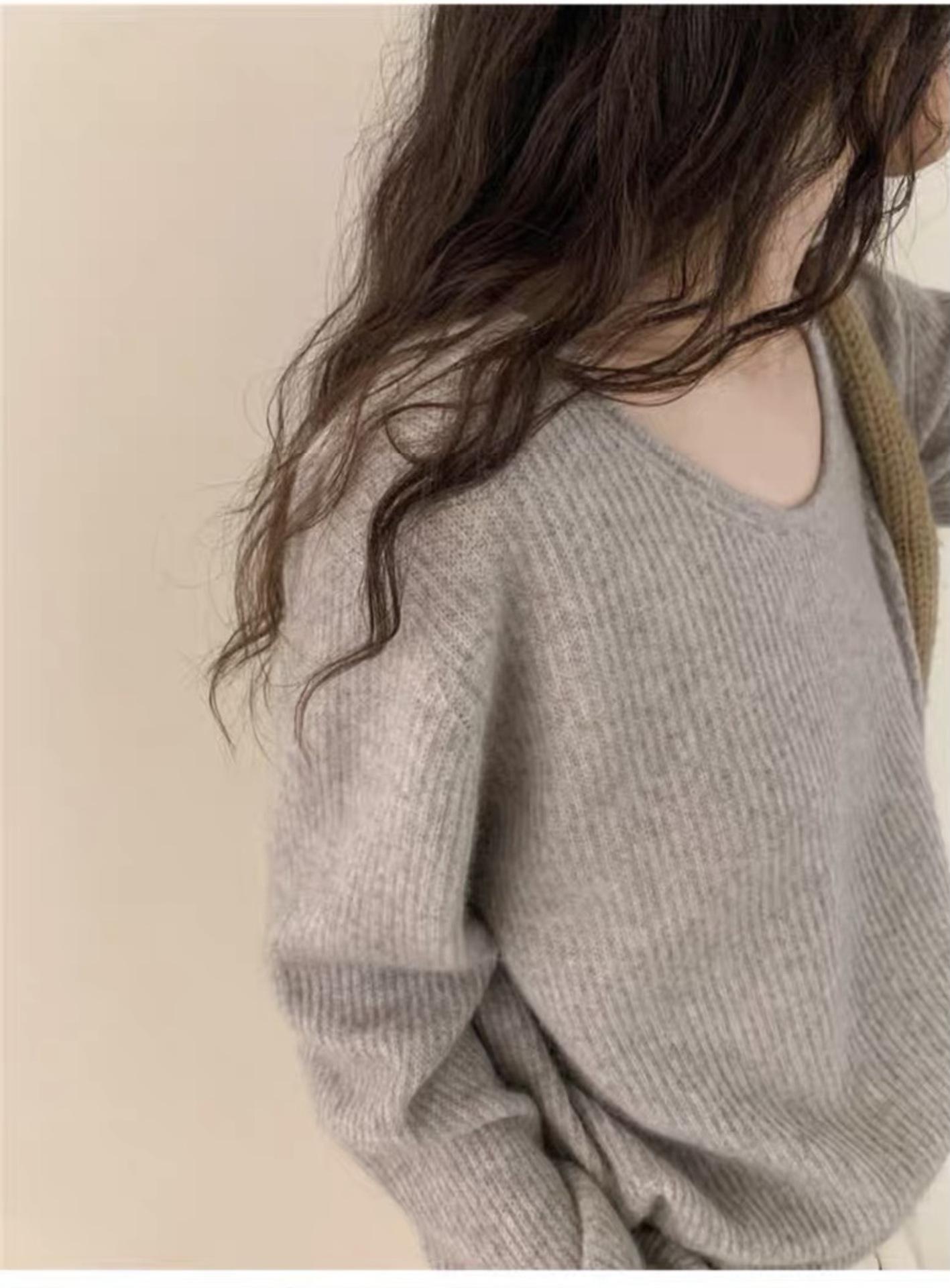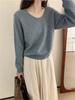 Suéter elegante de lana pura con cuello en U para otoño e invierno, suéter holgado de moda de color sólido, suéter de nicho, camisa interior de punto con base elegante