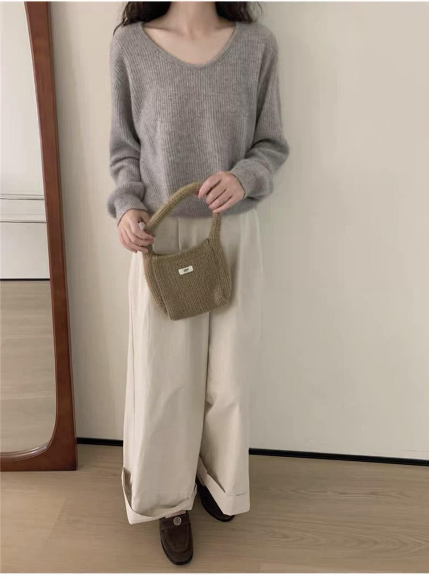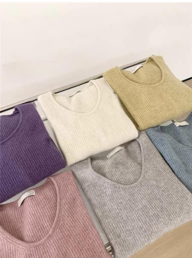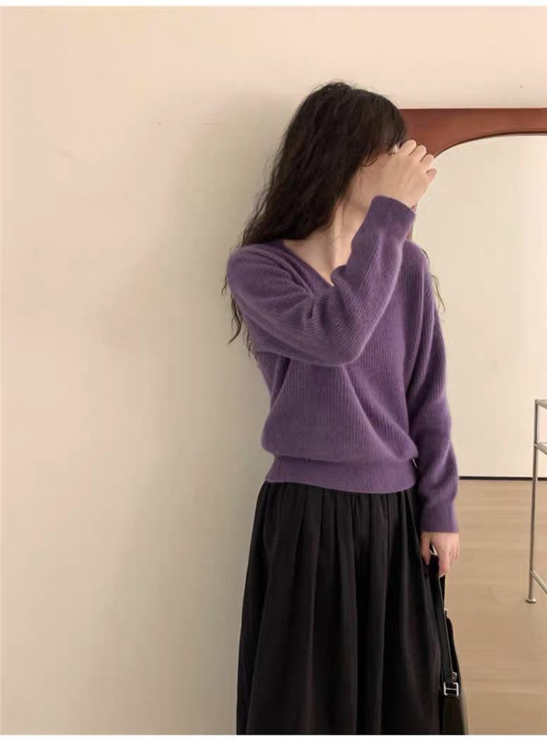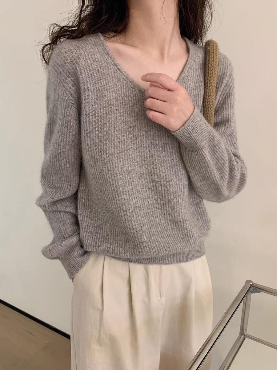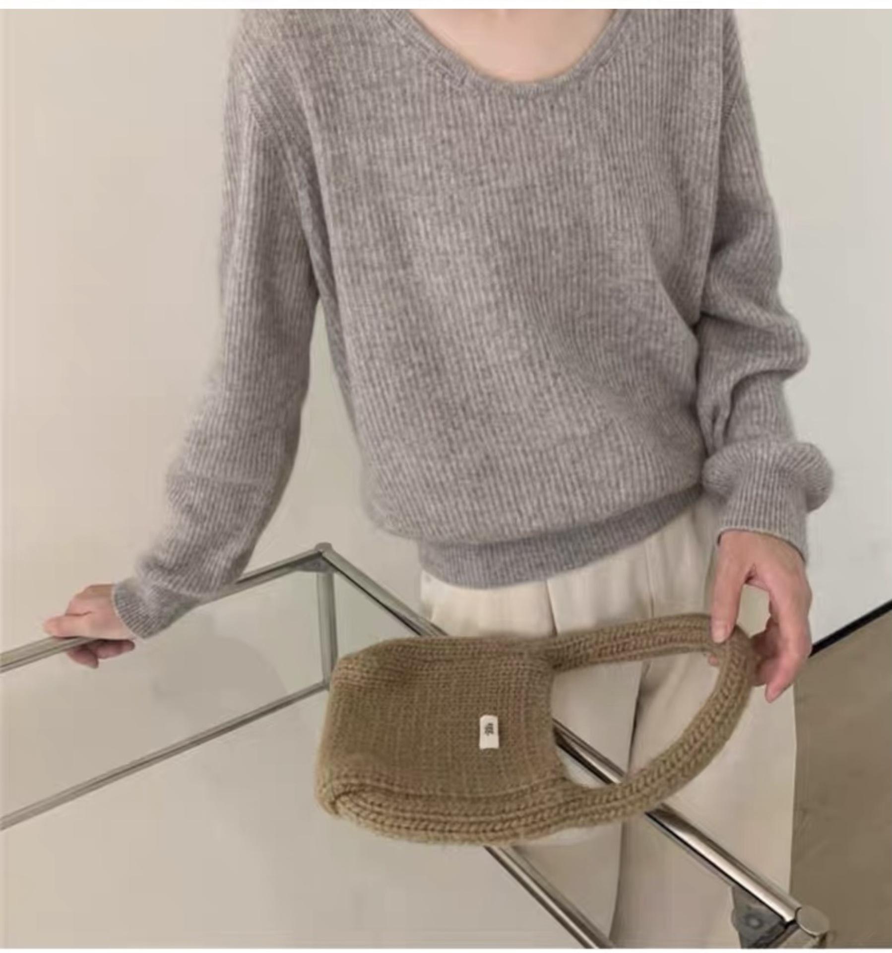 Suéter elegante de lana pura con cuello en U para otoño e invierno, suéter holgado de moda de color sólido, suéter de nicho, camisa interior de punto con base elegante
