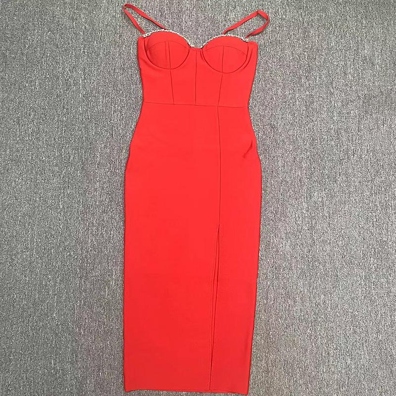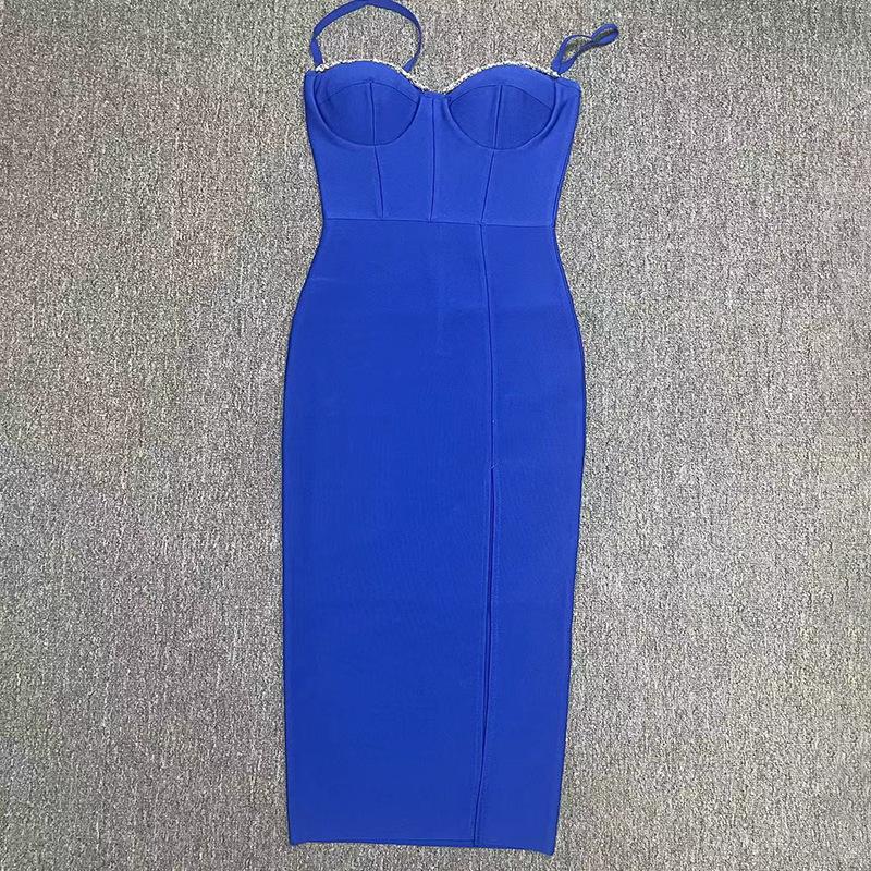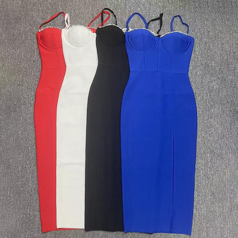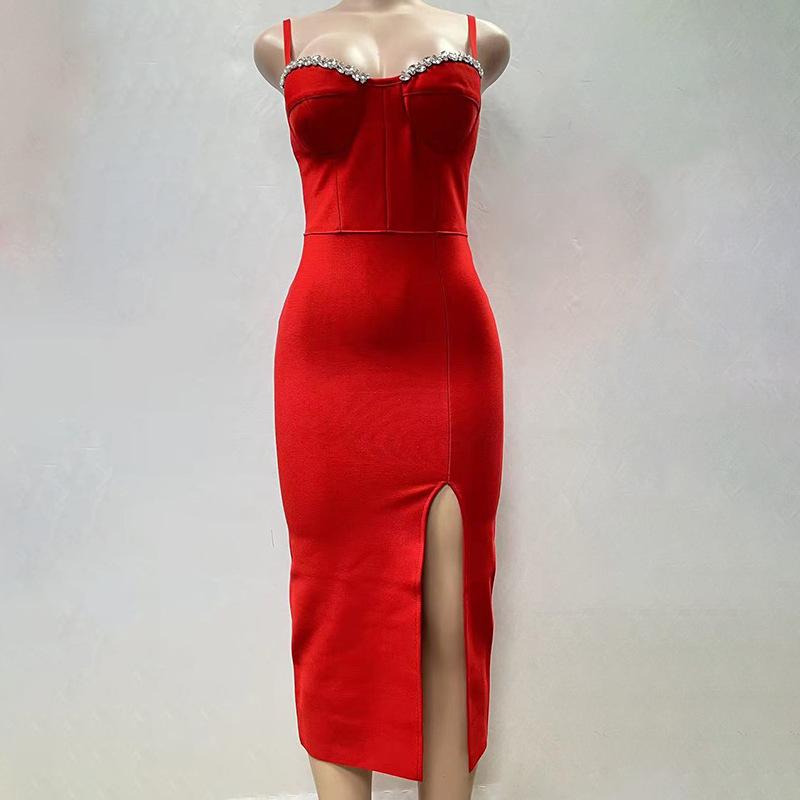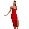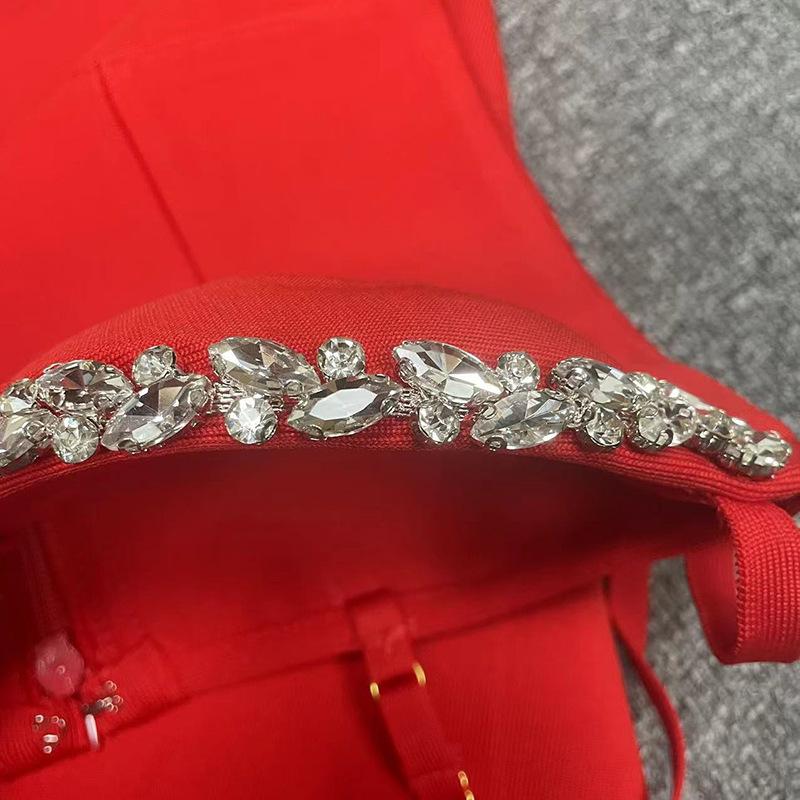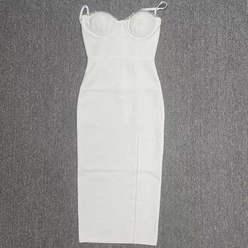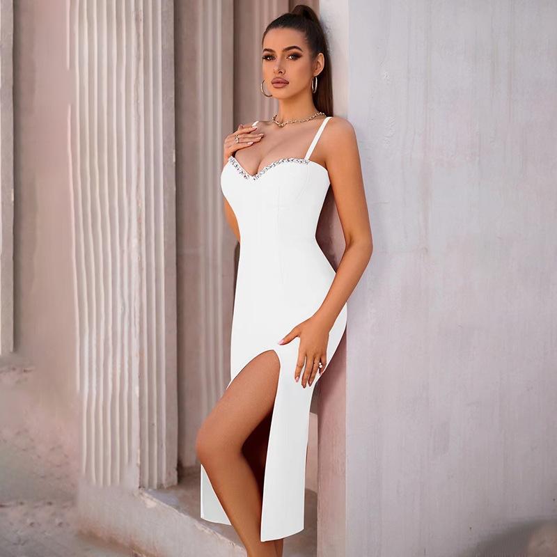 Estilo Europeo y Americano Sexy Vestido Elegante de Pedrería con Abertura sin Mangas Ajustado con Tiras de Vendaje Estilo Celebridad Vestido de Noche Estilo Sexy