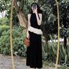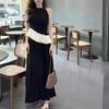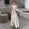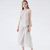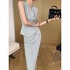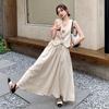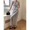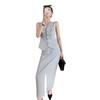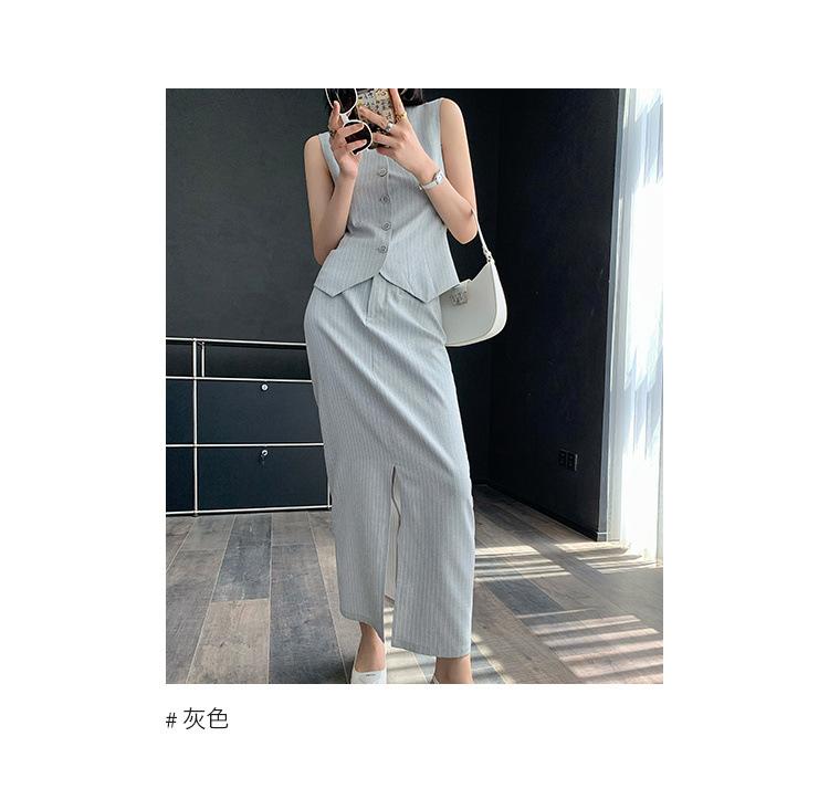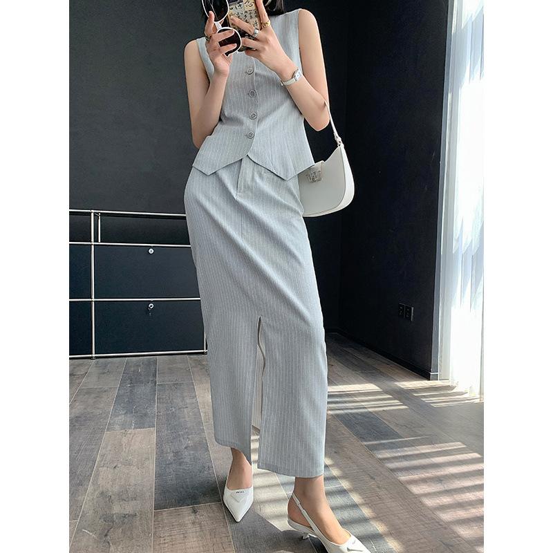 Nuevo Traje de Dos Piezas a Rayas Grises para Mujer Verano Traje sin Mangas Chaleco Pantalones de Pierna Ancha Cintura Alta Falda con Abertura