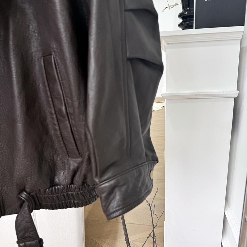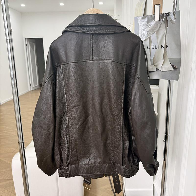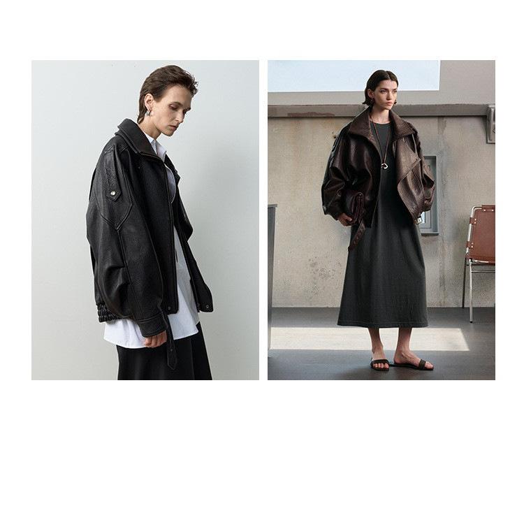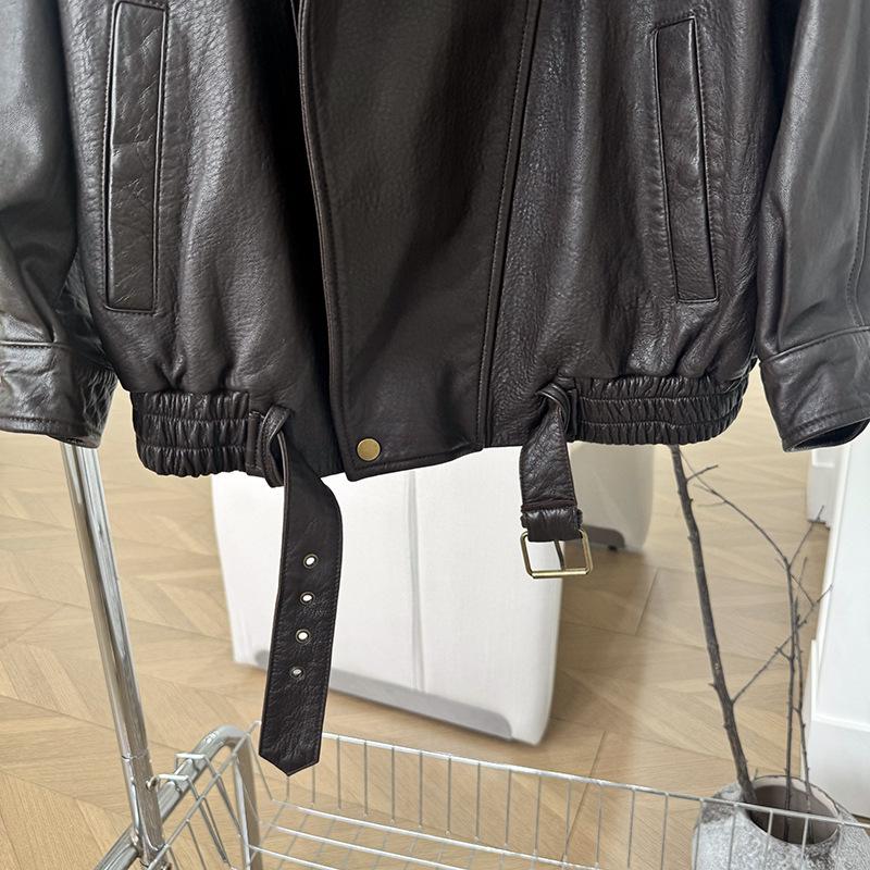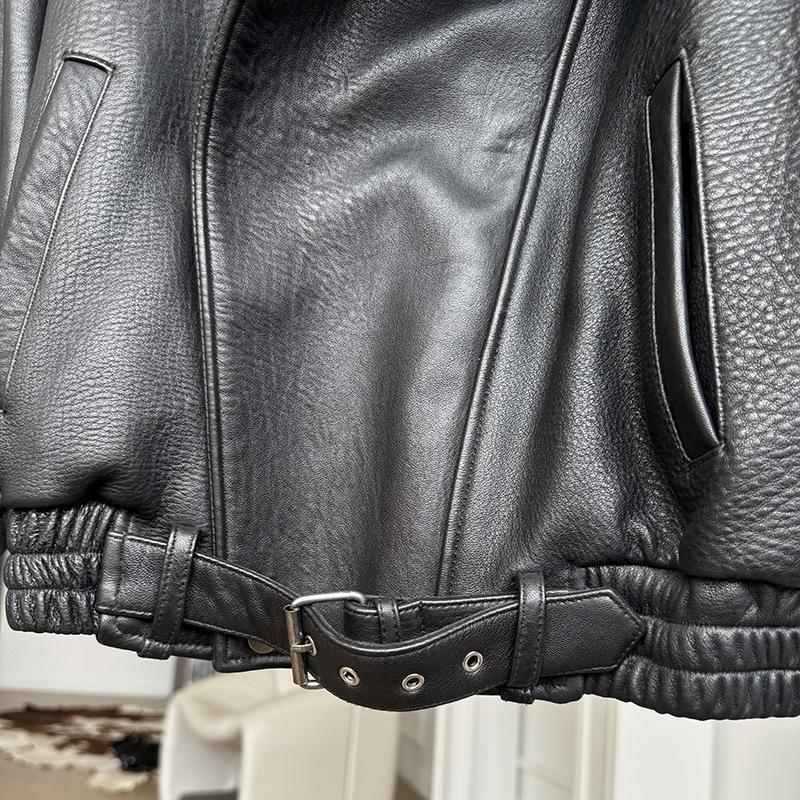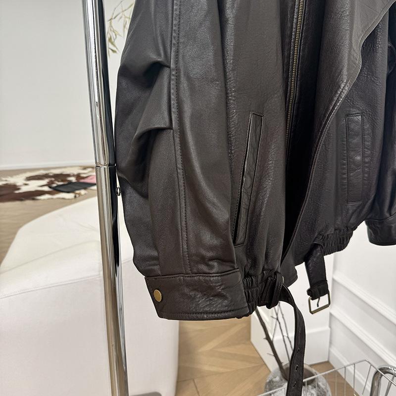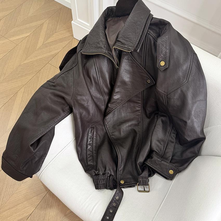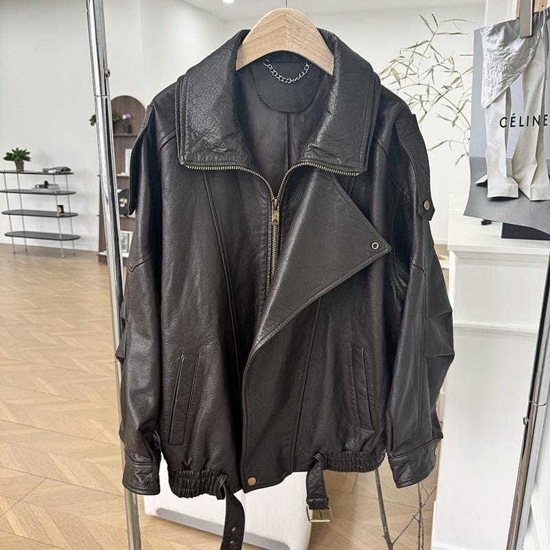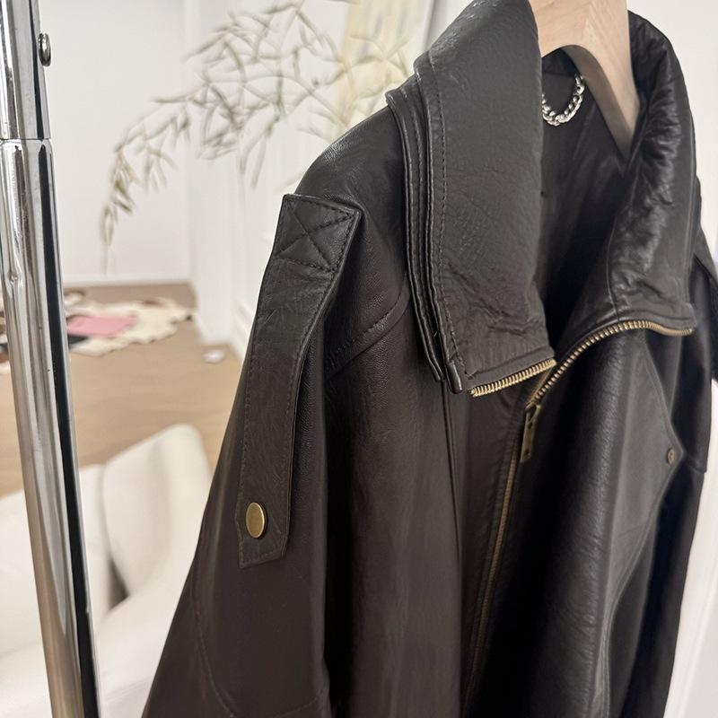 Yang Shulin Y * L Abrigo de Cuero de Otoño para Mujer Holgado Perfil Retro Industria Pesada Cuero de Cordero Burbuja Chaqueta de Aviador