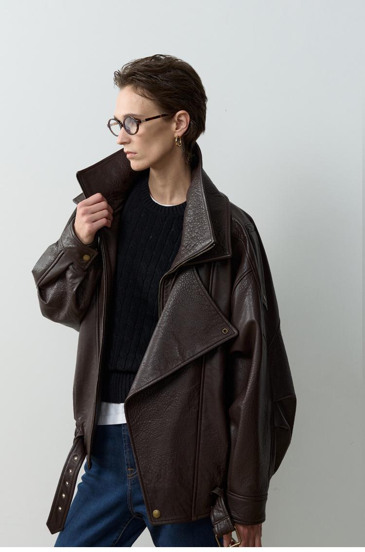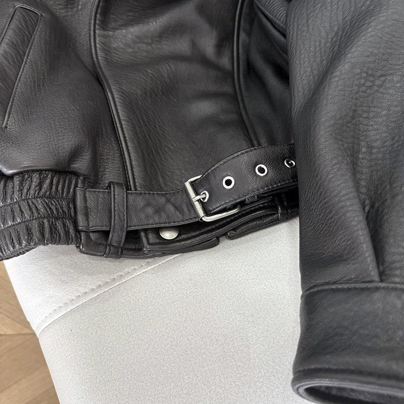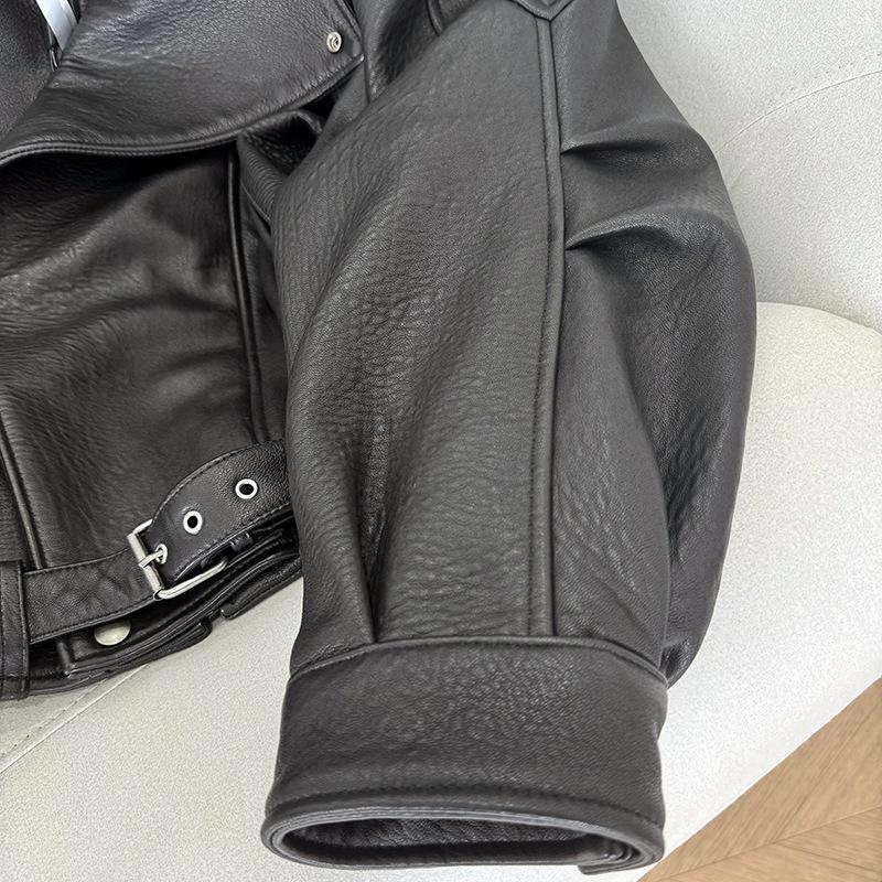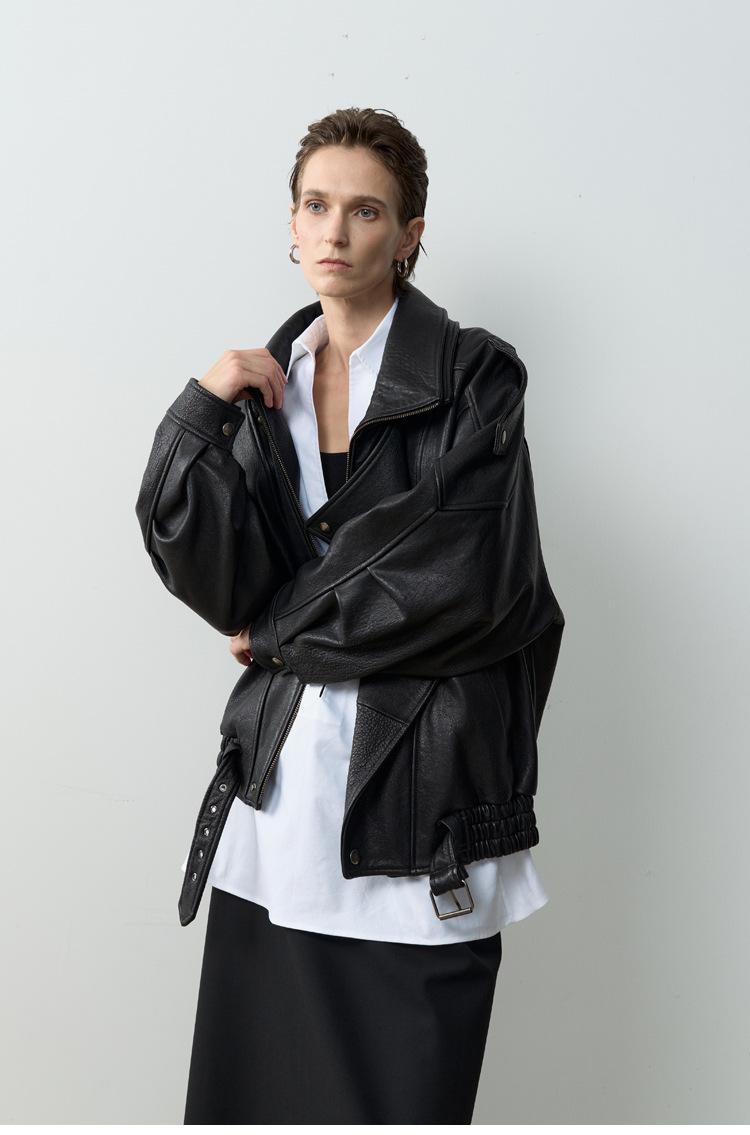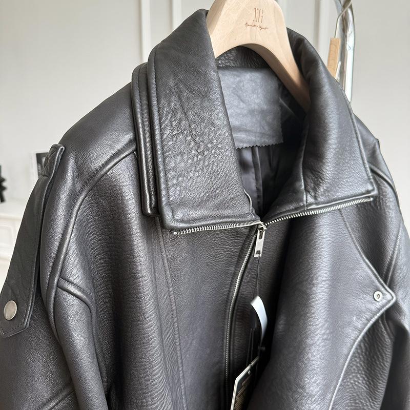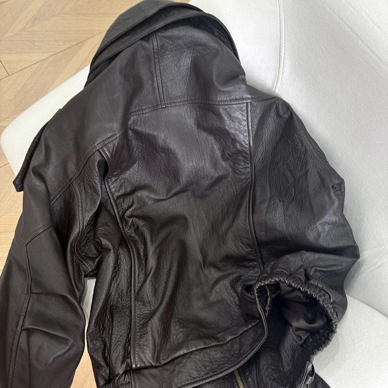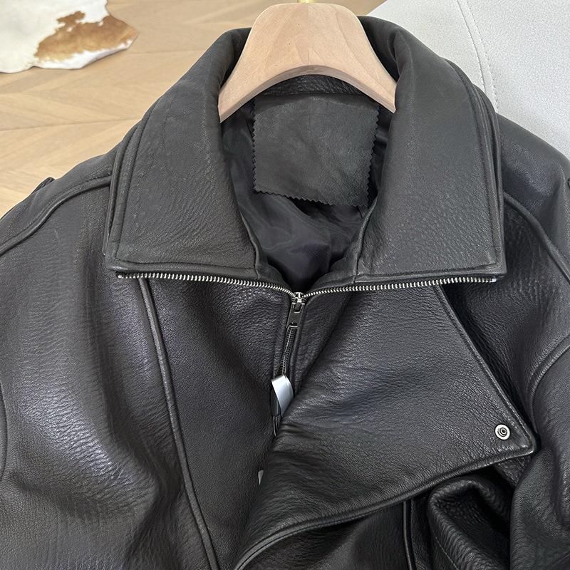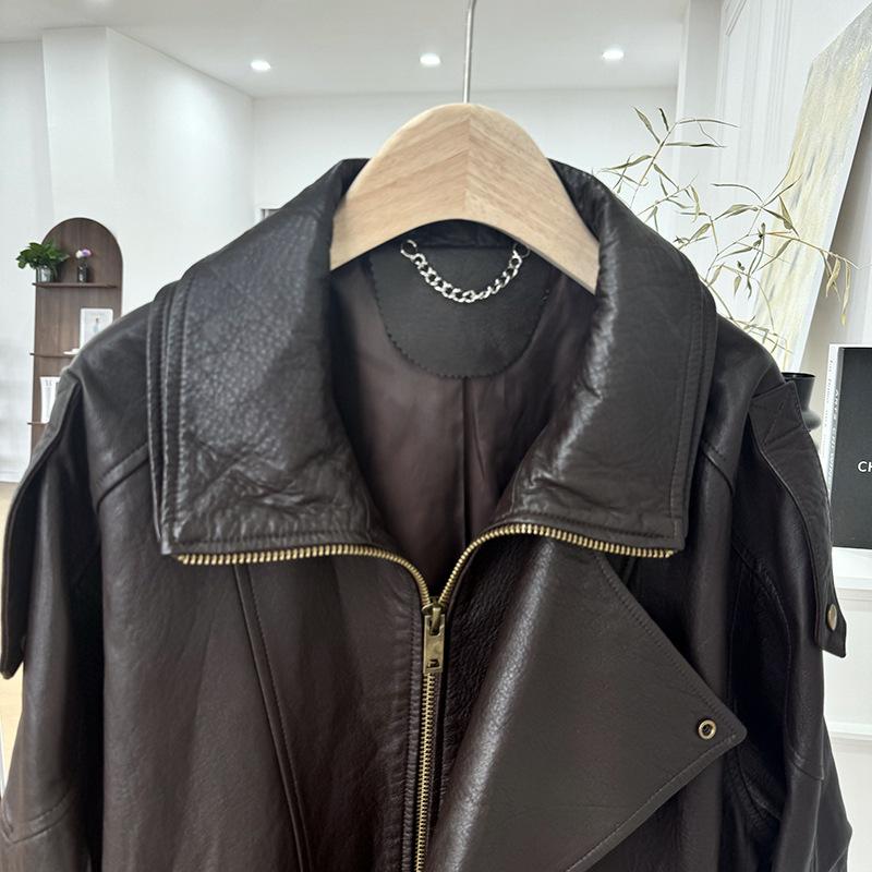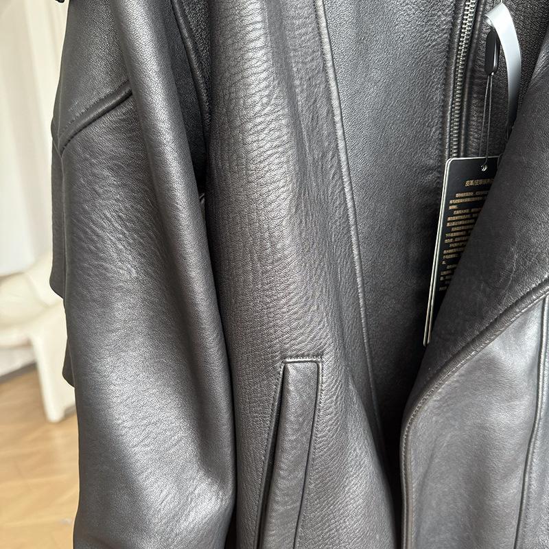 Yang Shulin Y * L Abrigo de Cuero de Otoño para Mujer Holgado Perfil Retro Industria Pesada Cuero de Cordero Burbuja Chaqueta de Aviador