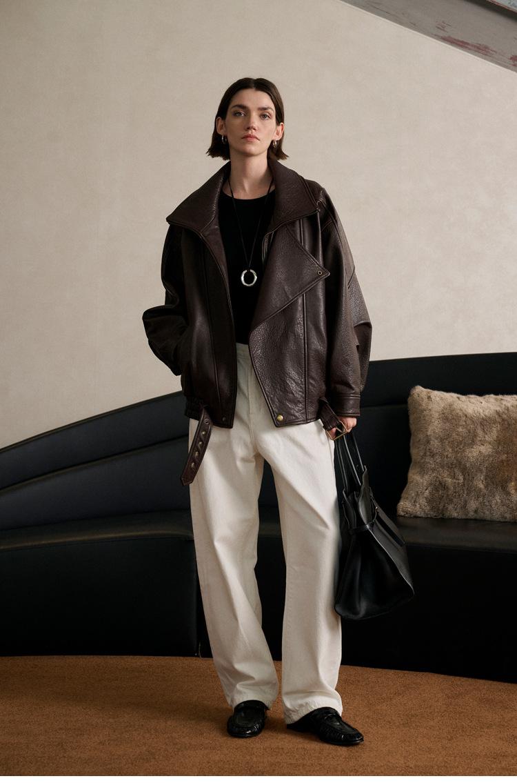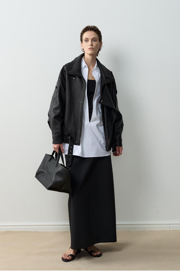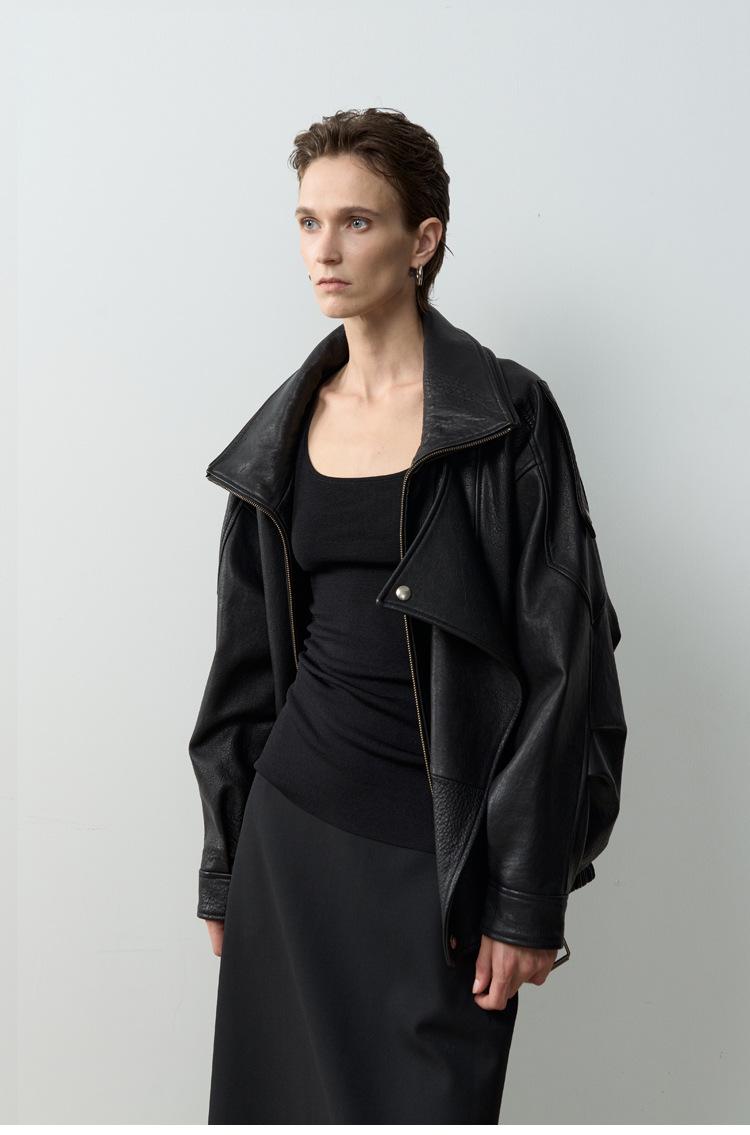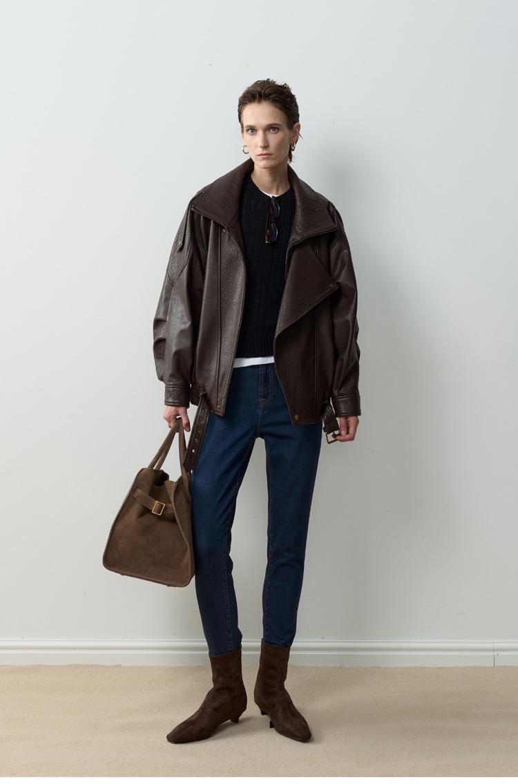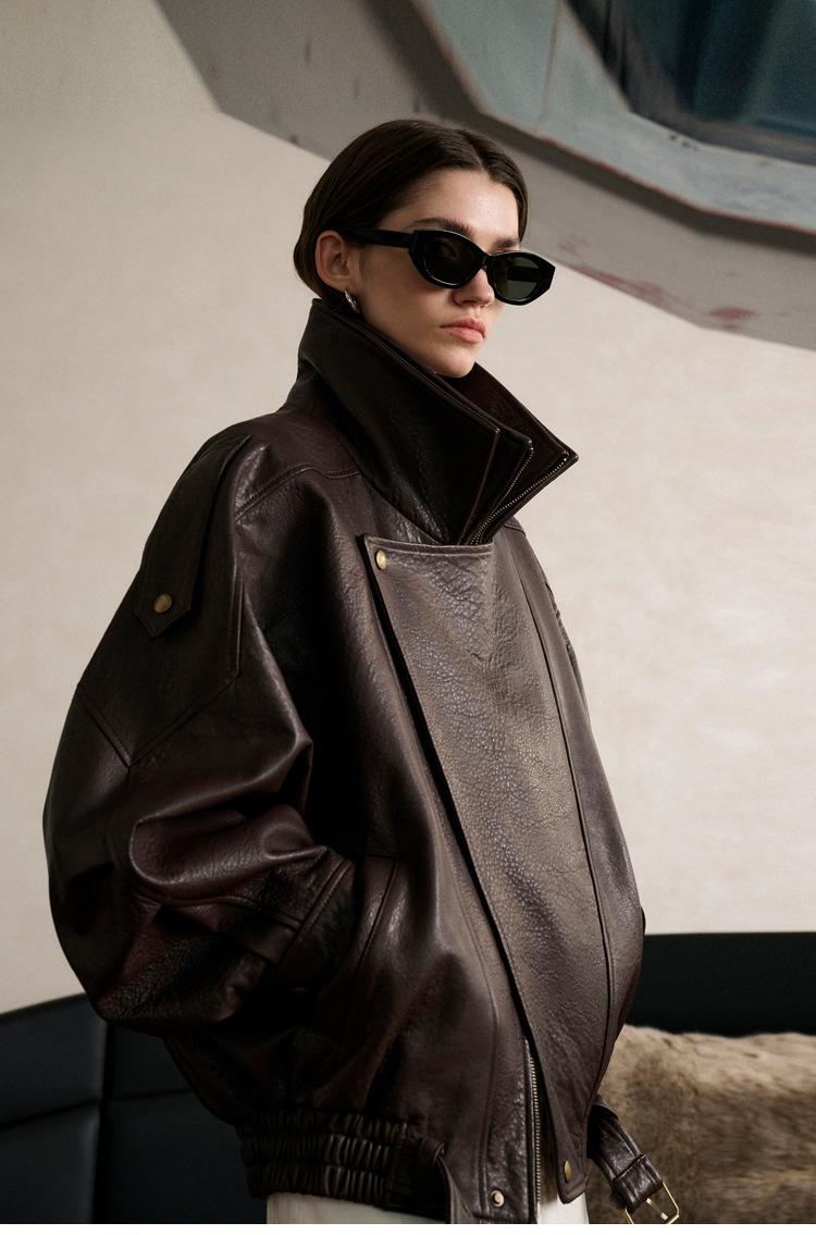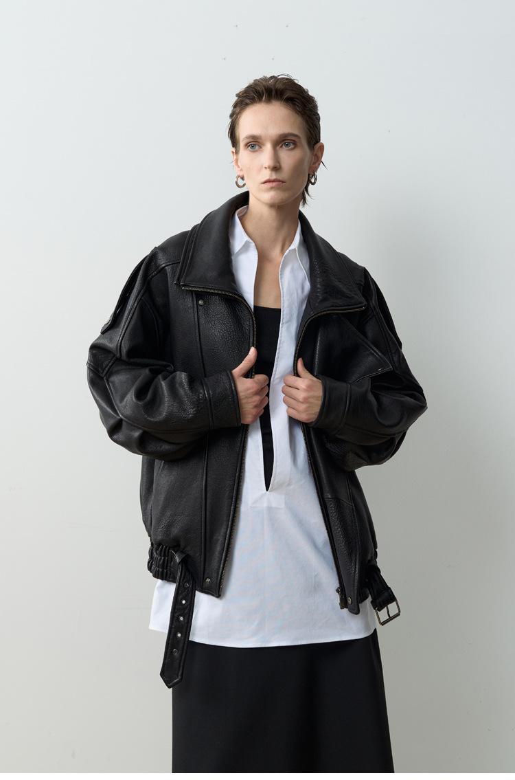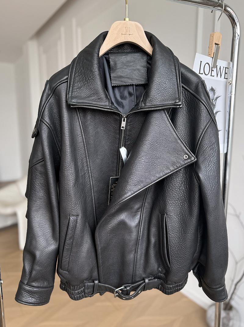 Yang Shulin Y * L Abrigo de Cuero de Otoño para Mujer Holgado Perfil Retro Industria Pesada Cuero de Cordero Burbuja Chaqueta de Aviador