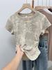 Camiseta de algodón de verano estilo retro americano de manga corta para mujer, nueva camiseta de 2024 con hombros descubiertos, ajustada, dulce y sexy.