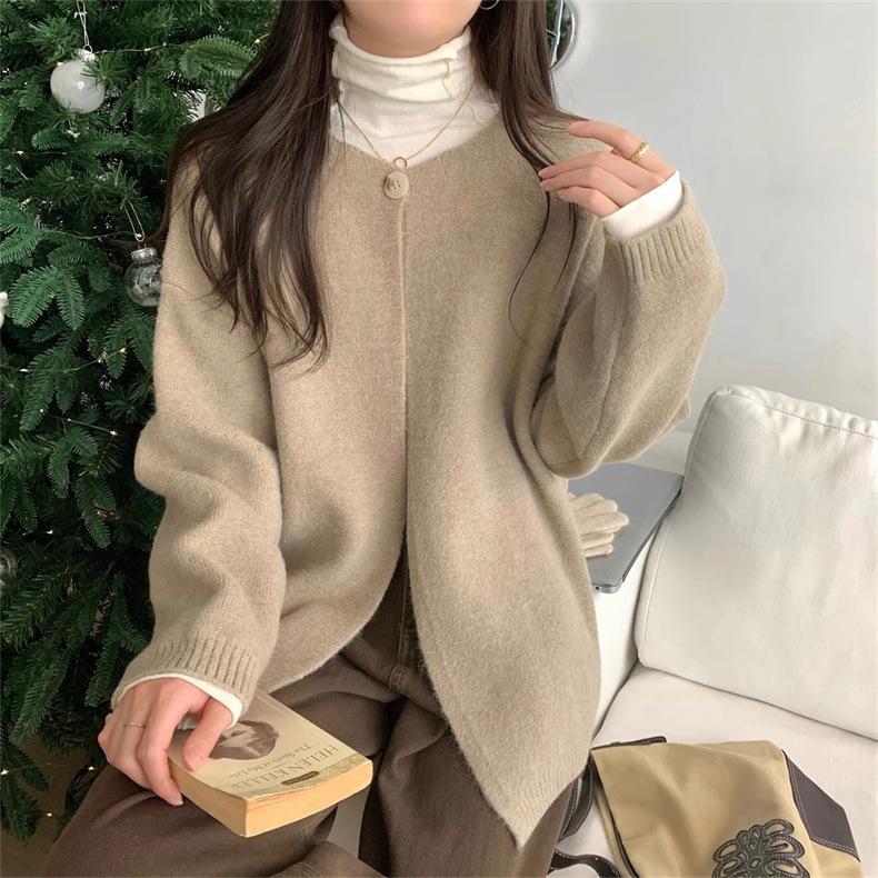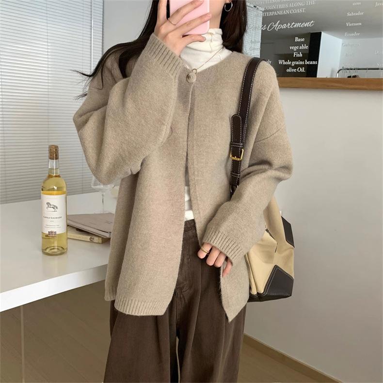 2025 Nuevo Otoño e Invierno Estilo Perezoso Suéter de Cuello Redondo Chaqueta para Mujer Estilo Coreano Suelto y Versátil Cárdigan Tejido de Un Botón Moderno