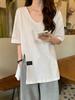 Camiseta de Algodón para Mujer Diseño de Manga Corta Nicho 2024 Nuevo Verano Suelta Irregular con Abertura Top de Largo Medio