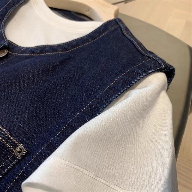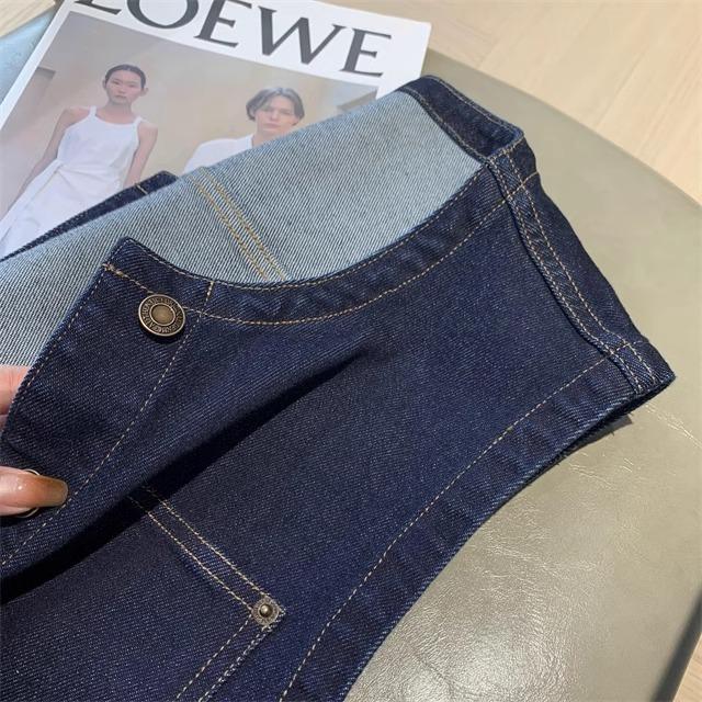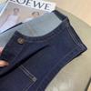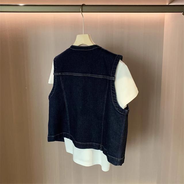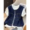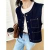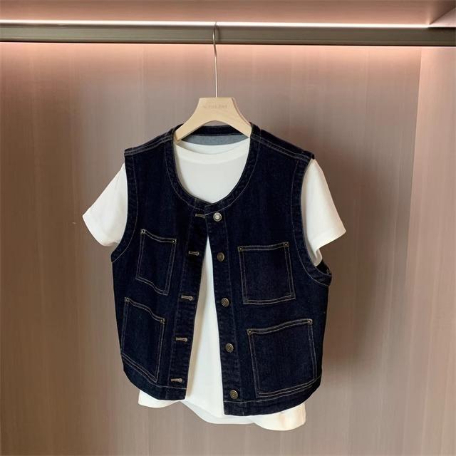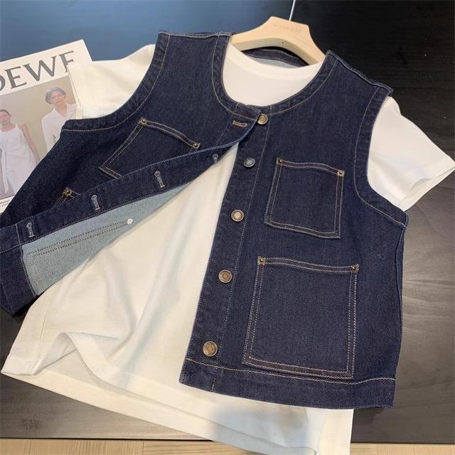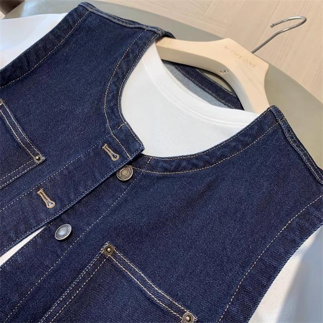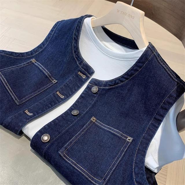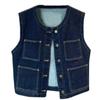 Chaleco de mezclilla corto vintage azul oscuro de cuello redondo para mujer, verano, apilado, combinable con todo, sin mangas, chaleco