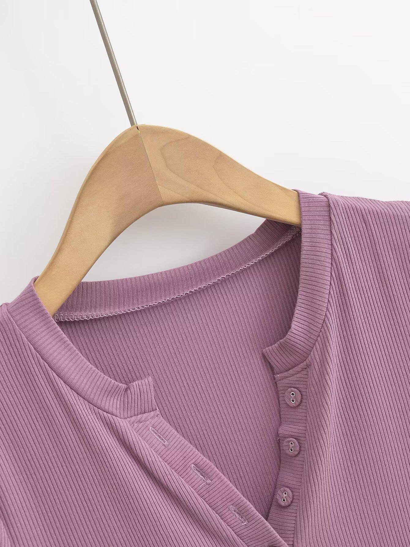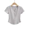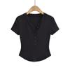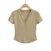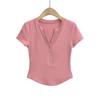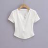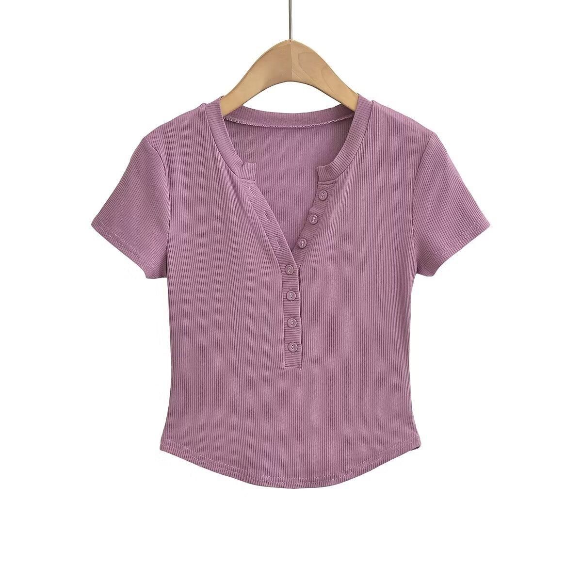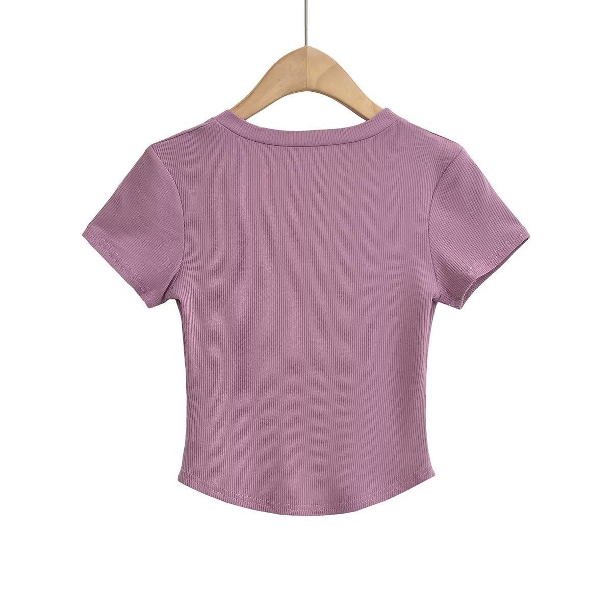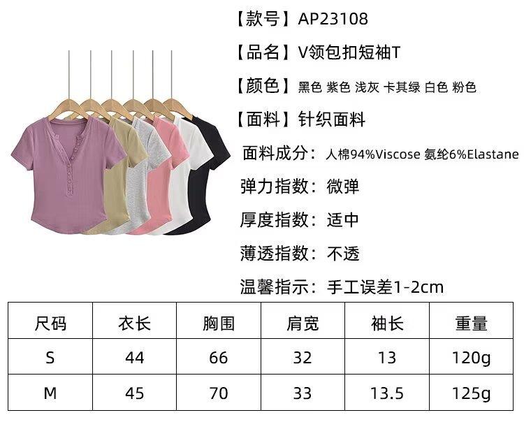 AP23108 Otoño Nuevo Estilo Europeo y Americano Cuello en V Bolso Hebilla Dobladillo Curvo Color Sólido Estilo Simple Camiseta de Manga Corta Entallada