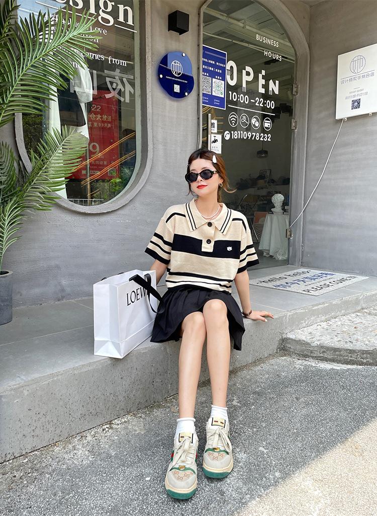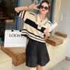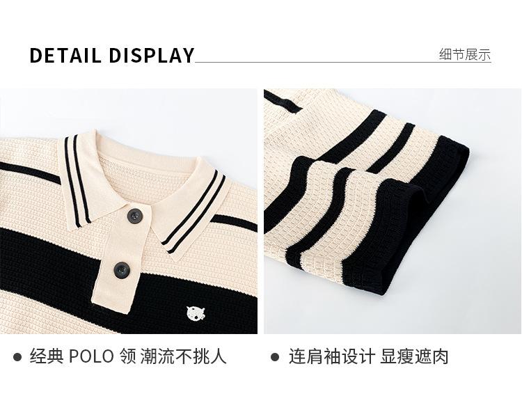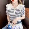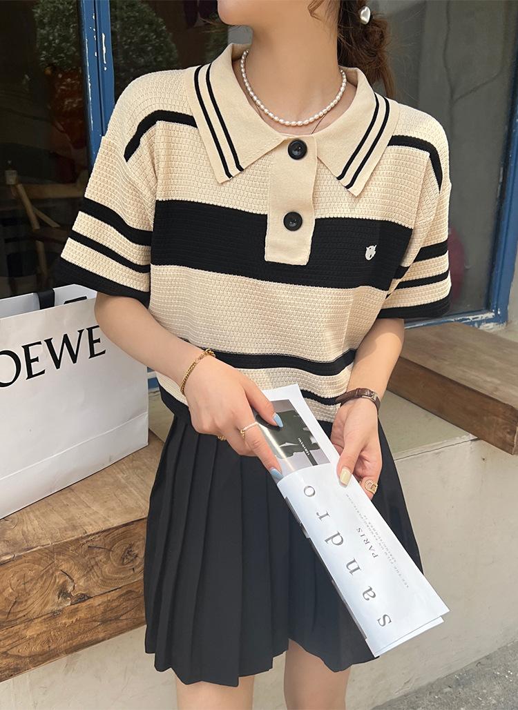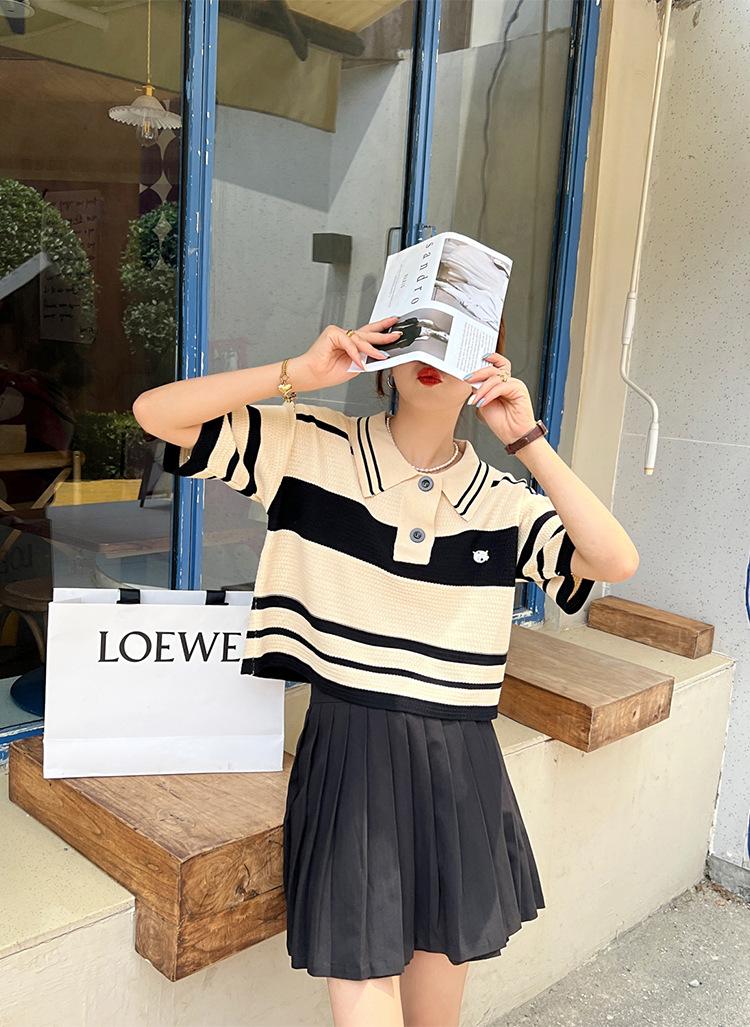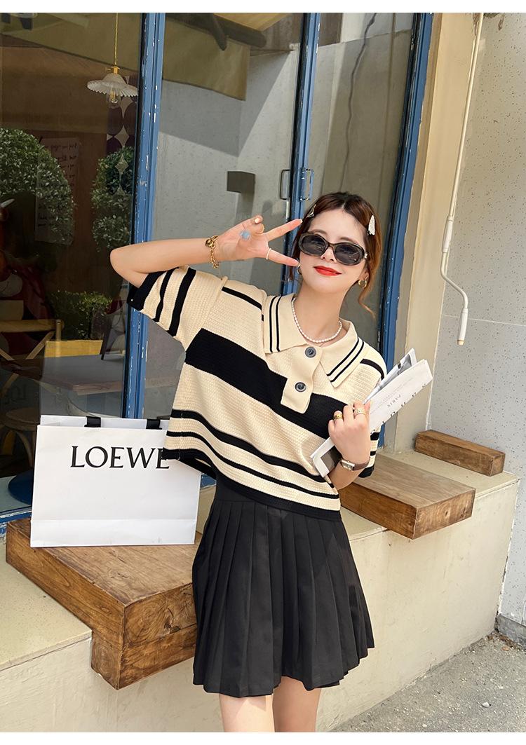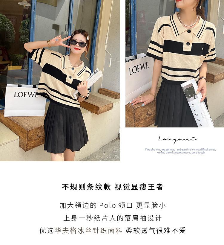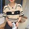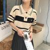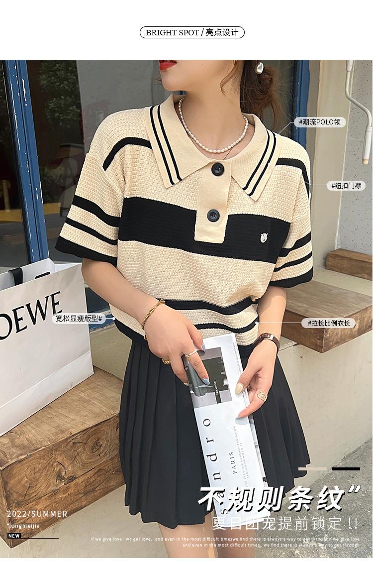Suéter a rayas con cuello polo, camiseta de manga corta para mujer, diseño fino y holgado, de verano, para adelgazar.