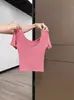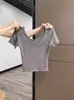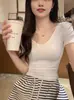 Camiseta de punto elástica de manga corta para mujer, estilo coreano, con cuello en U, cintura ajustada y combinación de colores dopamina.