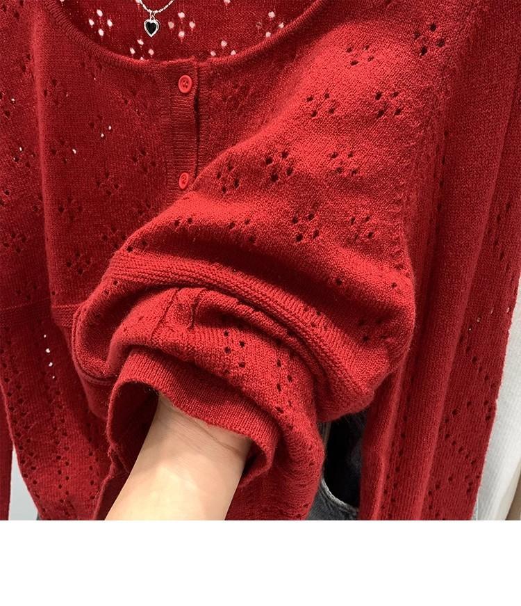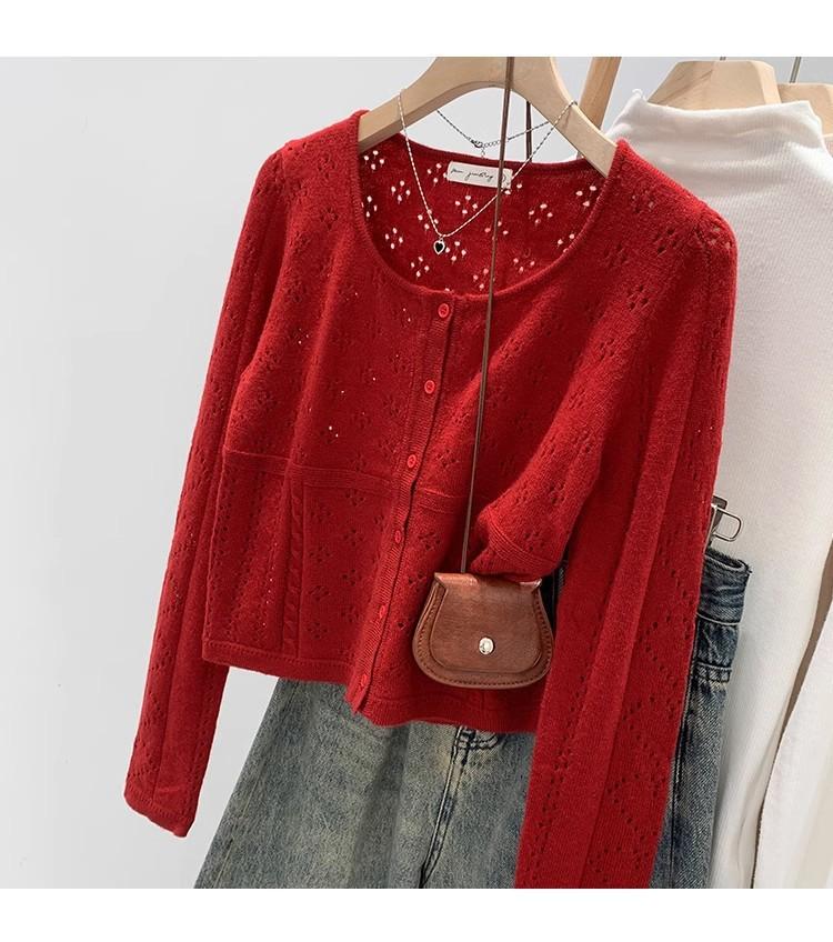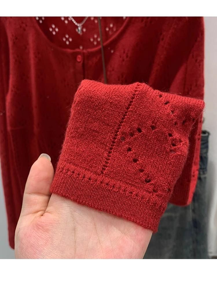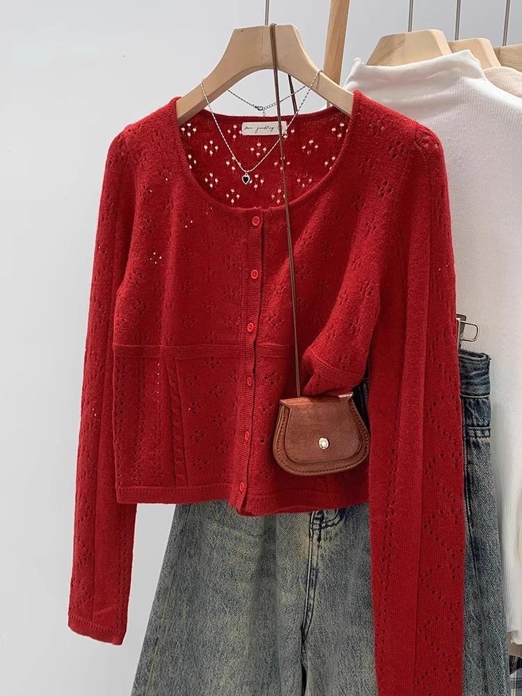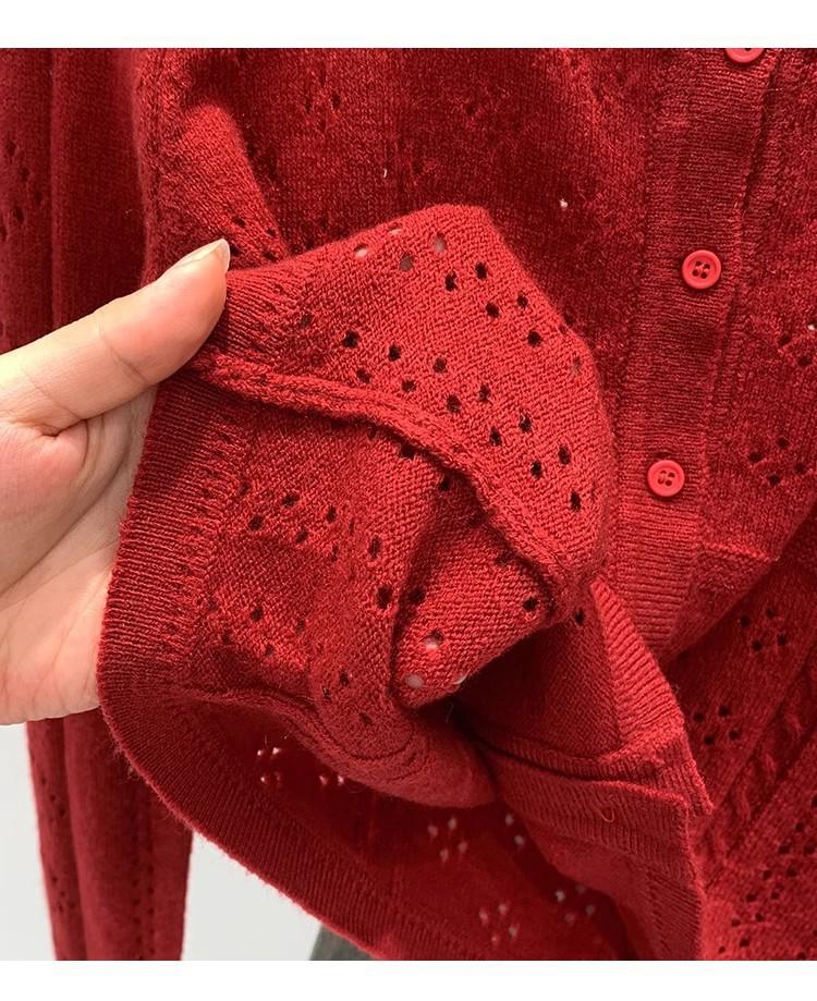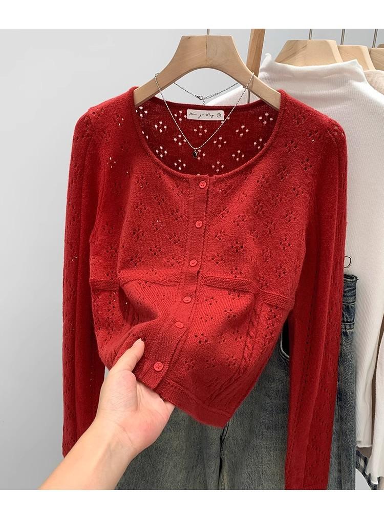 Chaqueta tipo cárdigan de punto exterior, fina, hueca, estilo Hong Kong, vintage, de color rojo, con protección solar, para mujer, estilo holgado de principios de otoño, top corto