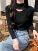 Top Básico de Punto de Manga Larga con Cuello Alto para Principios de Otoño, Elegante y Sofisticado, Suéter Calado Negro para Mujer, Otoño e Invierno