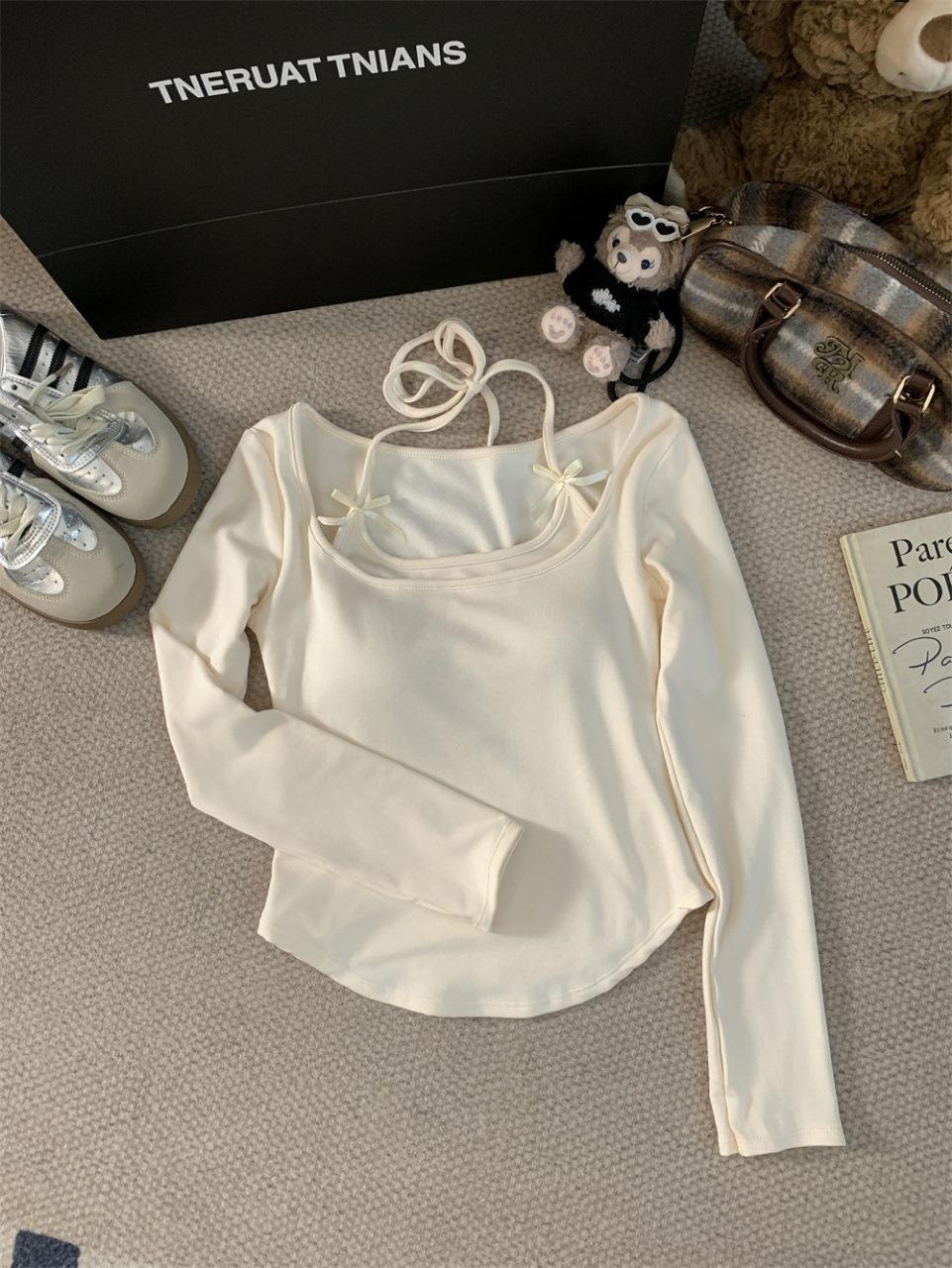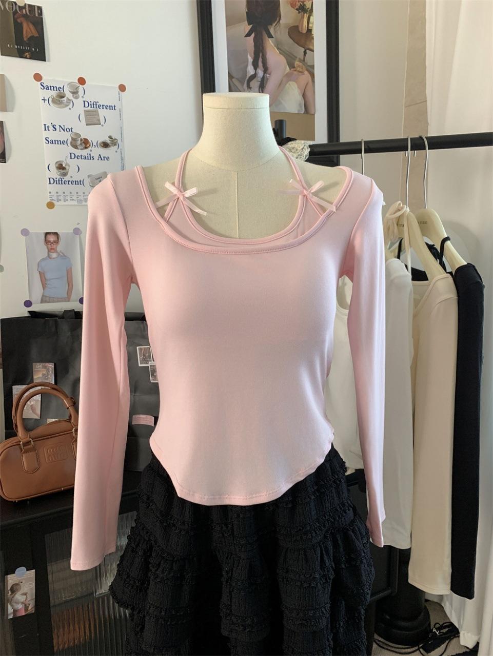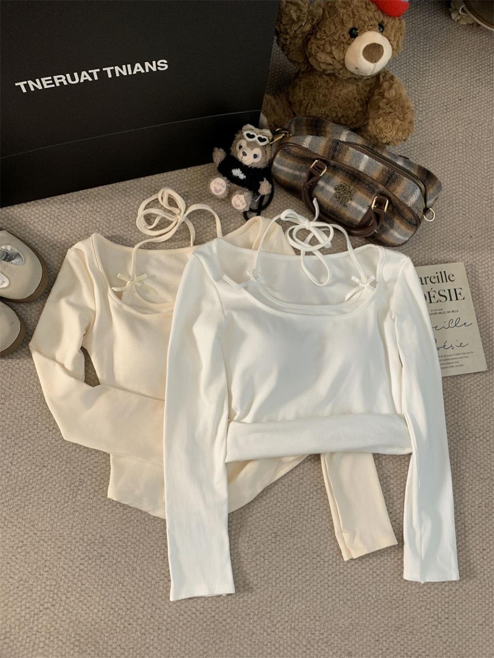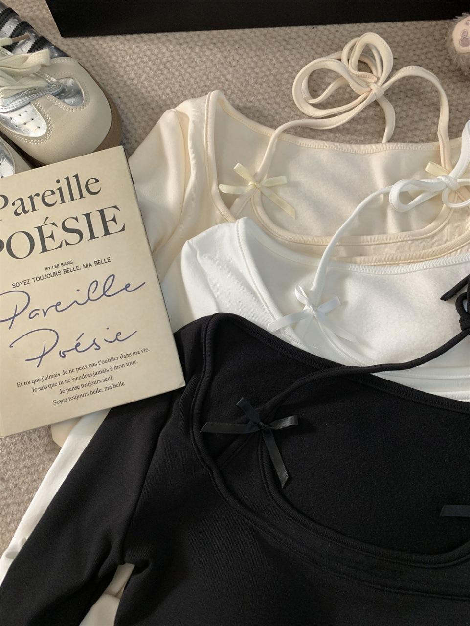 Camiseta de manga corta de otoño para mujer, nueva, de dos piezas, con cuello colgante y lazo en los hombros, sexy y ajustada.