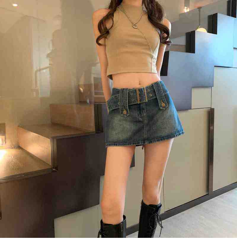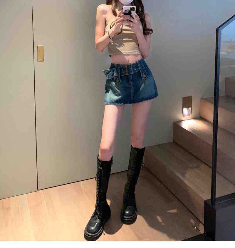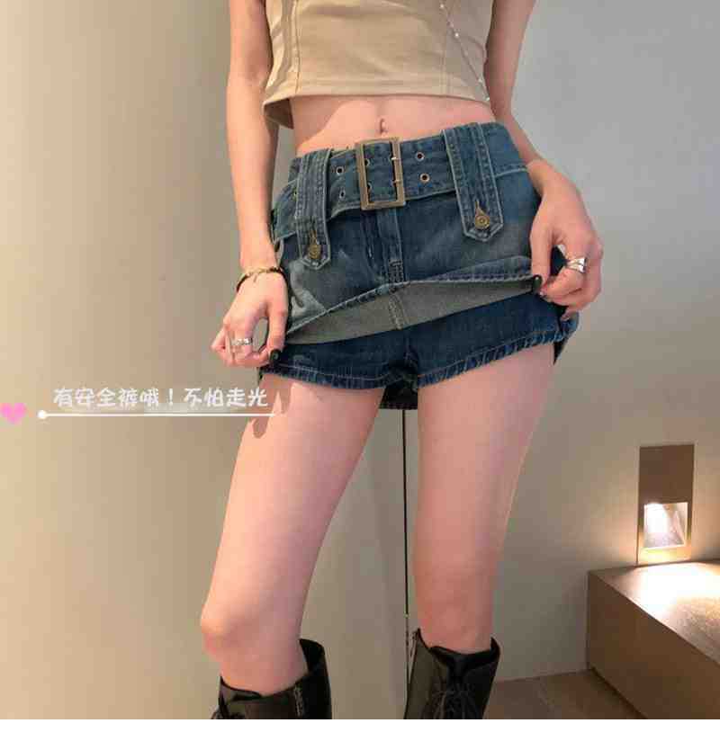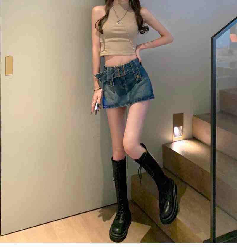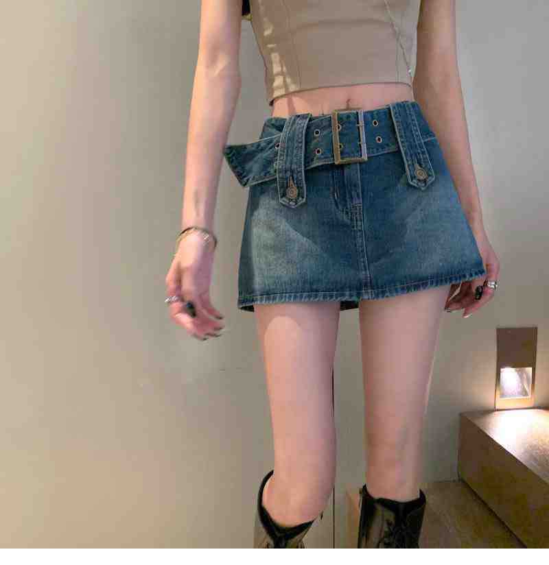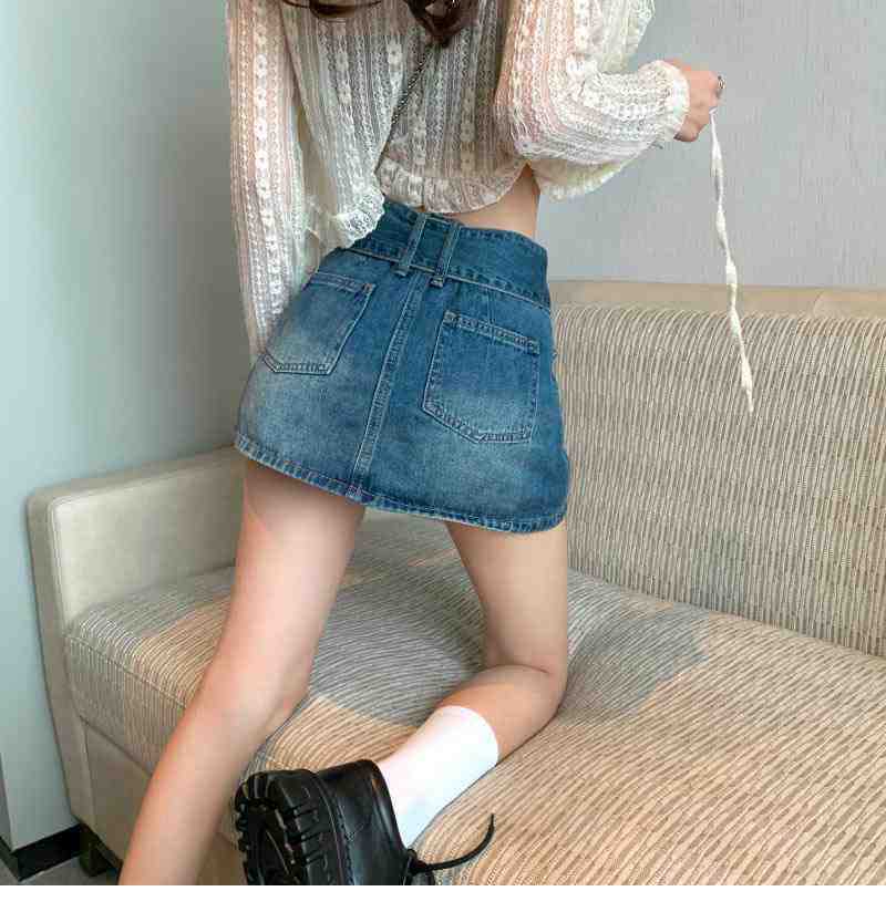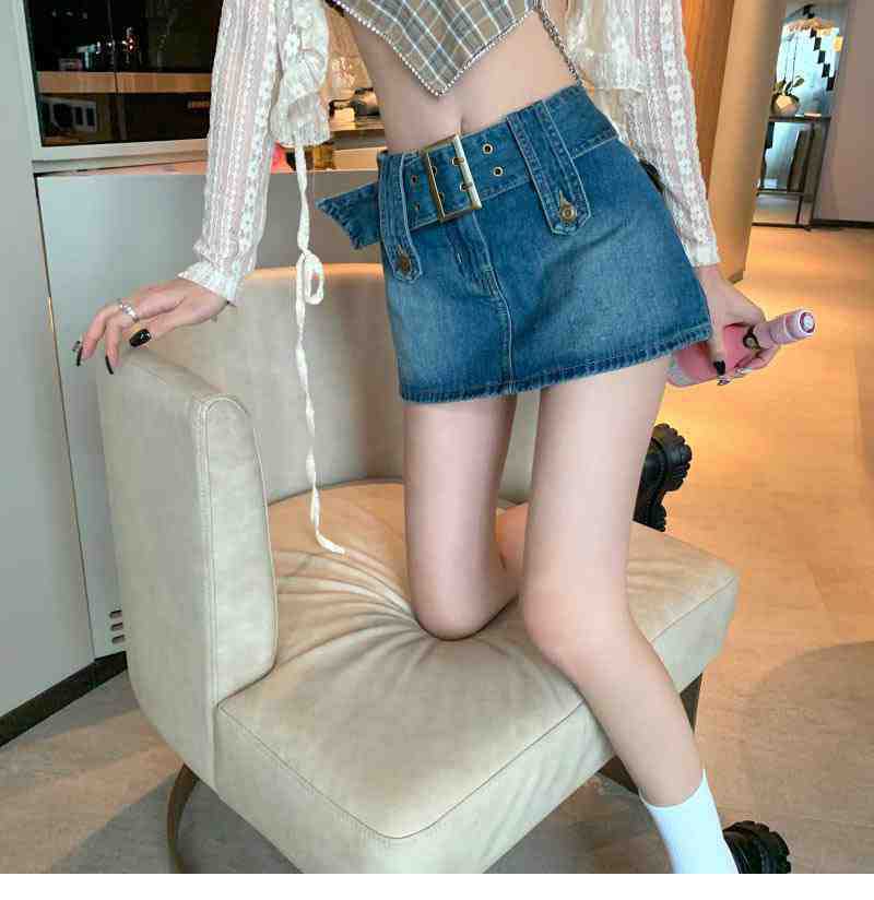 Falda de Mezclilla Azul Vintage para Mujer Primavera y Otoño Caliente Sexy Falda de Cadera Pequeña Cintura Alta Línea A Pantalones Cortos