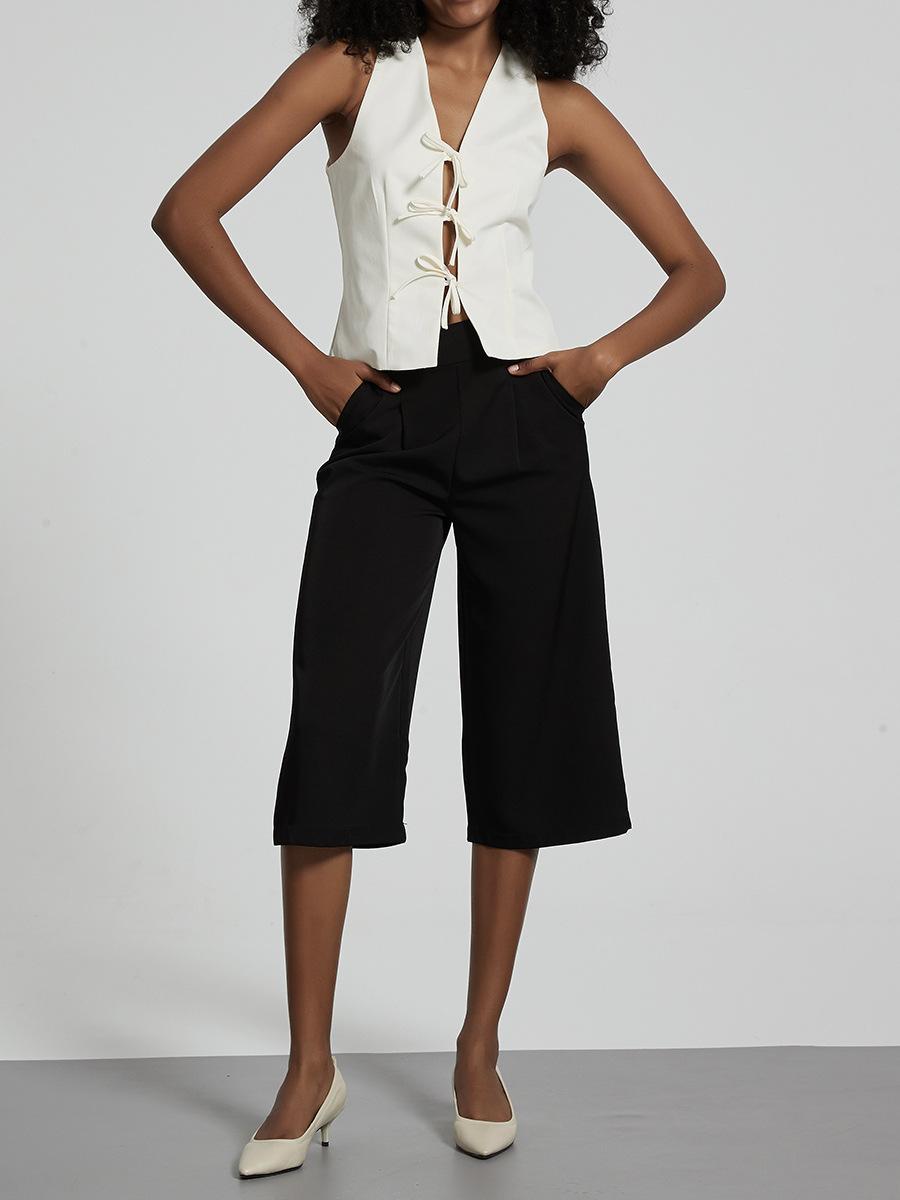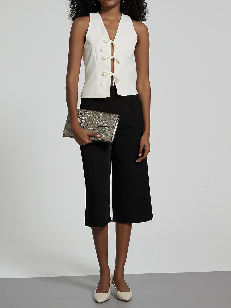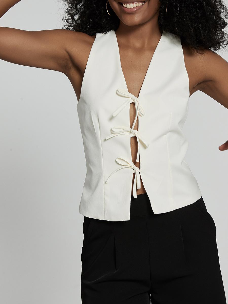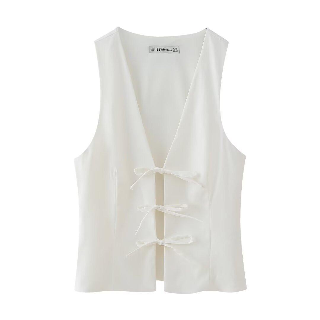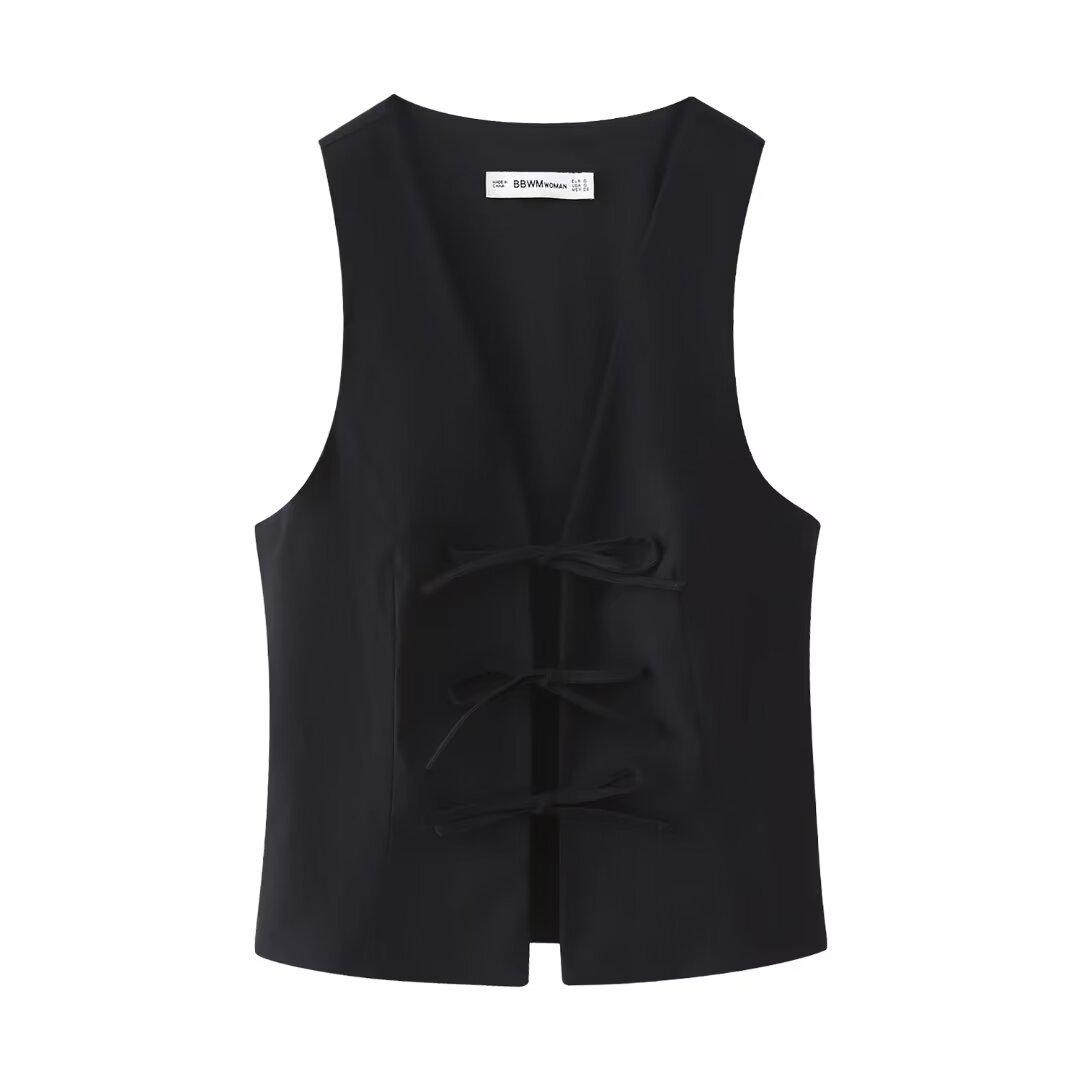 Venta al por mayor de ropa de mujer transfronteriza, chaleco ajustado con pajarita de estilo europeo y americano, top de verano sin mangas con cuello en V, chaleco de moda