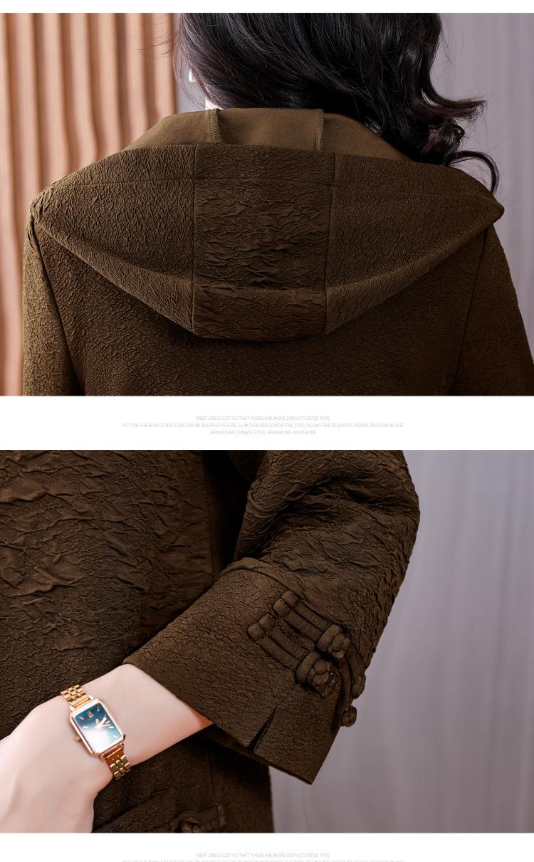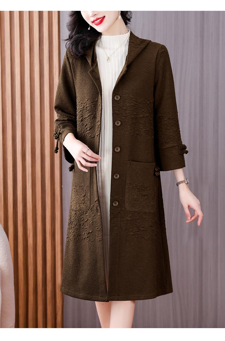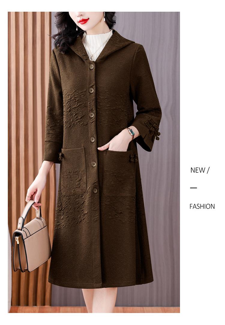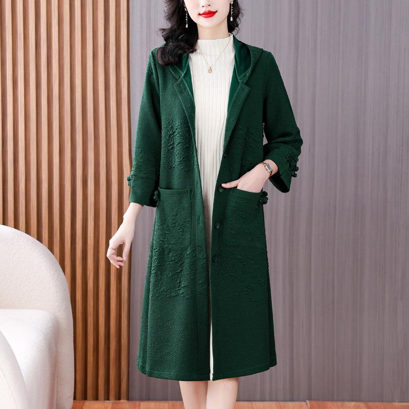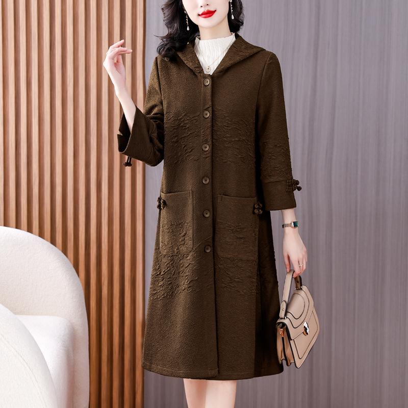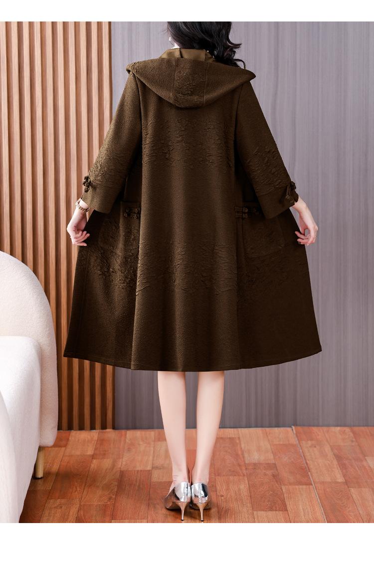 Abrigo holgado de talla grande con capucha para mujer, otoño e invierno 2024, nuevo abrigo vintage con hebilla de jacquard, largo medio, color liso