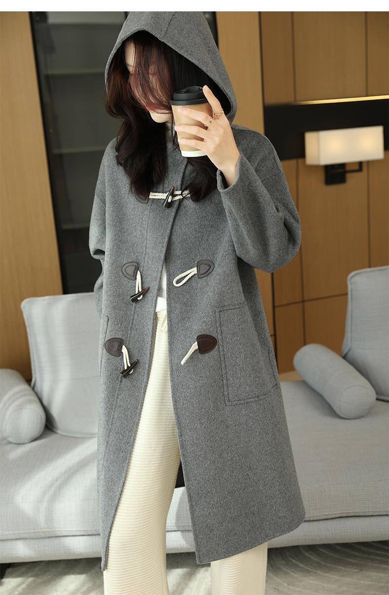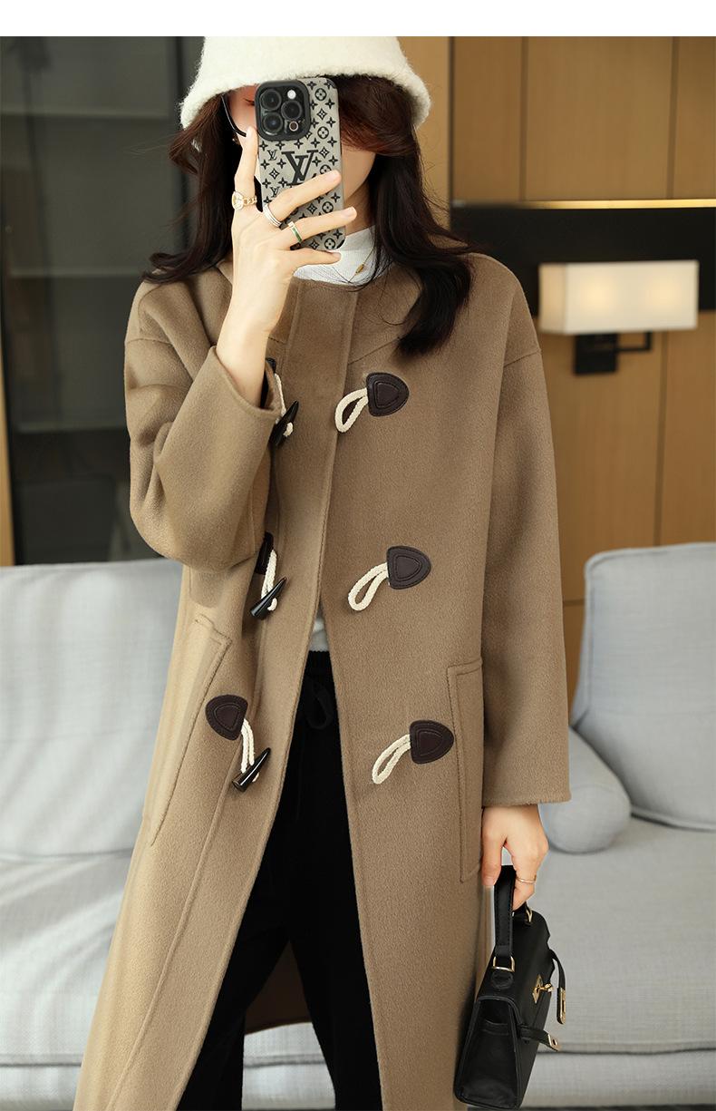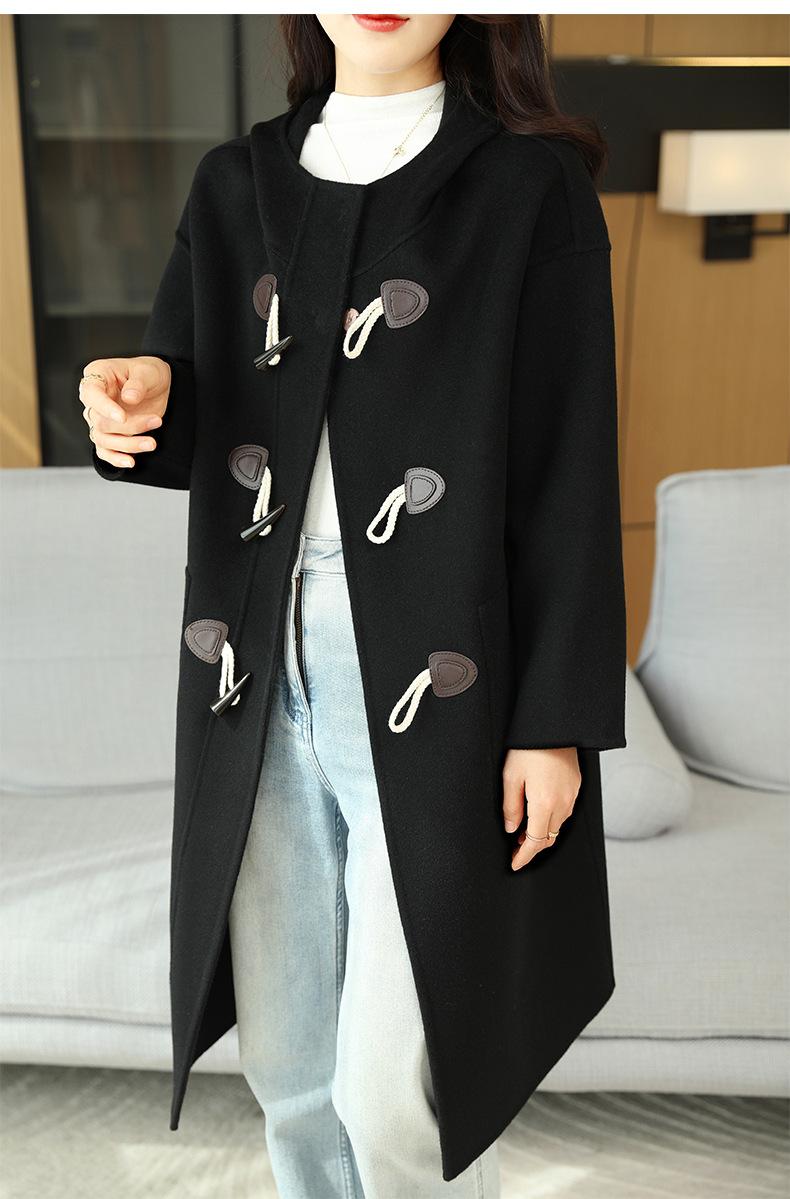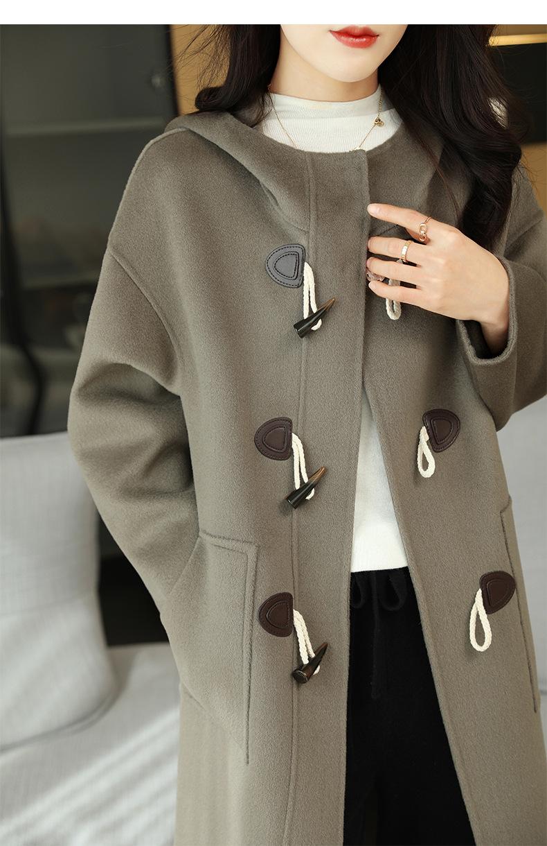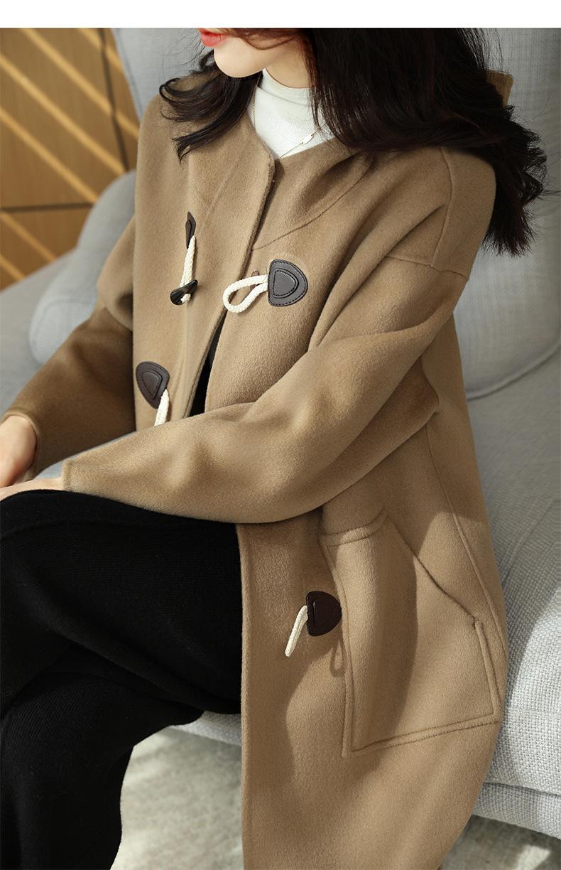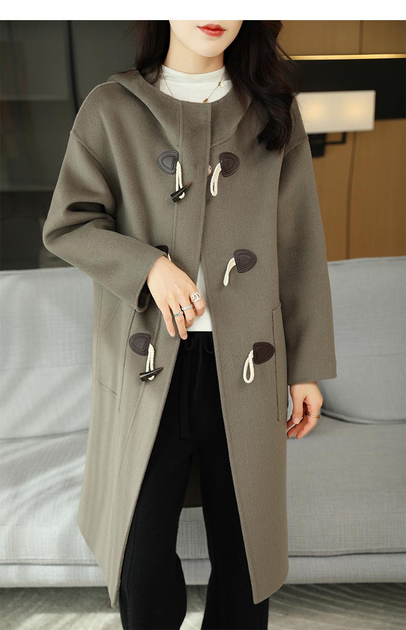 Chaqueta de lana con capucha y hebilla de doble cara para mujer, nueva moda de otoño e invierno, con capucha por encima de la rodilla, elegante abrigo de lana