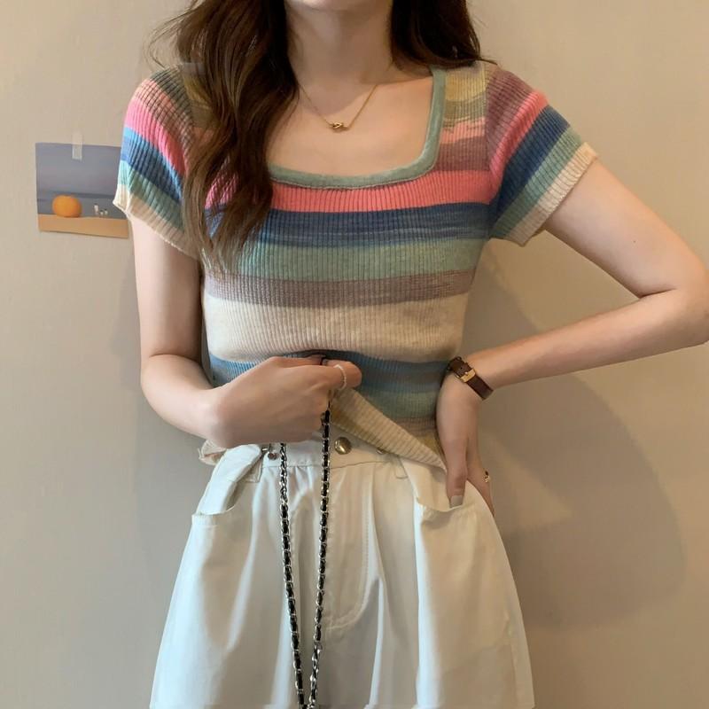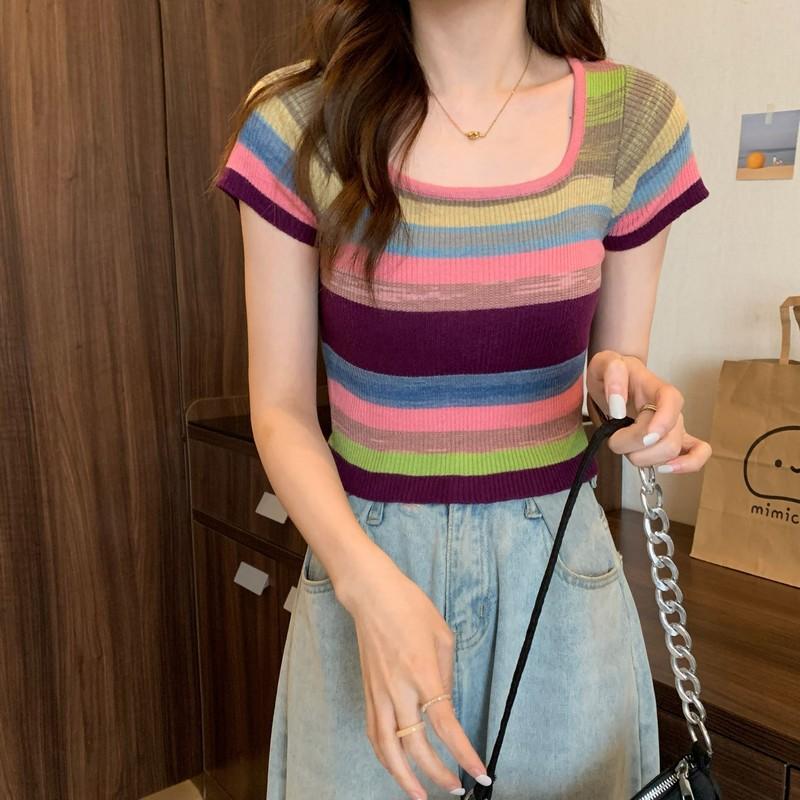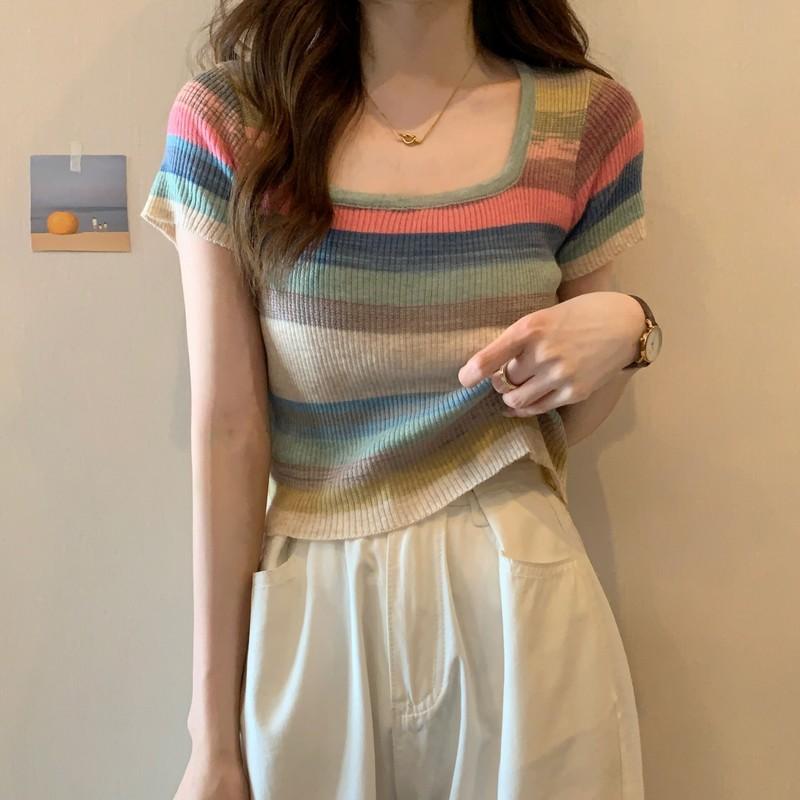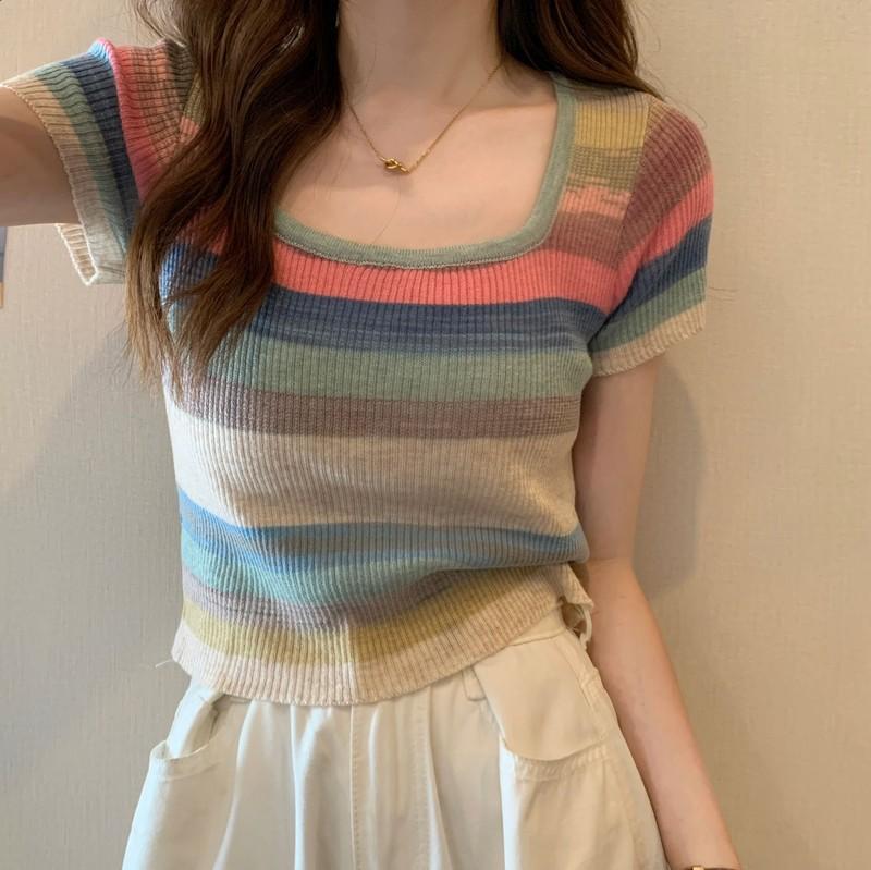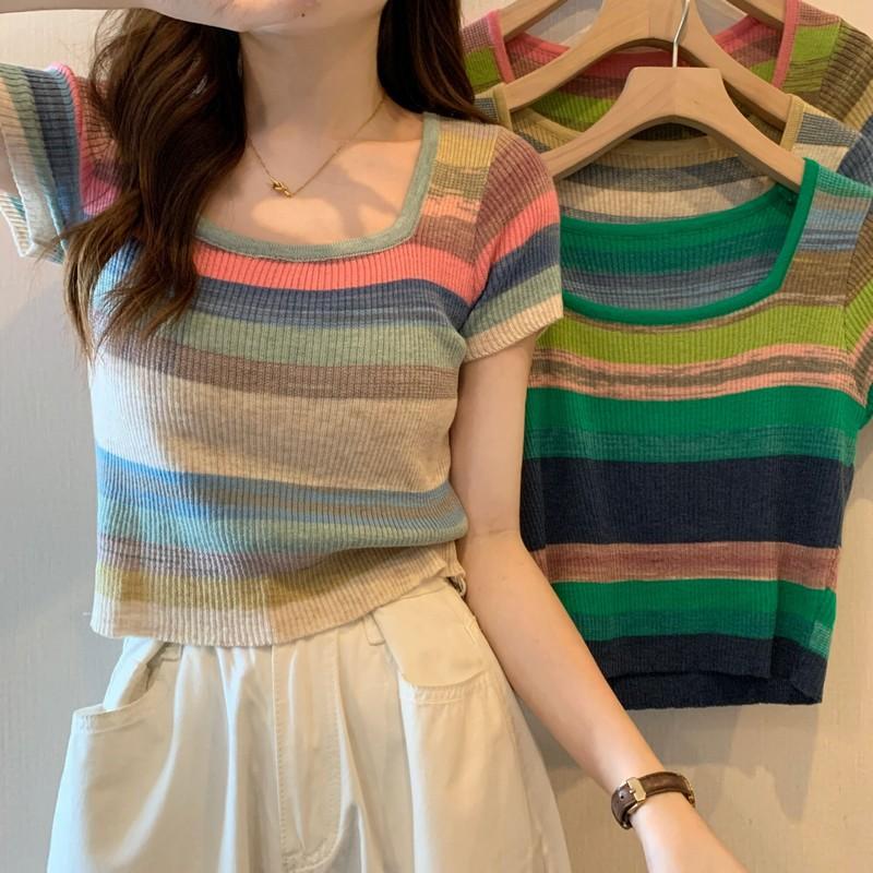 Camiseta de rayas con cuello cuadrado para mujer, camisa de punto de seda helada de verano, manga corta francesa, corte entallado y estilo Pure Desire.