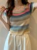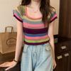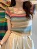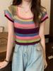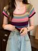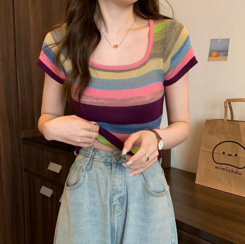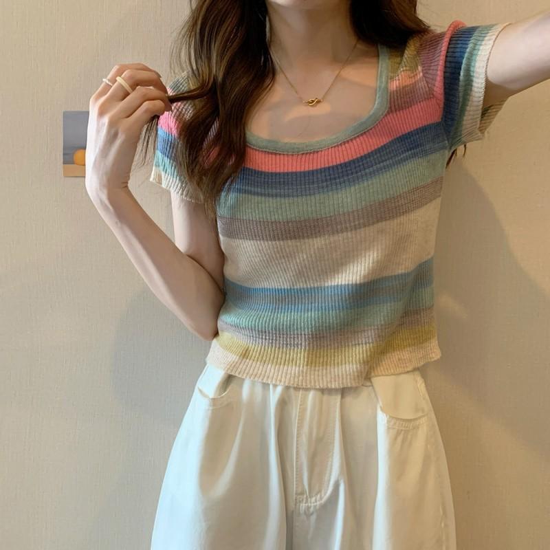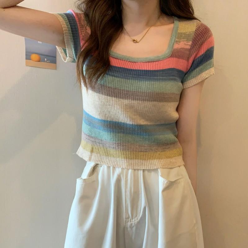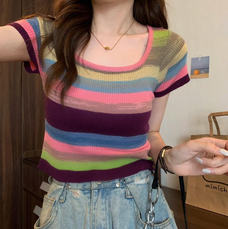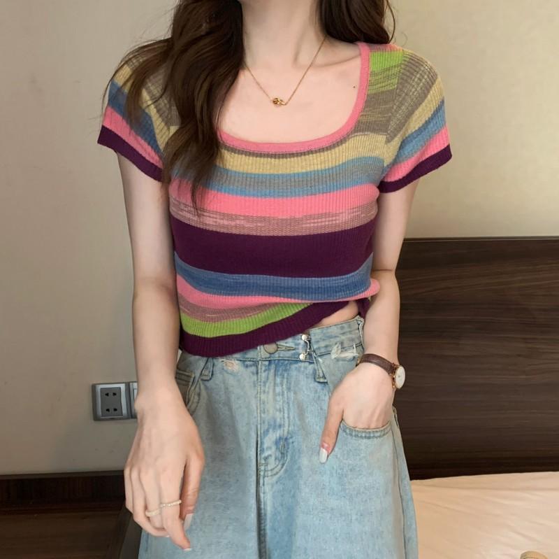 Camiseta de rayas con cuello cuadrado para mujer, camisa de punto de seda helada de verano, manga corta francesa, corte entallado y estilo Pure Desire.