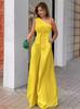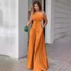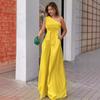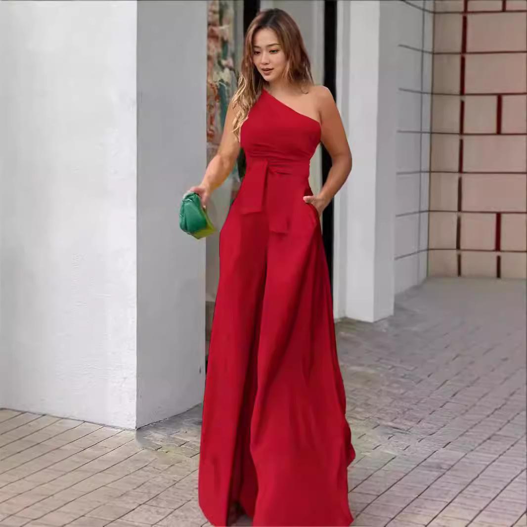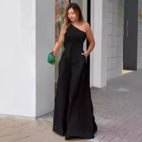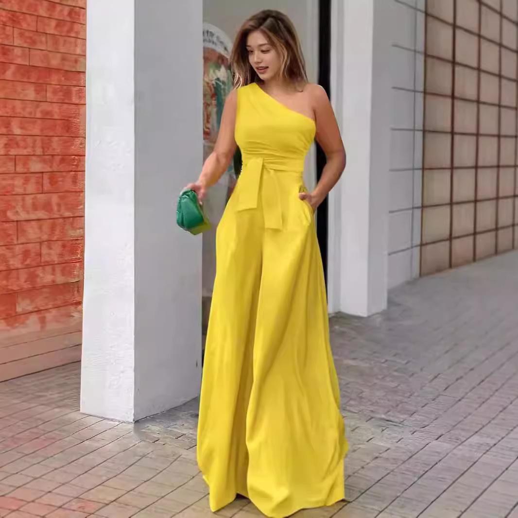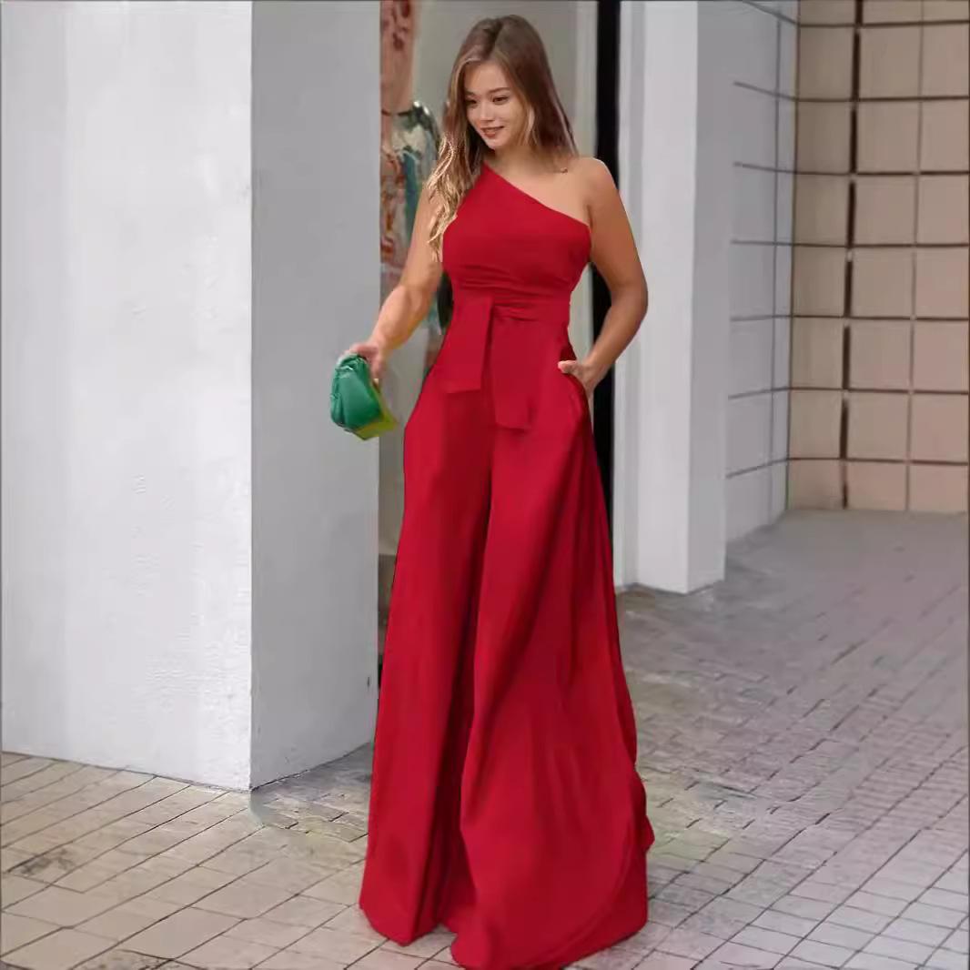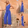 Pantalones casuales de verano 2024 para mujer europea y americana con cuello oblicuo, cordones unilaterales, hombros irregulares, cintura alta, bolsillo y pierna ancha